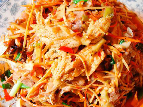 里面一层卷着炒得香喷喷的精选花生加香而微辣的肉丝炒辣椒,有的还加上一点黄瓜丝和豆芽。