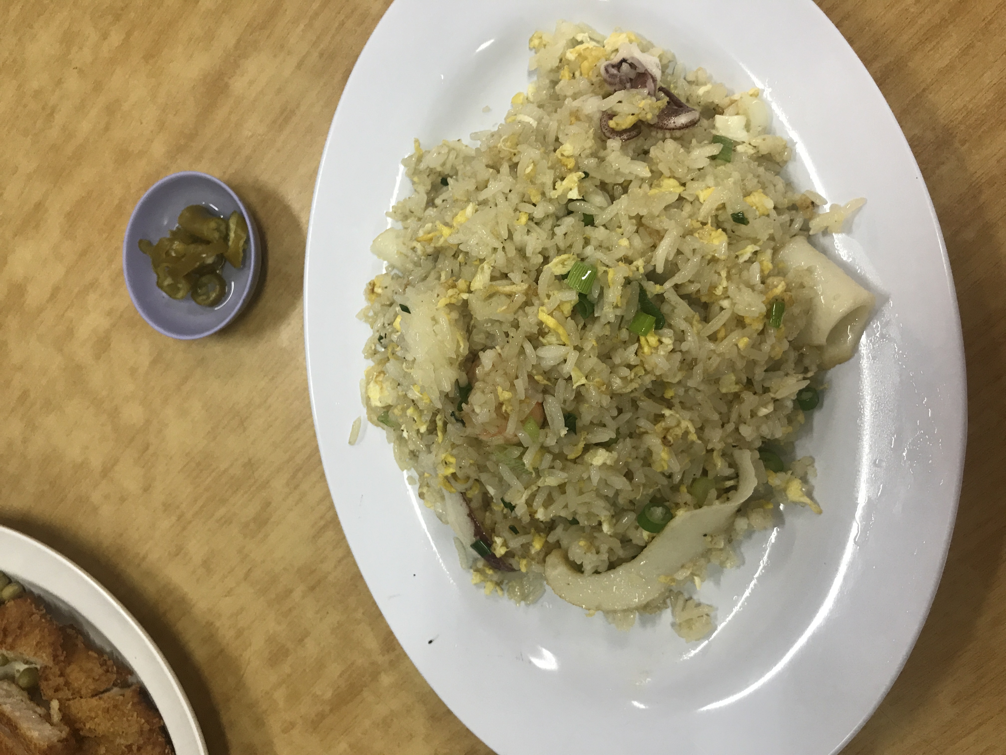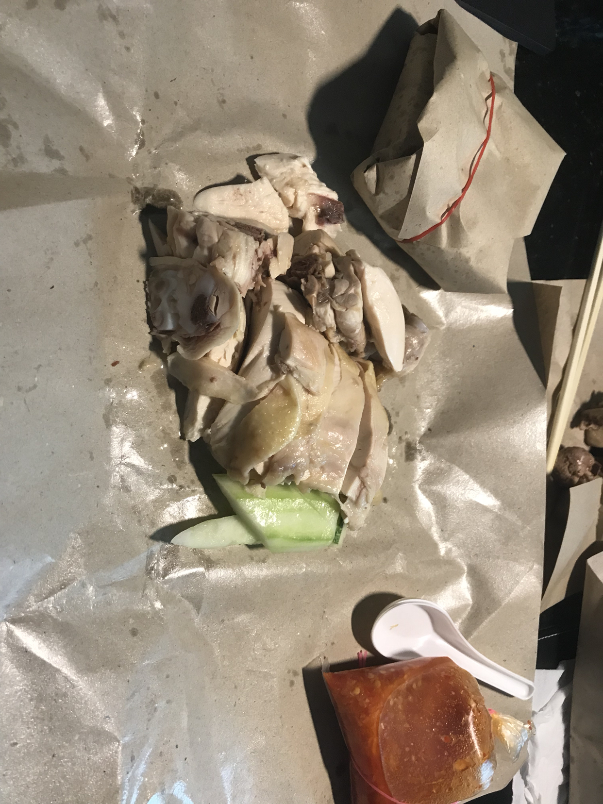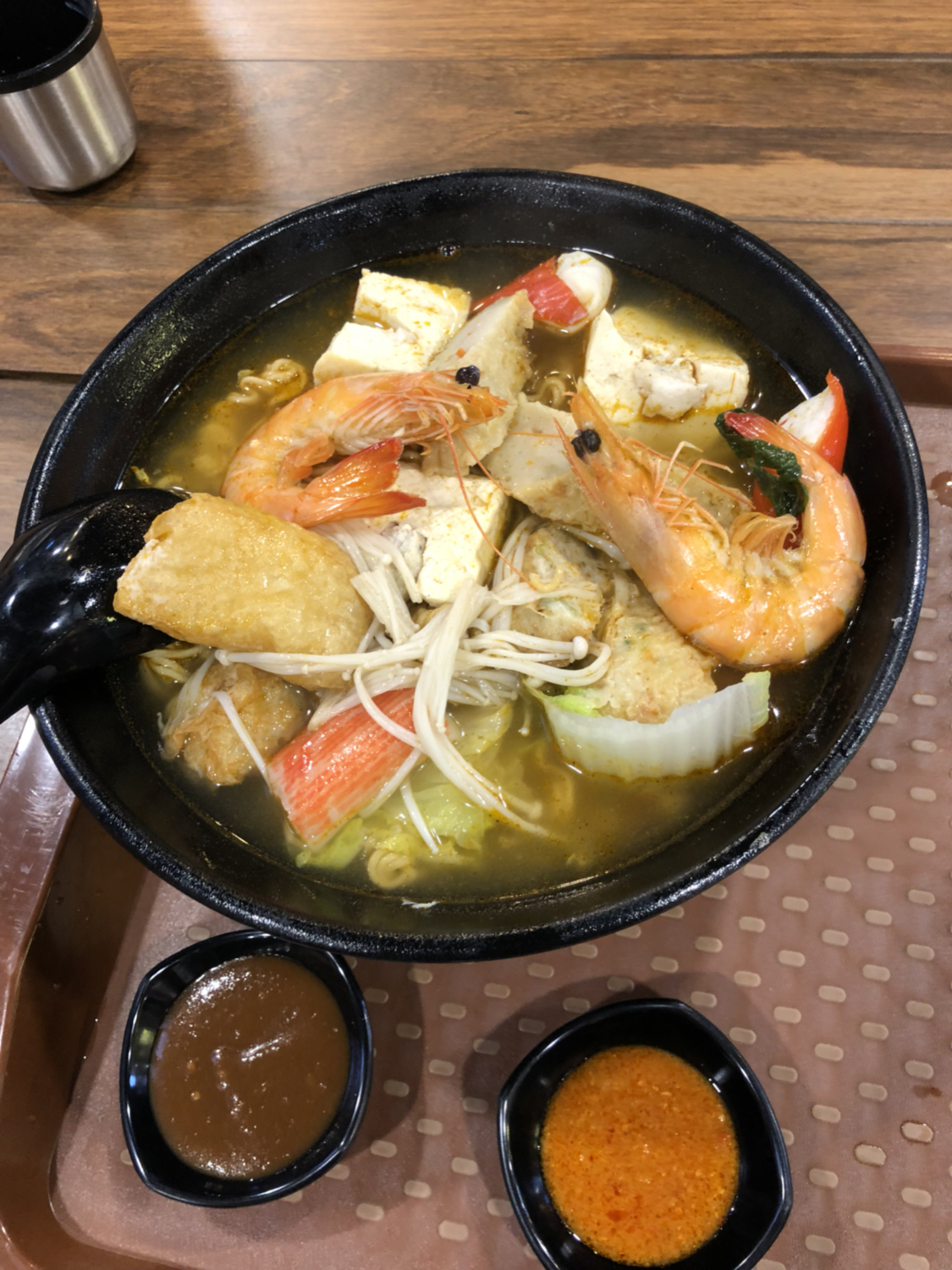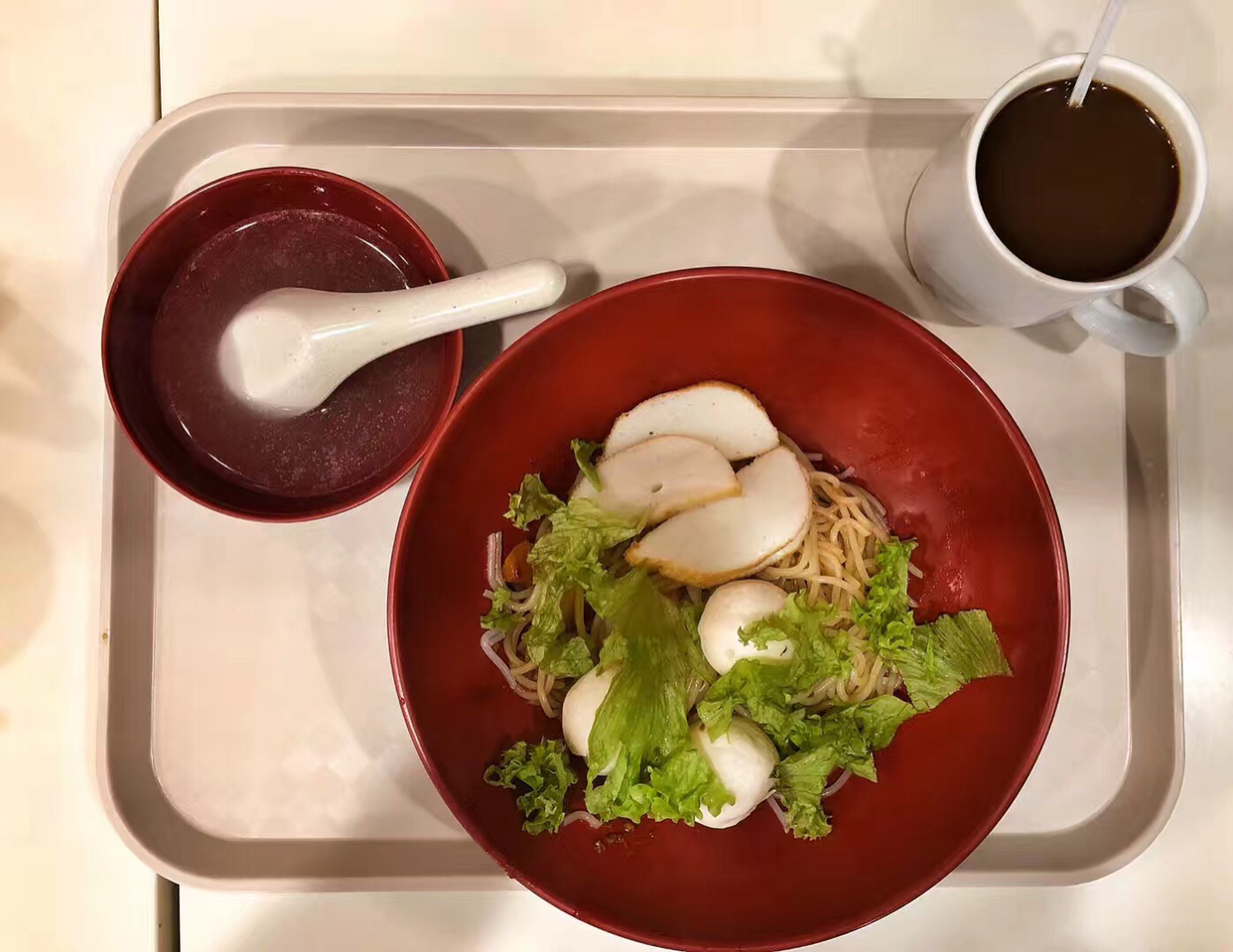 这算是马来菜,是鸡肉面,有点像馄饨面的感觉,很大碗,而且汤量很足,可以看见我对面的碗,很大一个。味道可以不放辣椒,旁边瓶子里面是酱油,这个酱油和国内的不一样,没有那么咸,口感更甜,有点香;配菜是有点像韩国辣白菜的泡菜。