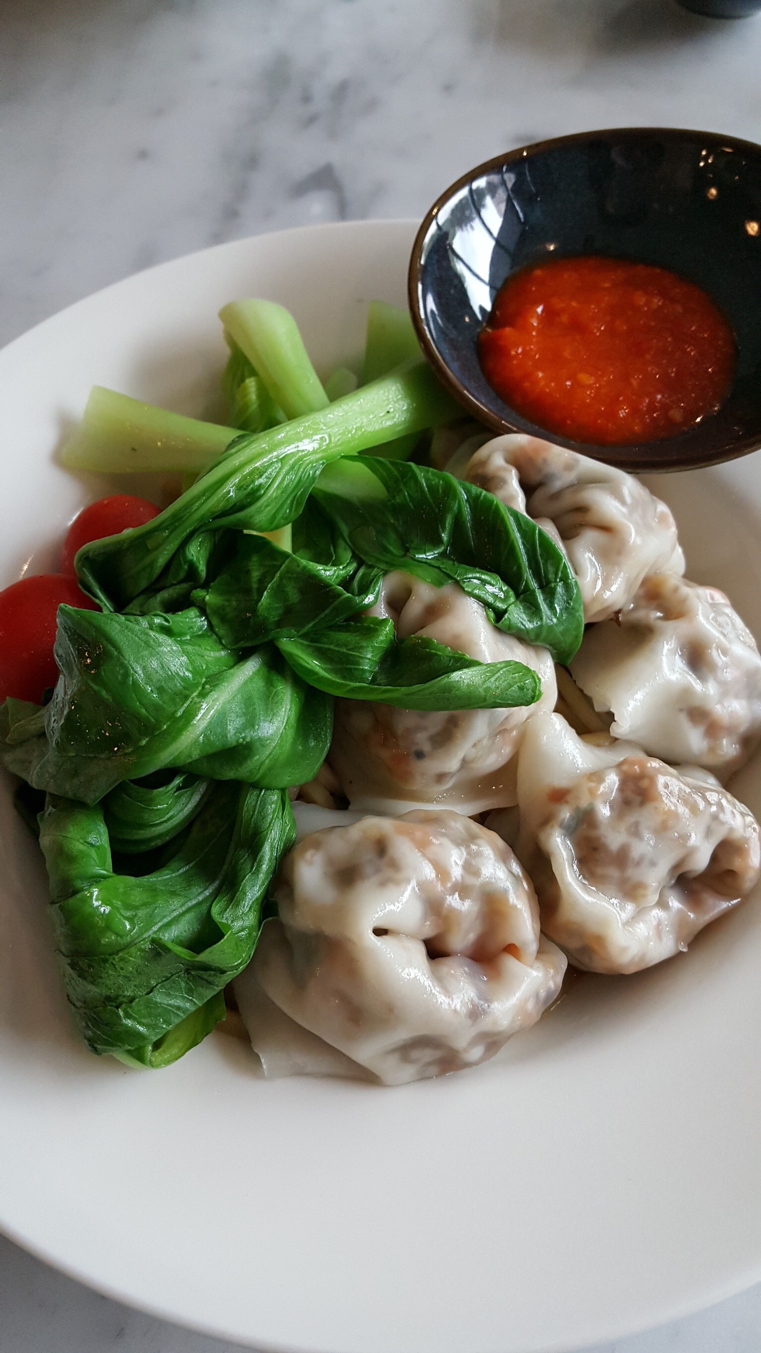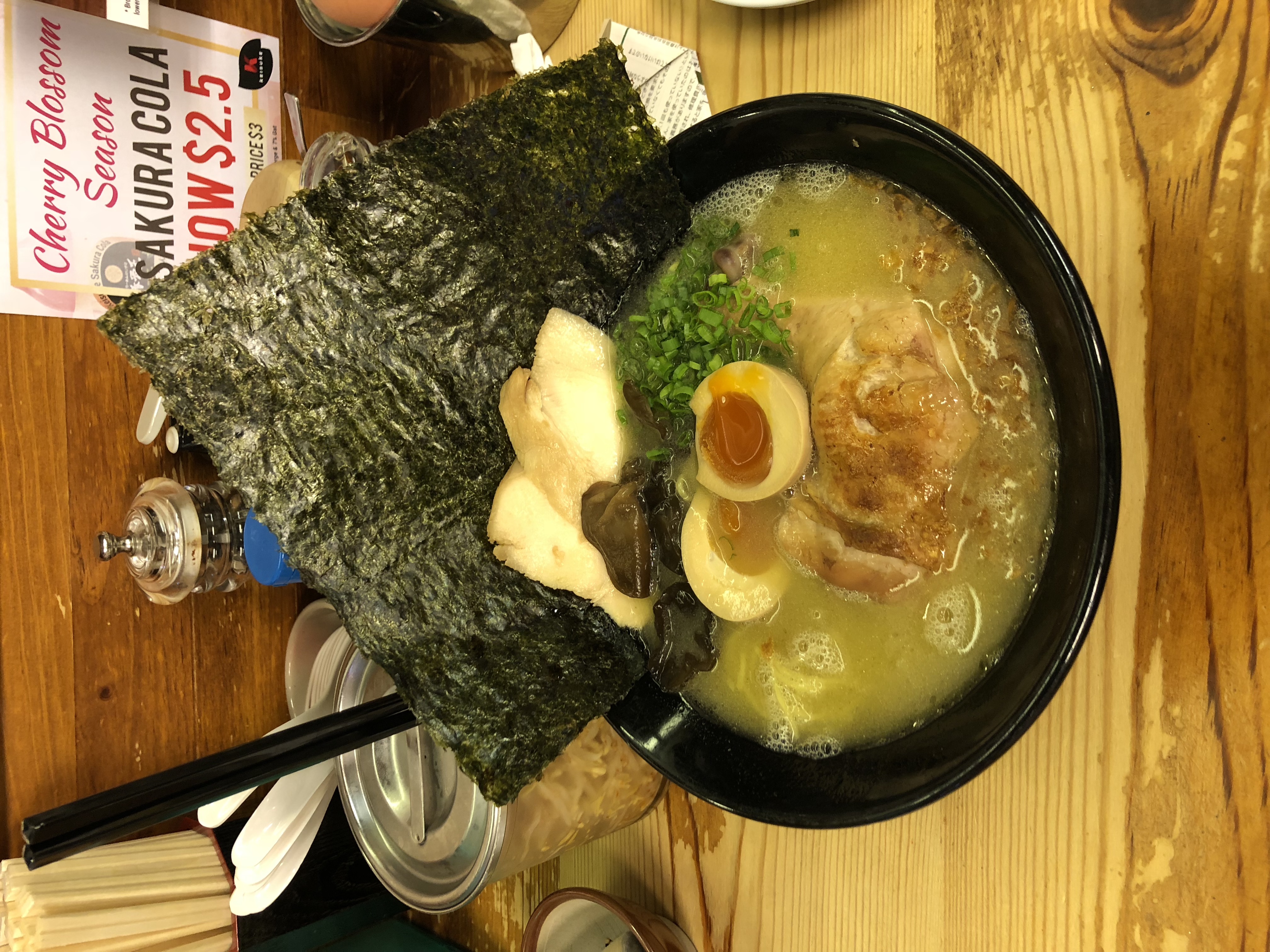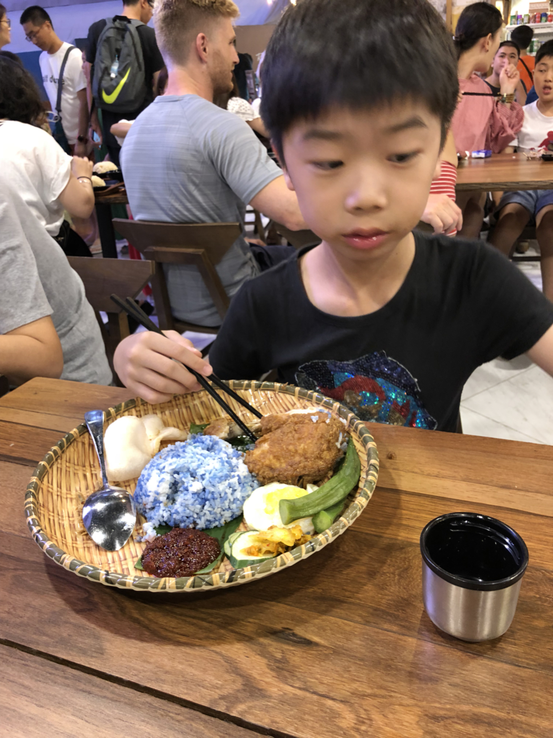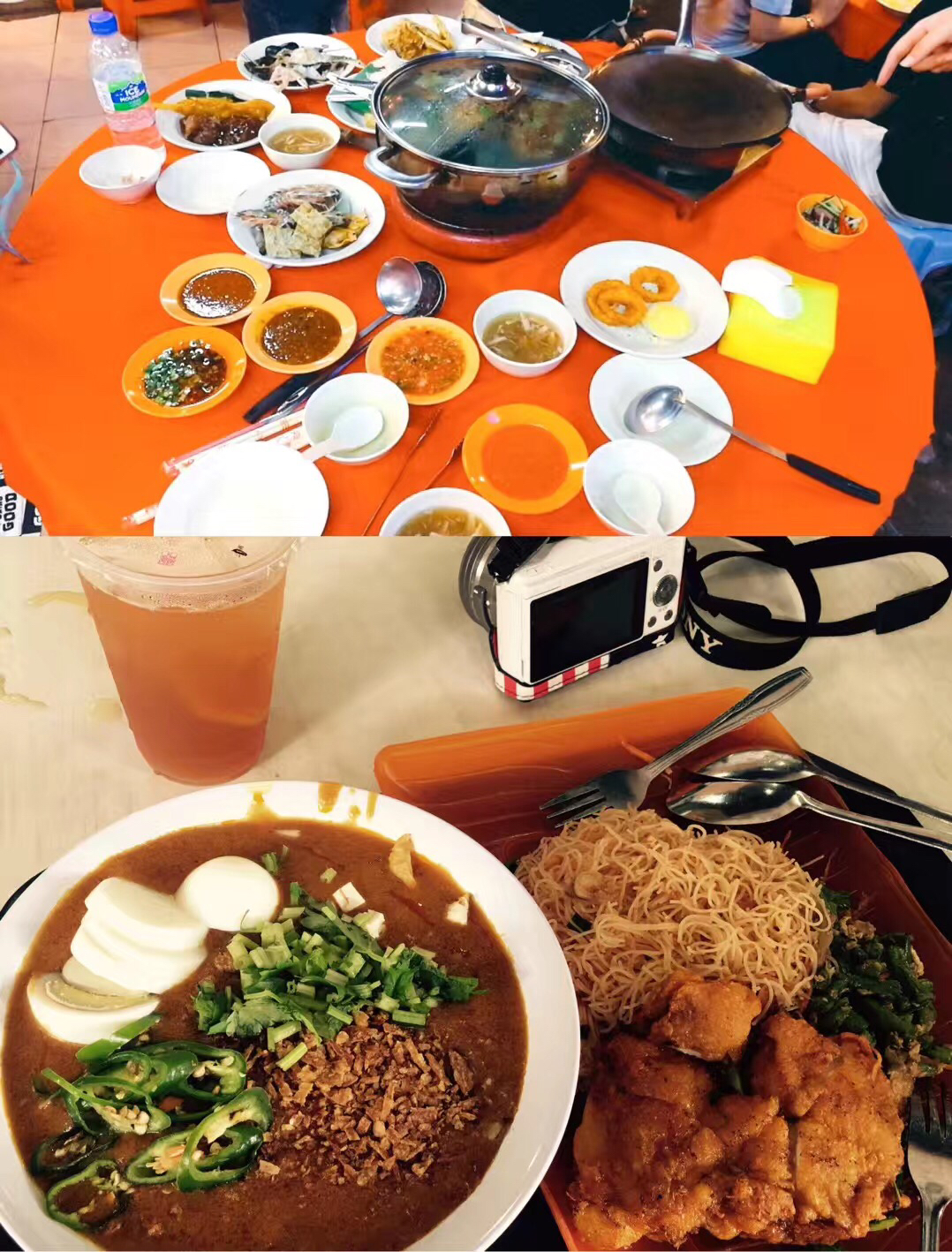 这算是马来菜,是鸡肉面,有点像馄饨面的感觉,很大碗,而且汤量很足,可以看见我对面的碗,很大一个。味道可以不放辣椒,旁边瓶子里面是酱油,这个酱油和国内的不一样,没有那么咸,口感更甜,有点香;配菜是有点像韩国辣白菜的泡菜。