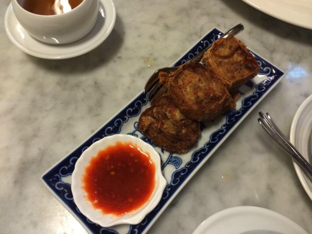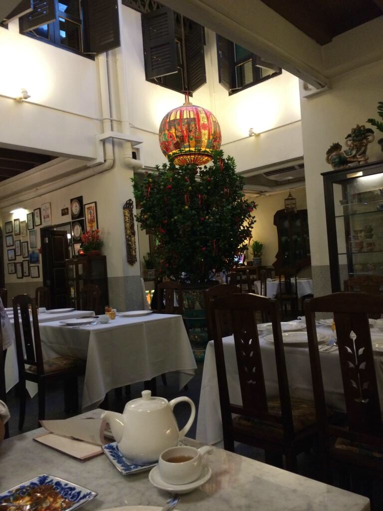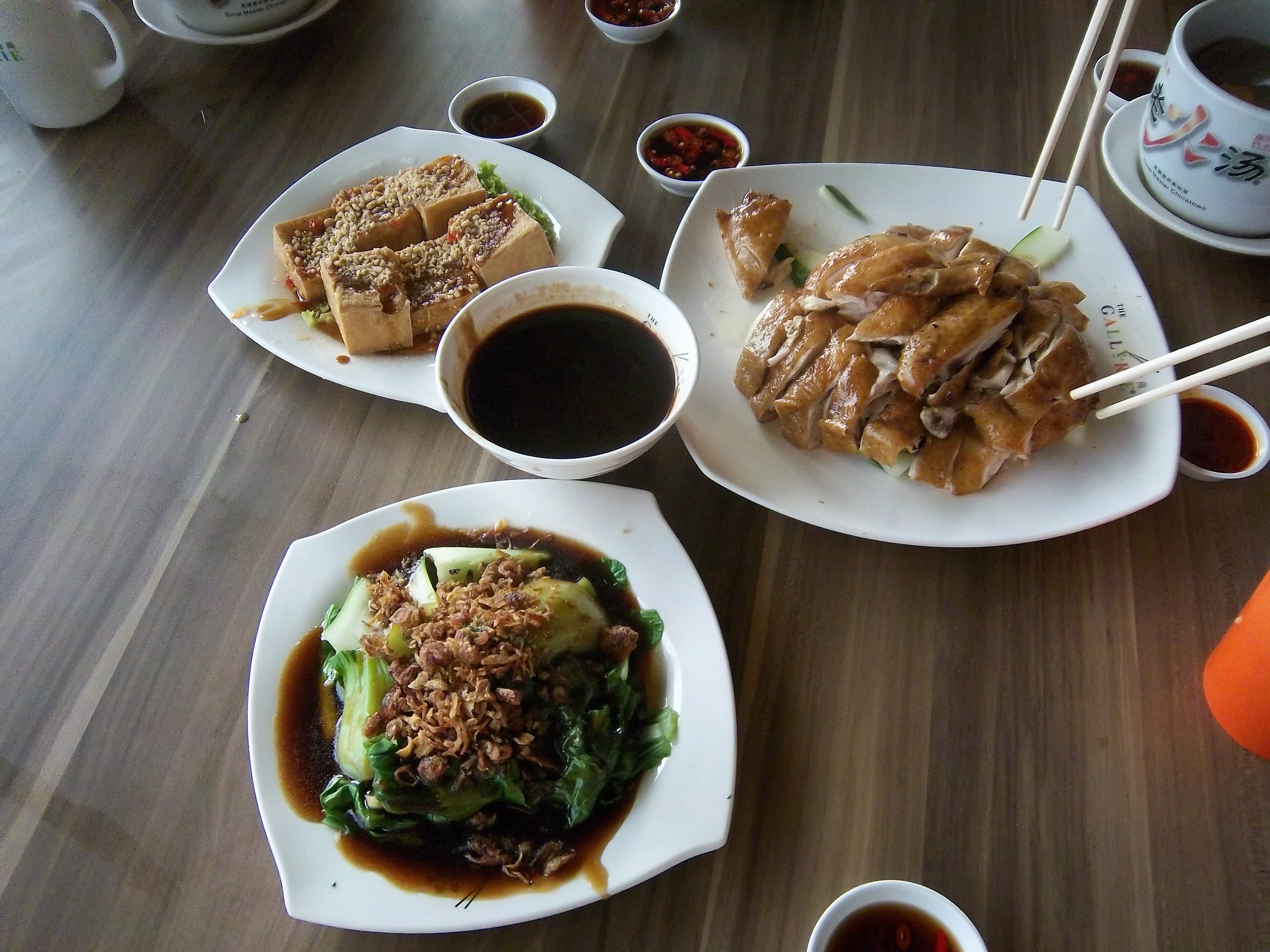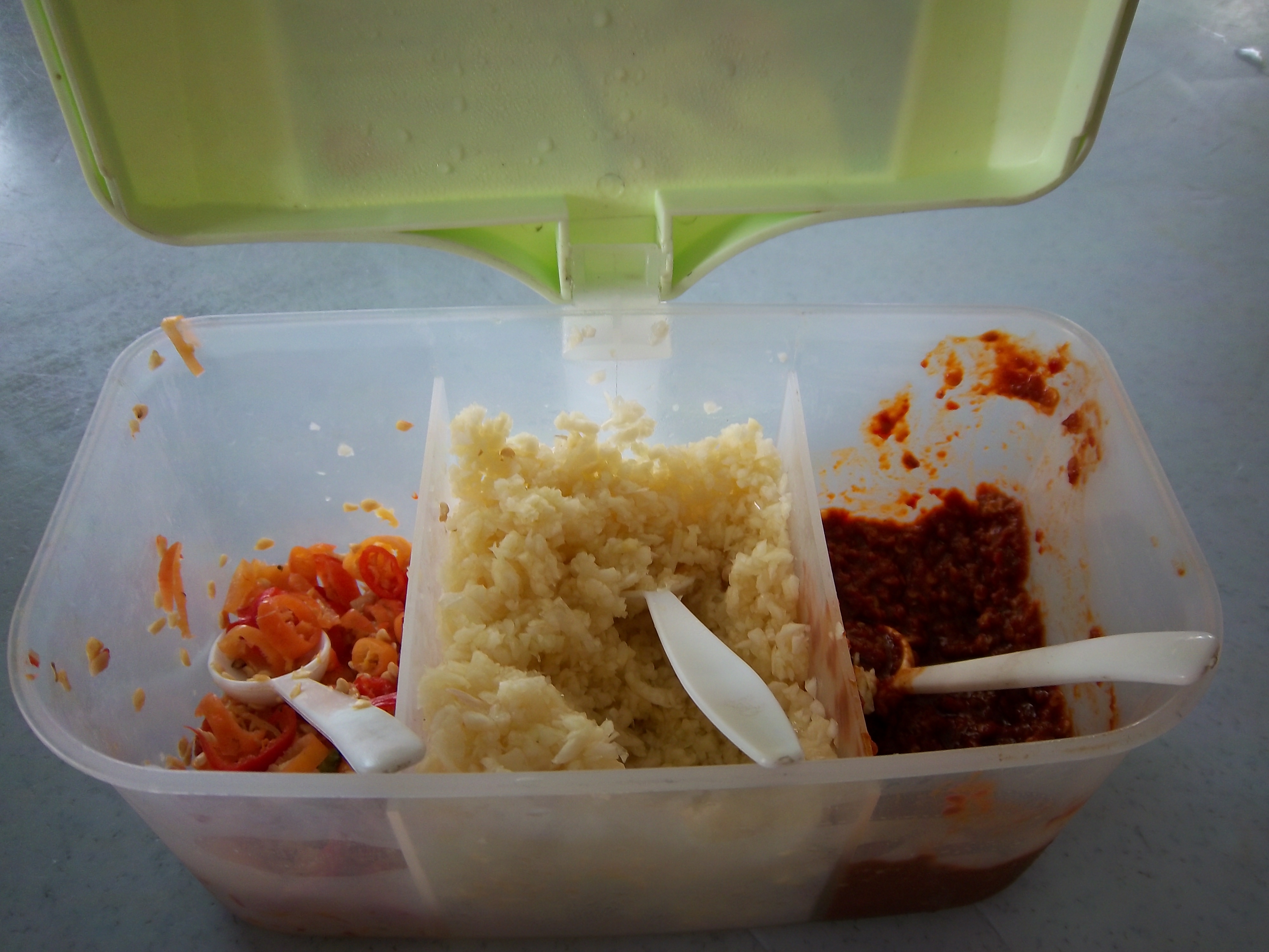 这是一个祖籍广东的马来人开的粤菜店……店面大概有两个大门,就是那种街边的“苍蝇馆子”,桌面都还有点点油腻的感觉,大圆桌,每个桌子上都有放这样的一个调理盒子,里面从左到右分别是小泡辣椒,很辣但又有点清甜,中间是蒜蓉,右边是辣椒酱,真辣……