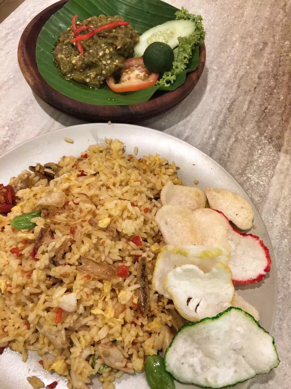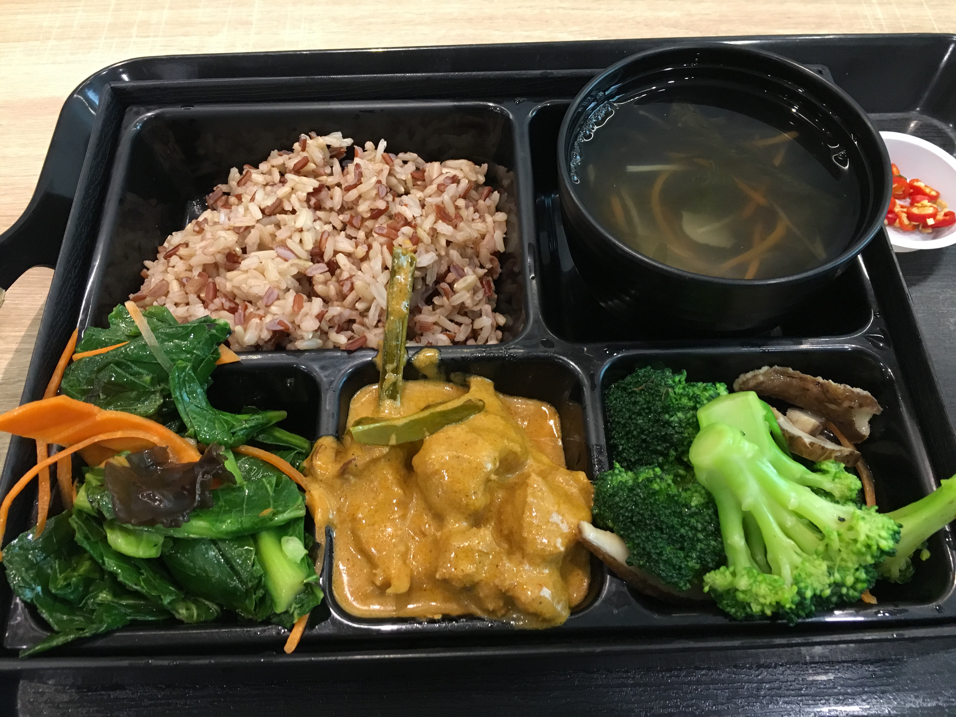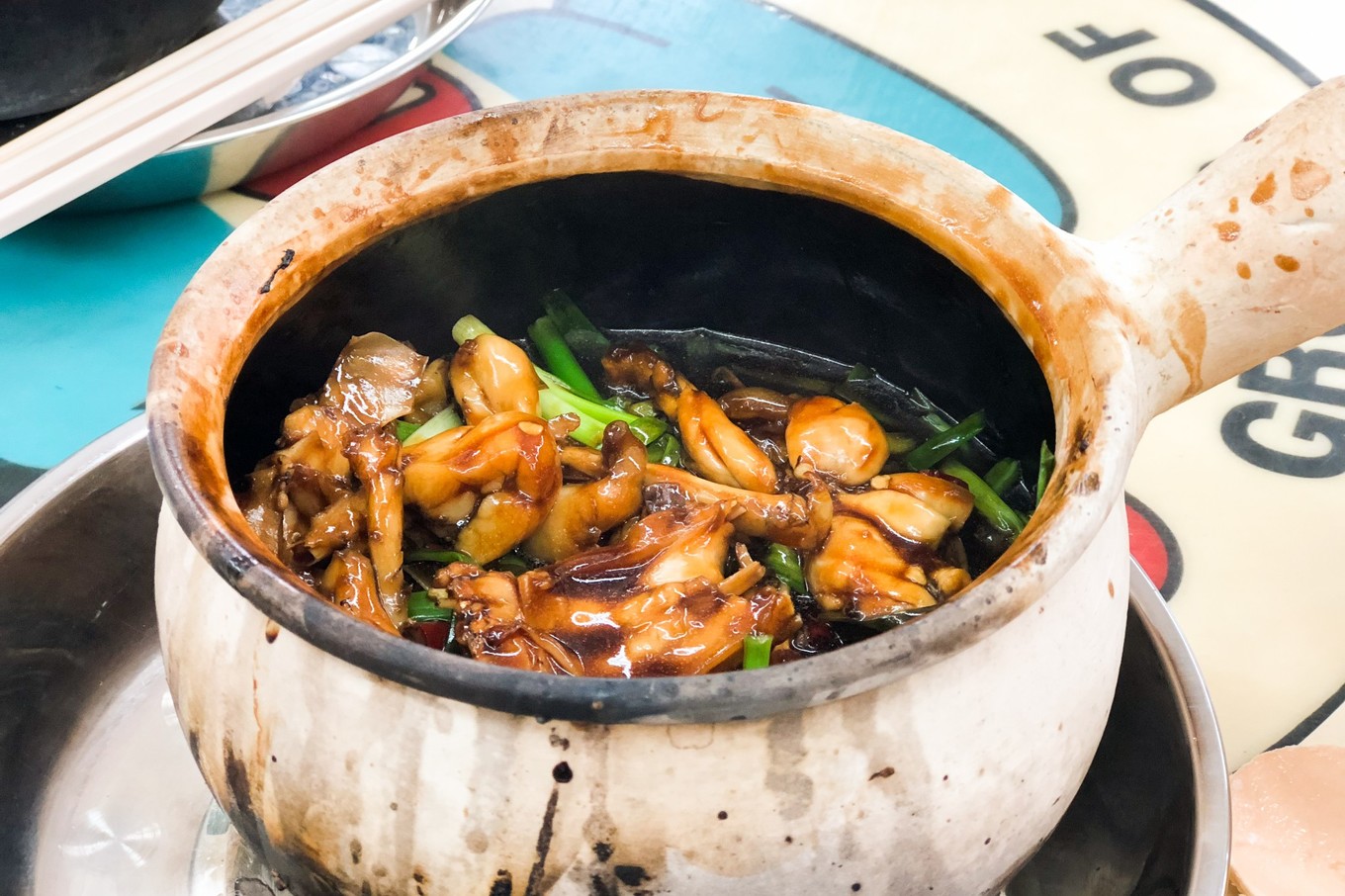 这是一个祖籍广东的马来人开的粤菜店……店面大概有两个大门,就是那种街边的“苍蝇馆子”,桌面都还有点点油腻的感觉,大圆桌,每个桌子上都有放这样的一个调理盒子,里面从左到右分别是小泡辣椒,很辣但又有点清甜,中间是蒜蓉,右边是辣椒酱,真辣……