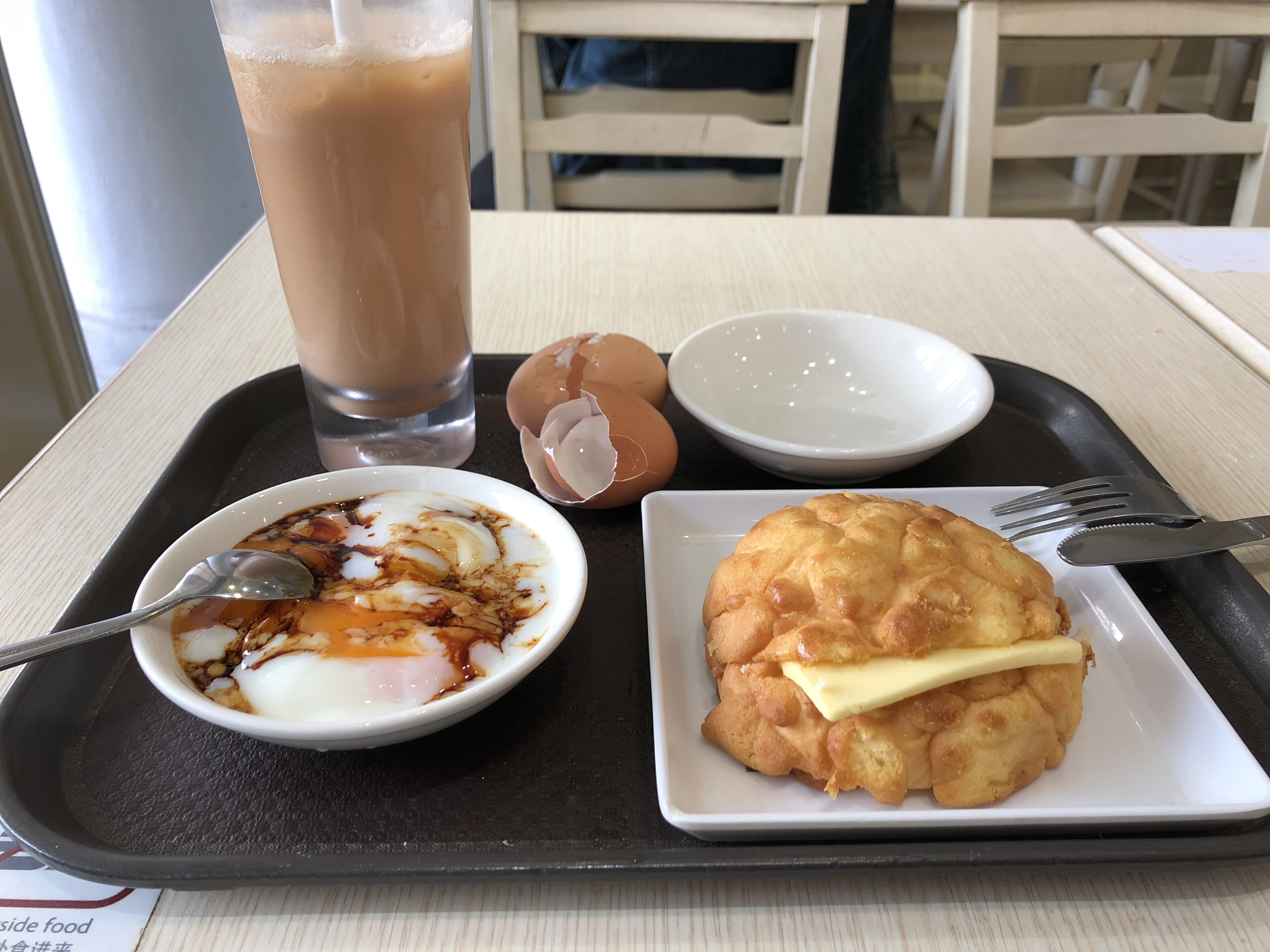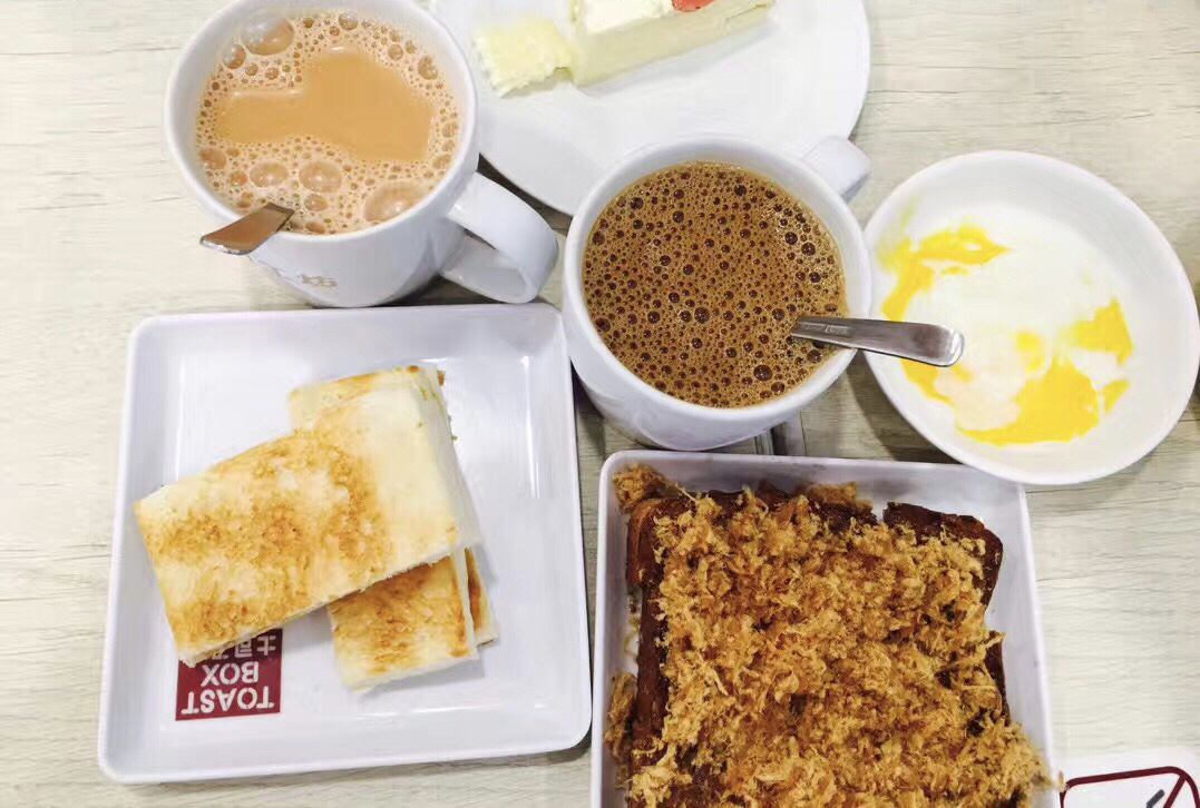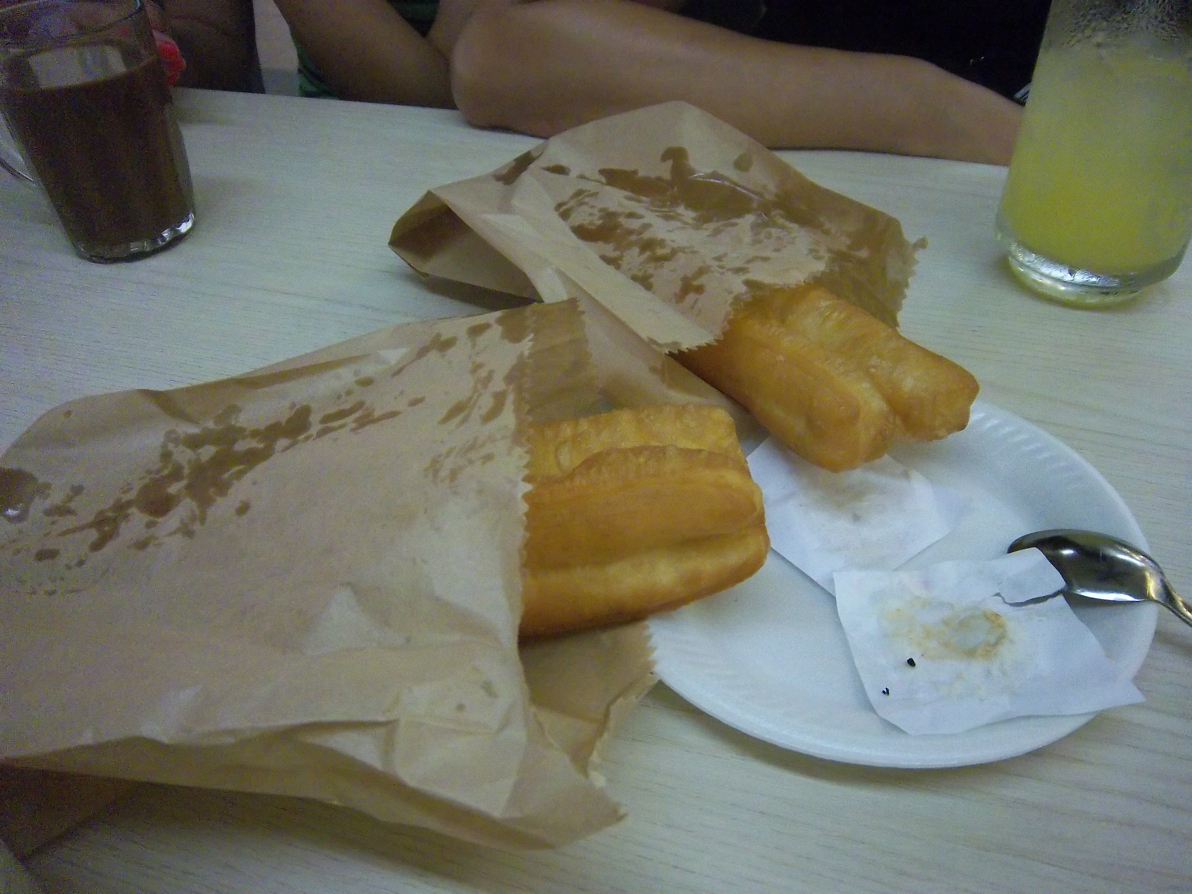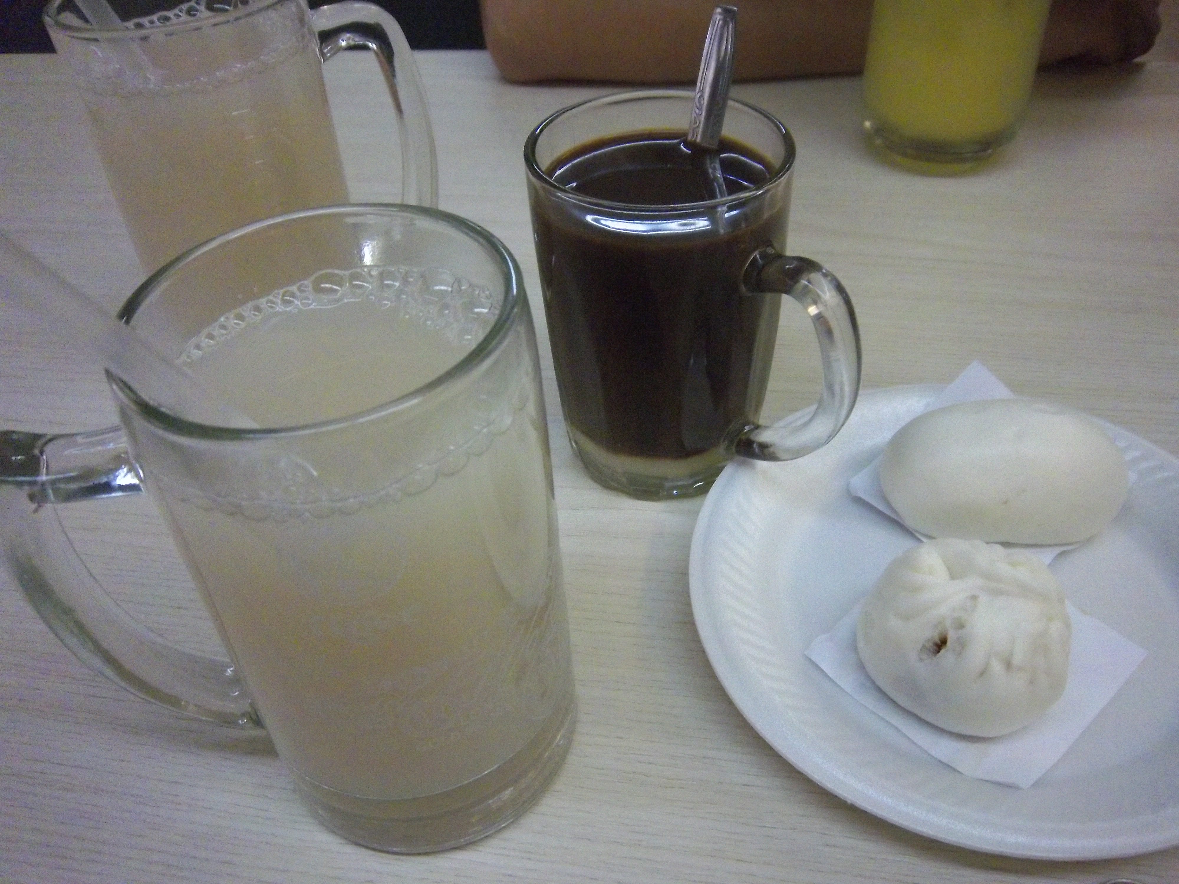 肉白色的是薏仁水,一般都是加冰的,不要冰的话要加一元新币,黑色的是咖啡加冰,黄色的是橙汁加冰。两个像包子一样的东西,一个是真的叉烧包,一个没有褶子的是豆沙包子。这俩包子都好小啊!基本上一口一个。买记错的话,水大概是3元新币一杯,包子和油条是3元两个。