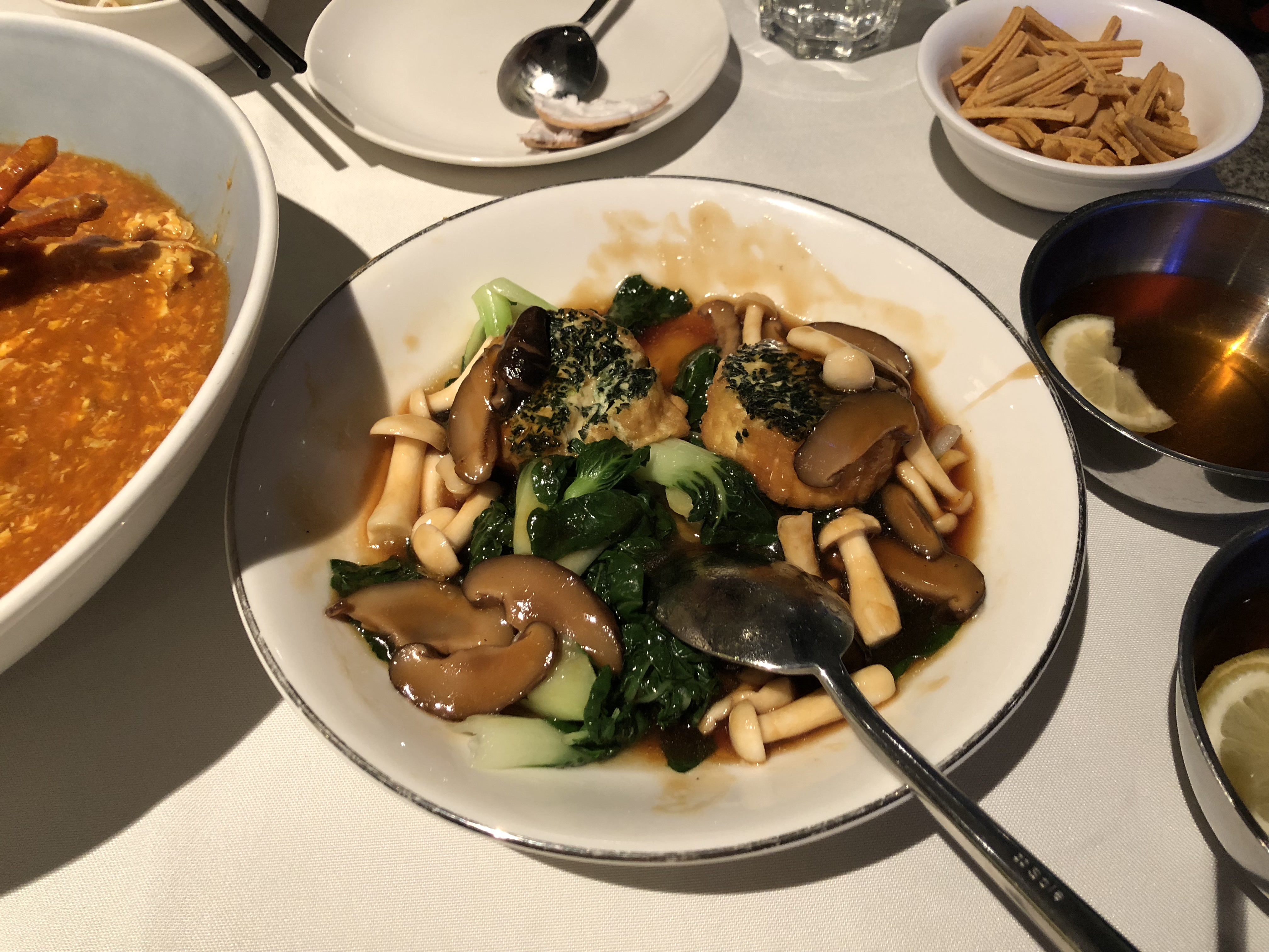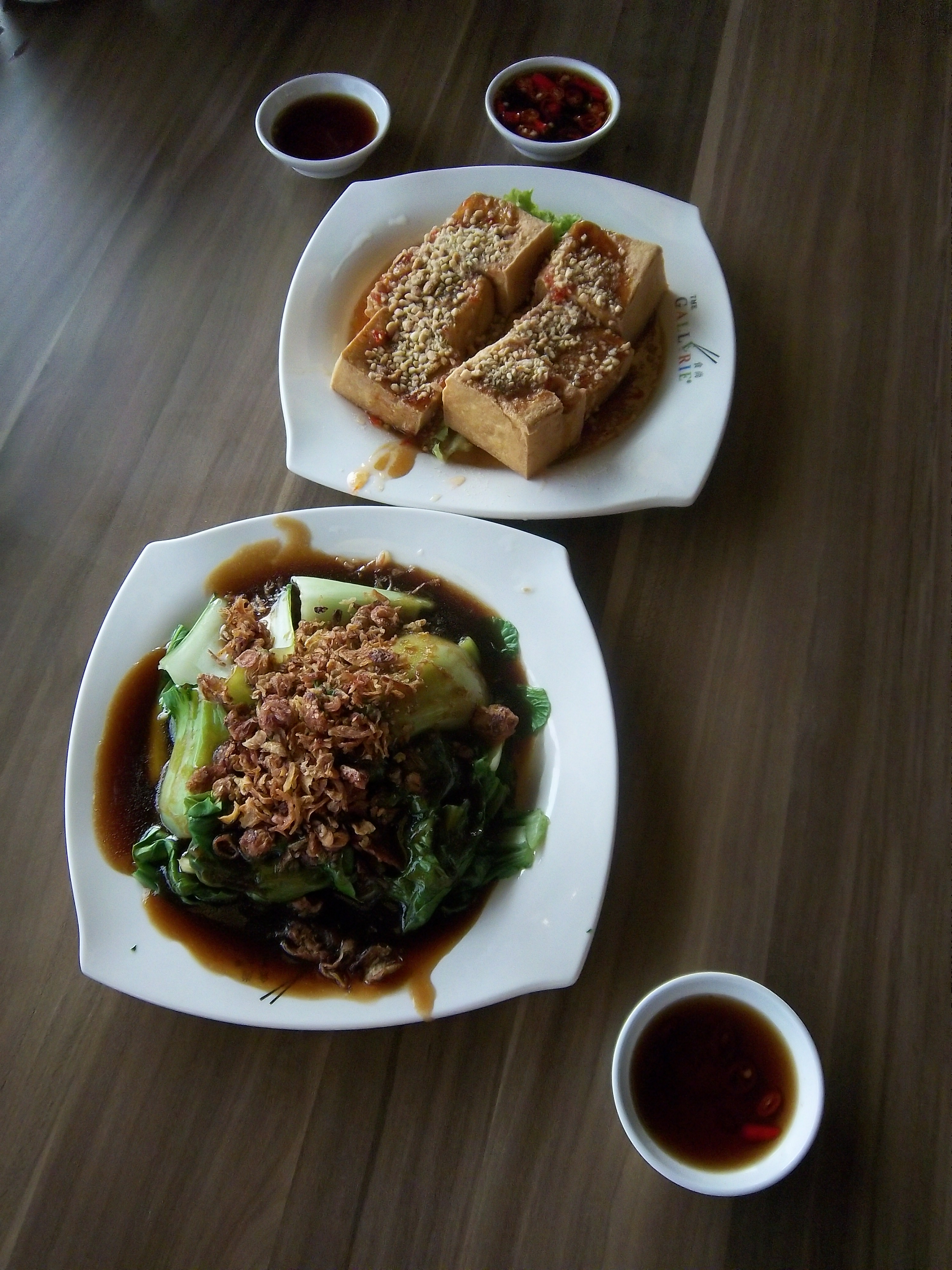 烧油豆腐,酱油油麦菜,小碗里面是酱油、辣椒等。