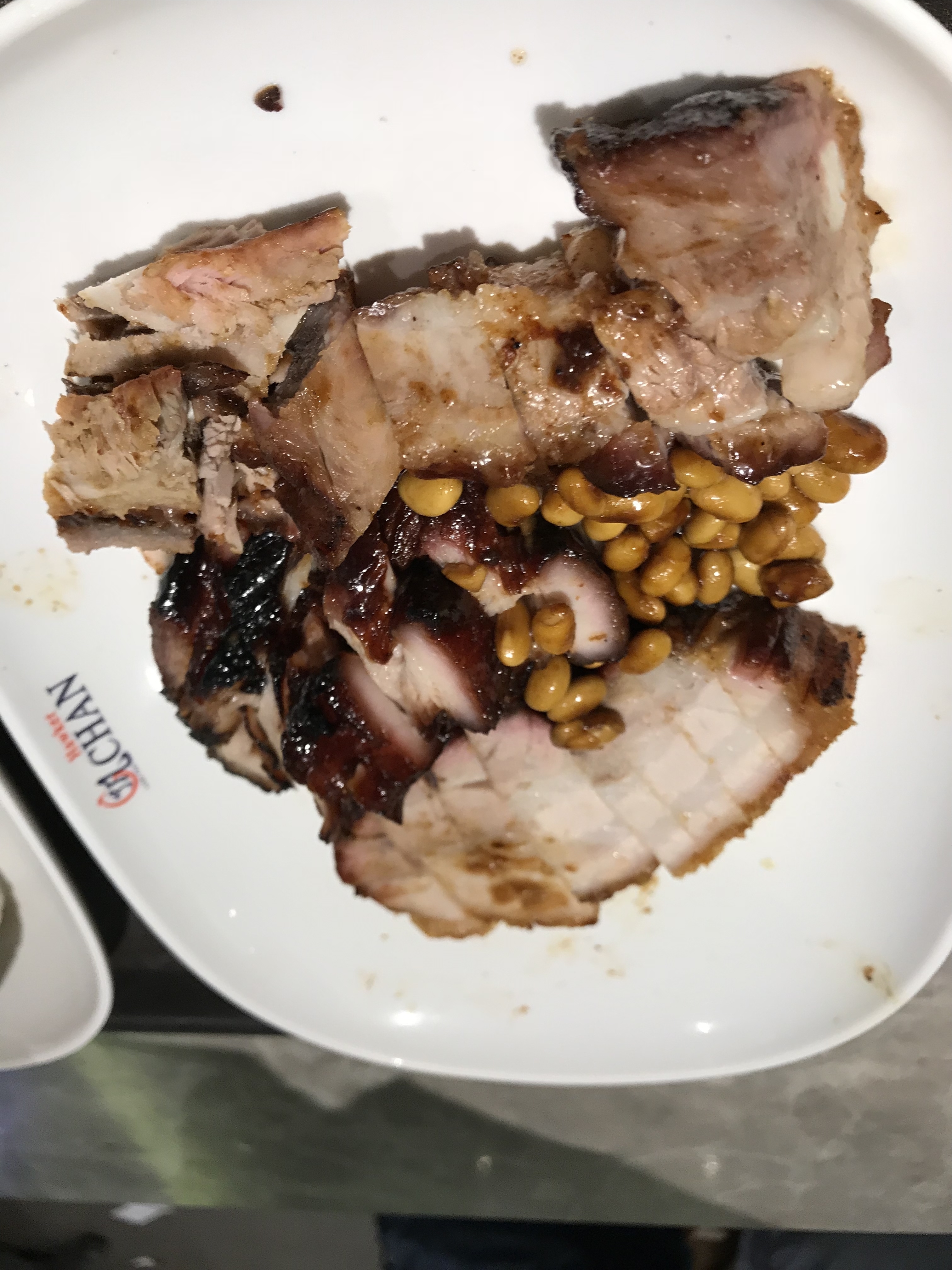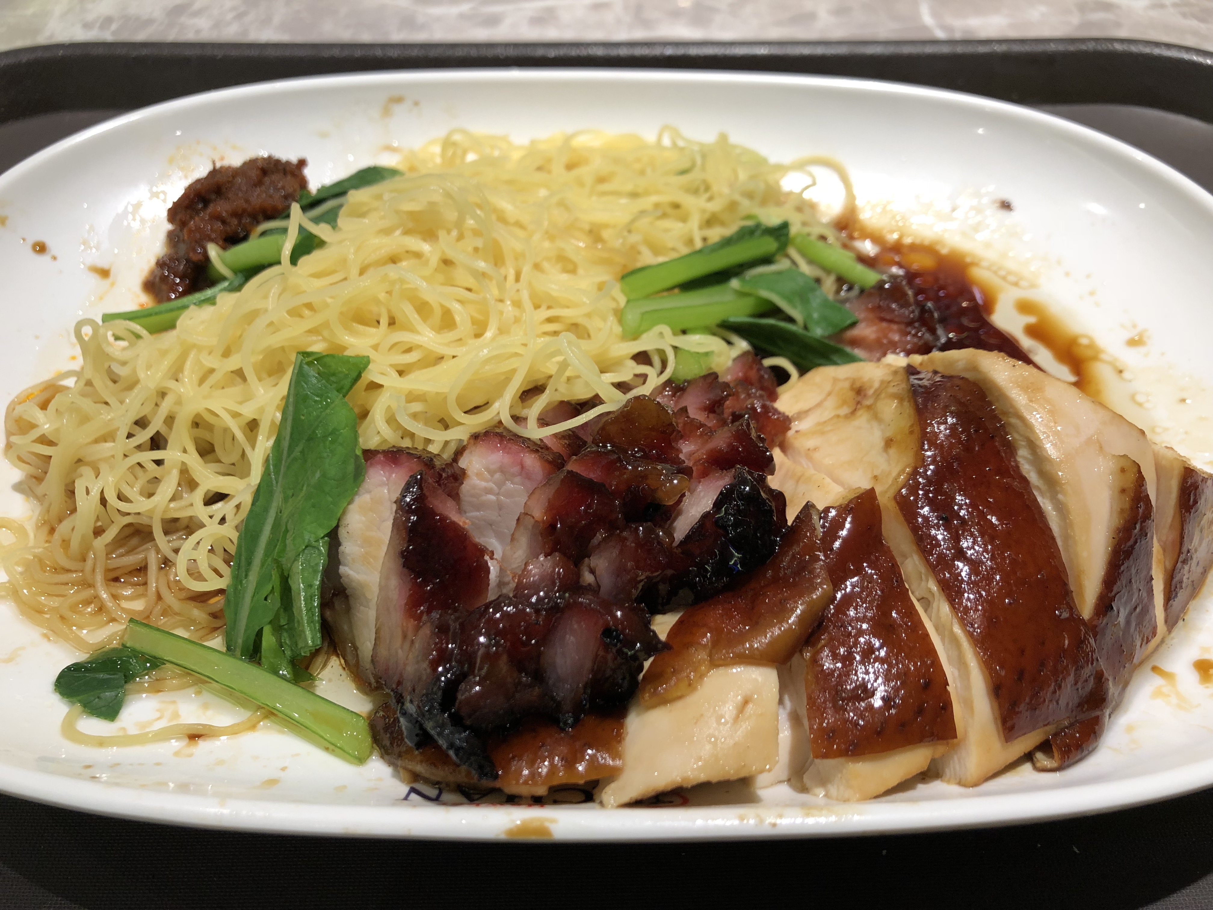 烧油豆腐,酱油油麦菜,烧鹅,中间是酱油蘸酱。最贵的是烧鹅,貌似10元,记不清楚了。