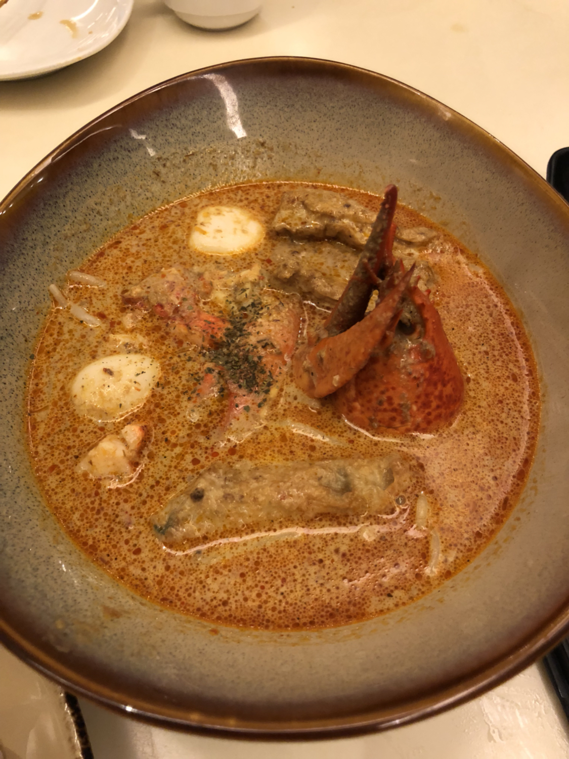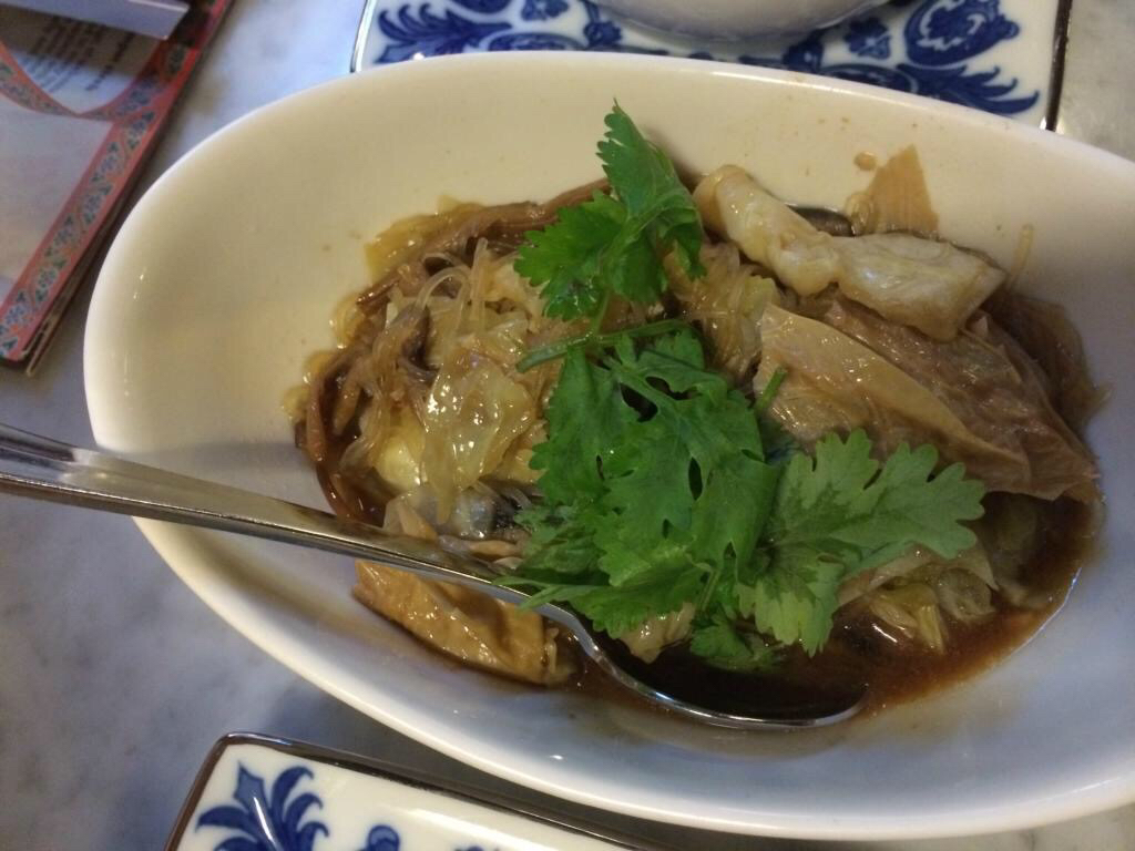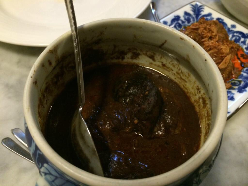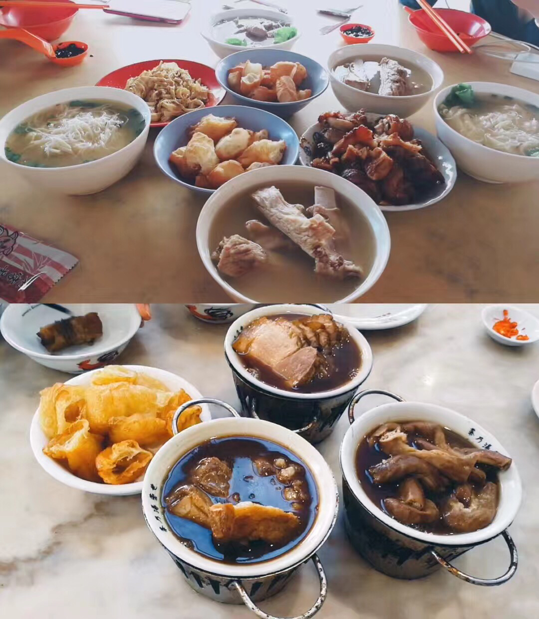 其实,就是有胡椒味道的猪骨汤,汤汁鲜美入味,红烧猪脚入口即化。
