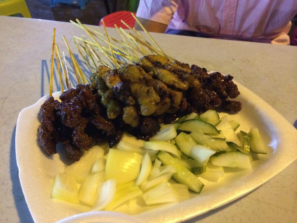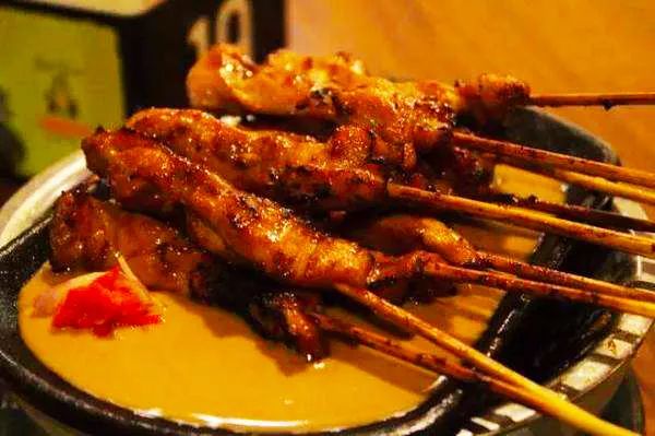 新鲜的牛羊肉用沙爹酱腌制好,放在炭火上细细烘烤。