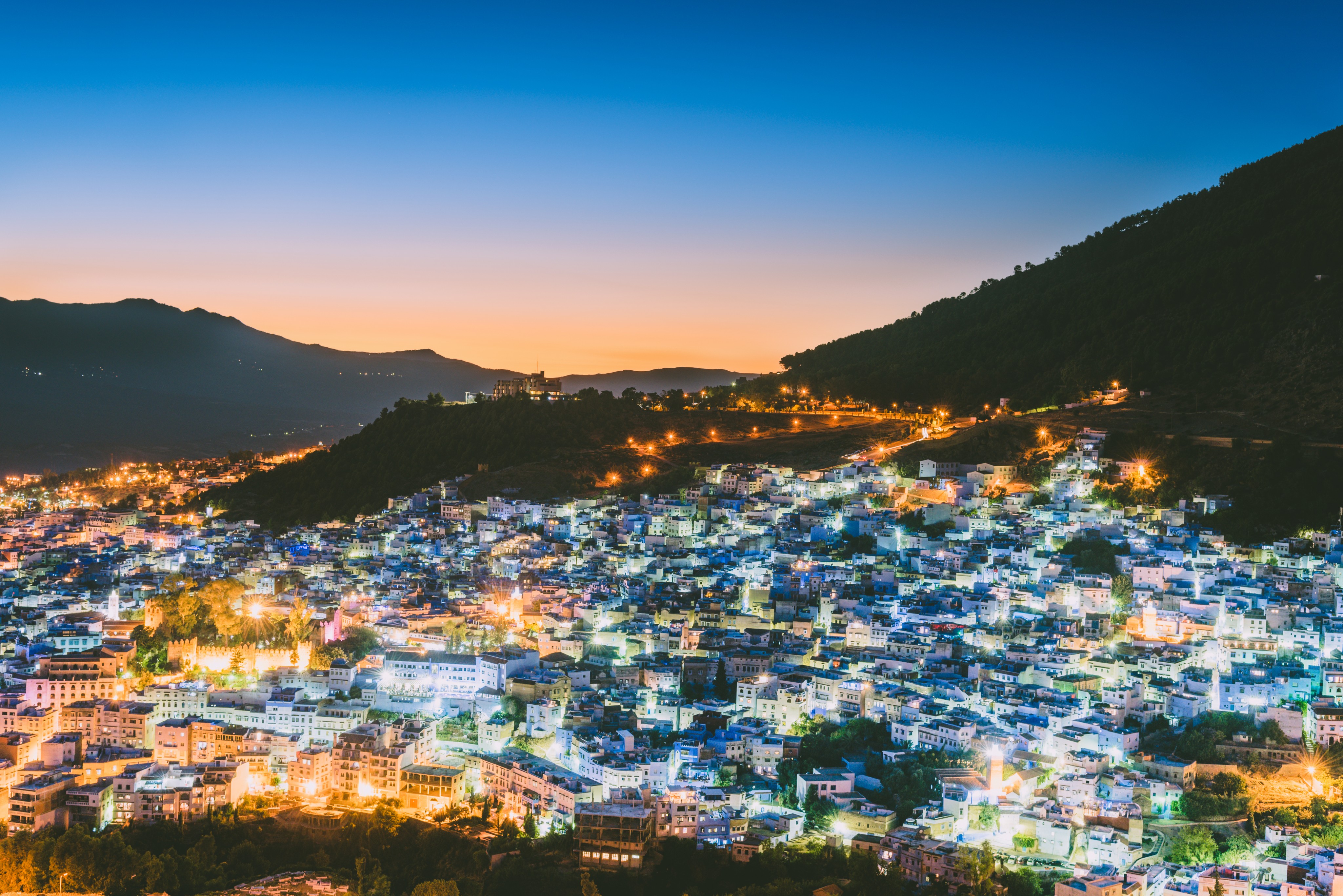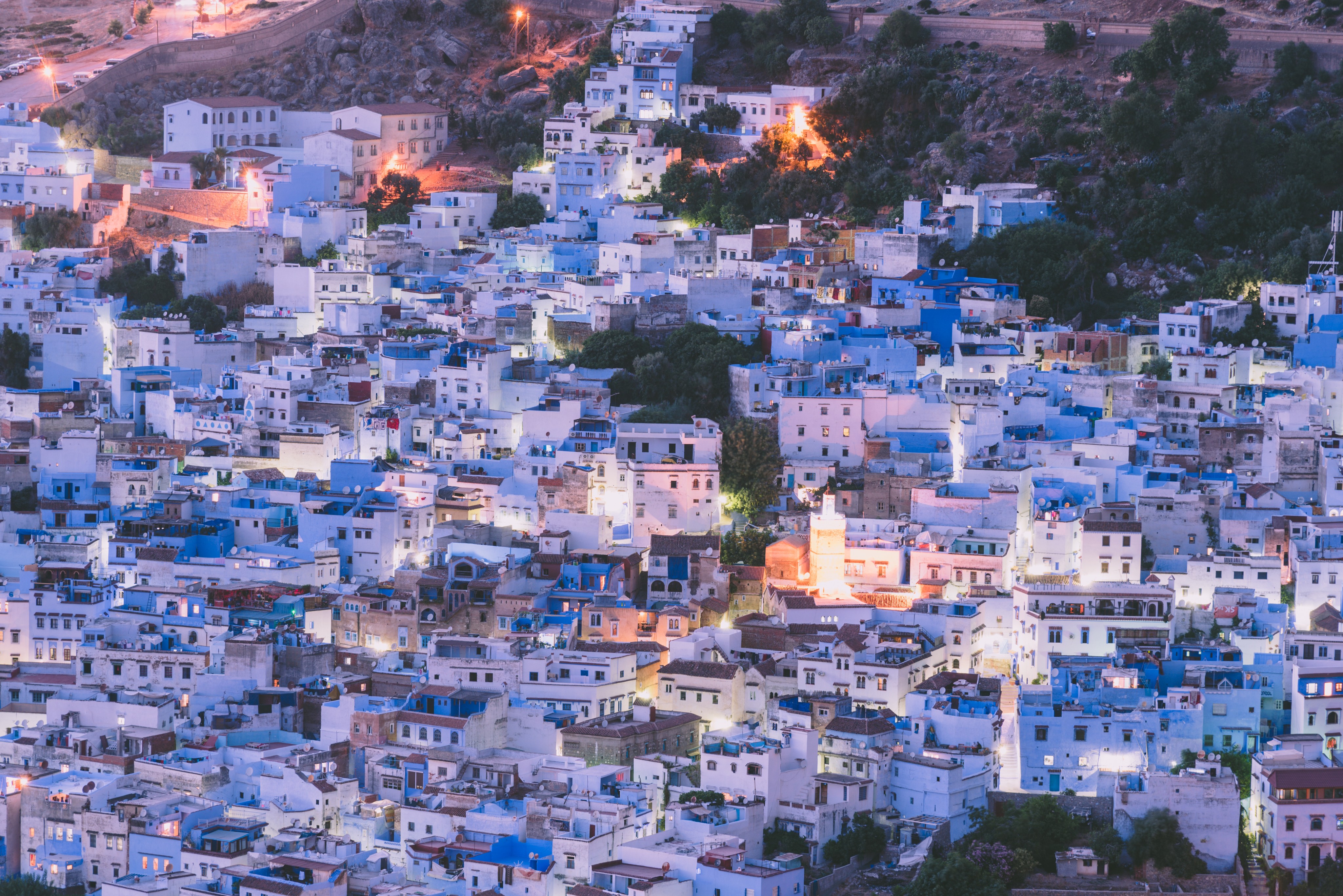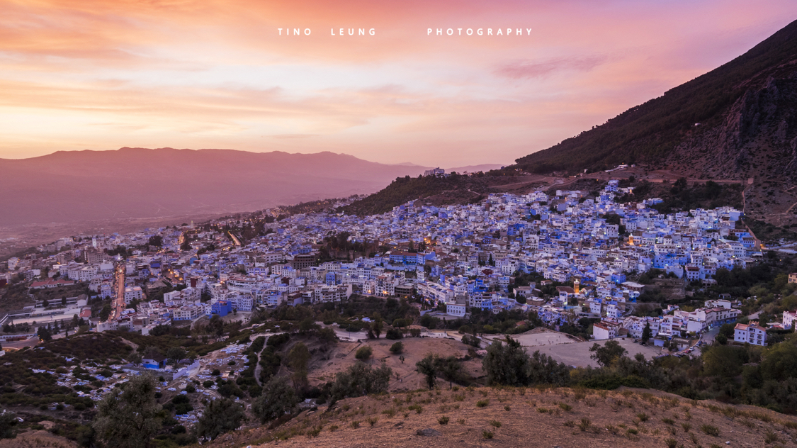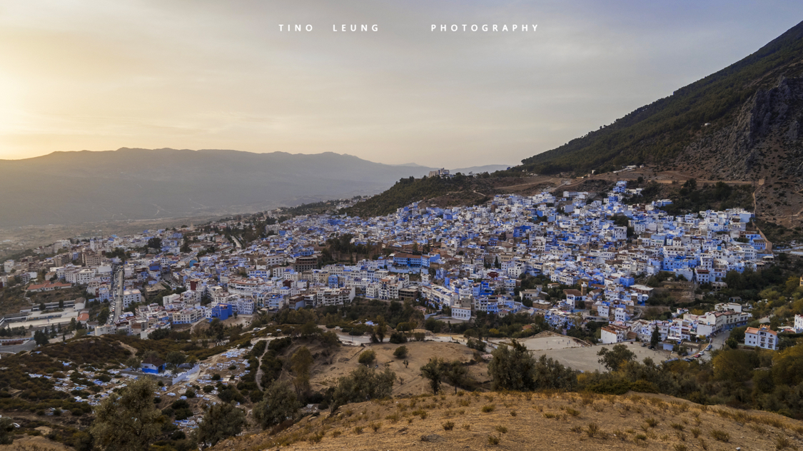 落日余晖下的蓝白小镇