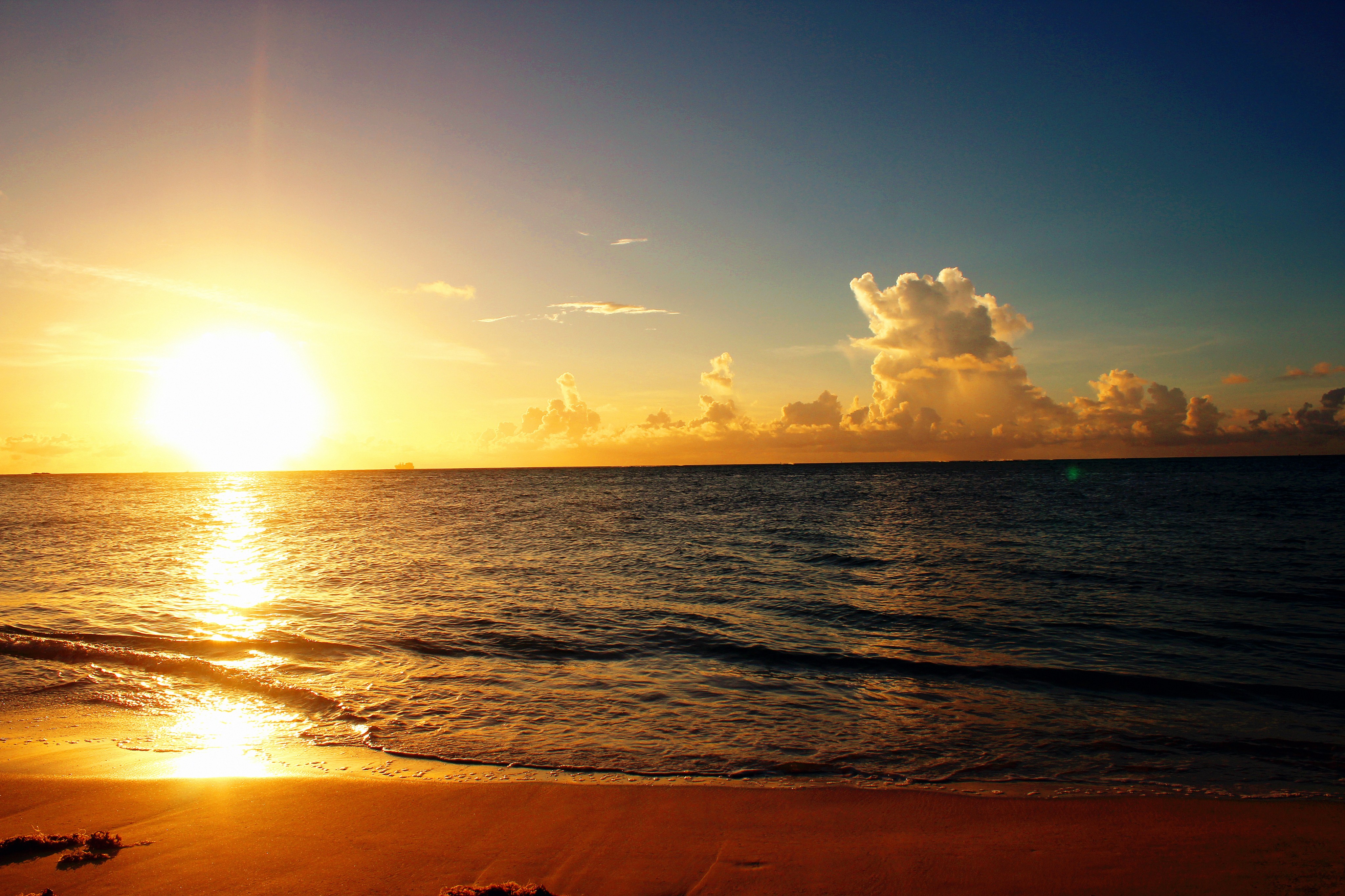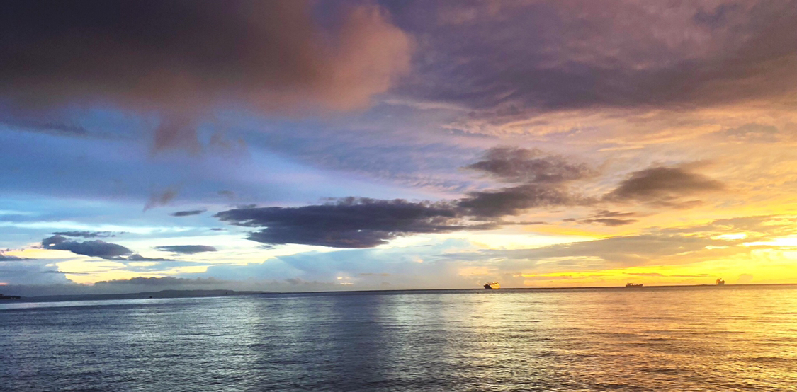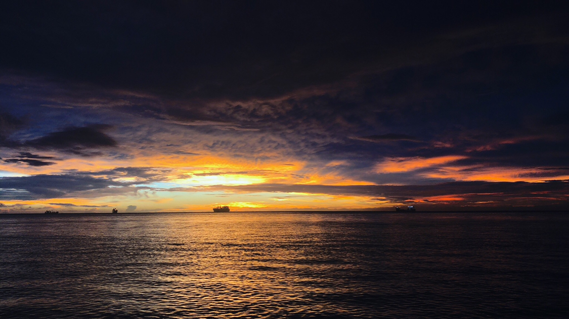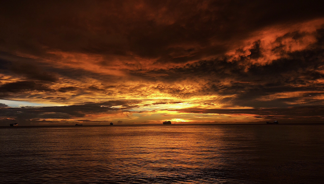 这时太阳刚刚升起,海面十分平静,没有风,云也几乎静止不动。