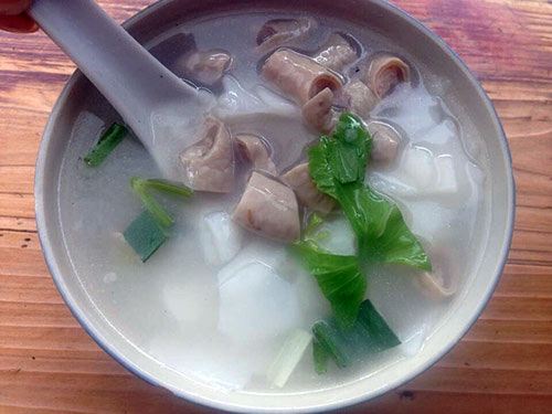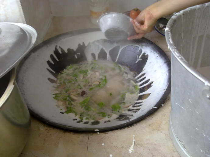 2.柴火锅边:锅边可以说是家乡人最爱的早餐,没有之一,柴火锅边就是用柴火烧着煮出来,这样子最正宗,而且锅边的汤还要河蚬熬成汤,然后煮锅边,非常讲究,这样味道才最鲜美,也是一样搭配虾油, 煮的时候,是把米浆捂一圈在锅旁边,然后慢慢用锅铲铲起来,自然卷成一片一片,放上芹菜,熟鱼干,花蛤,海鲜等等就是一碗香甜的锅边,家乡人还喜欢配上油条,哈苏(有病),三角糕,这就是我们超喜欢的早餐,每一年还有大型的锅边节。