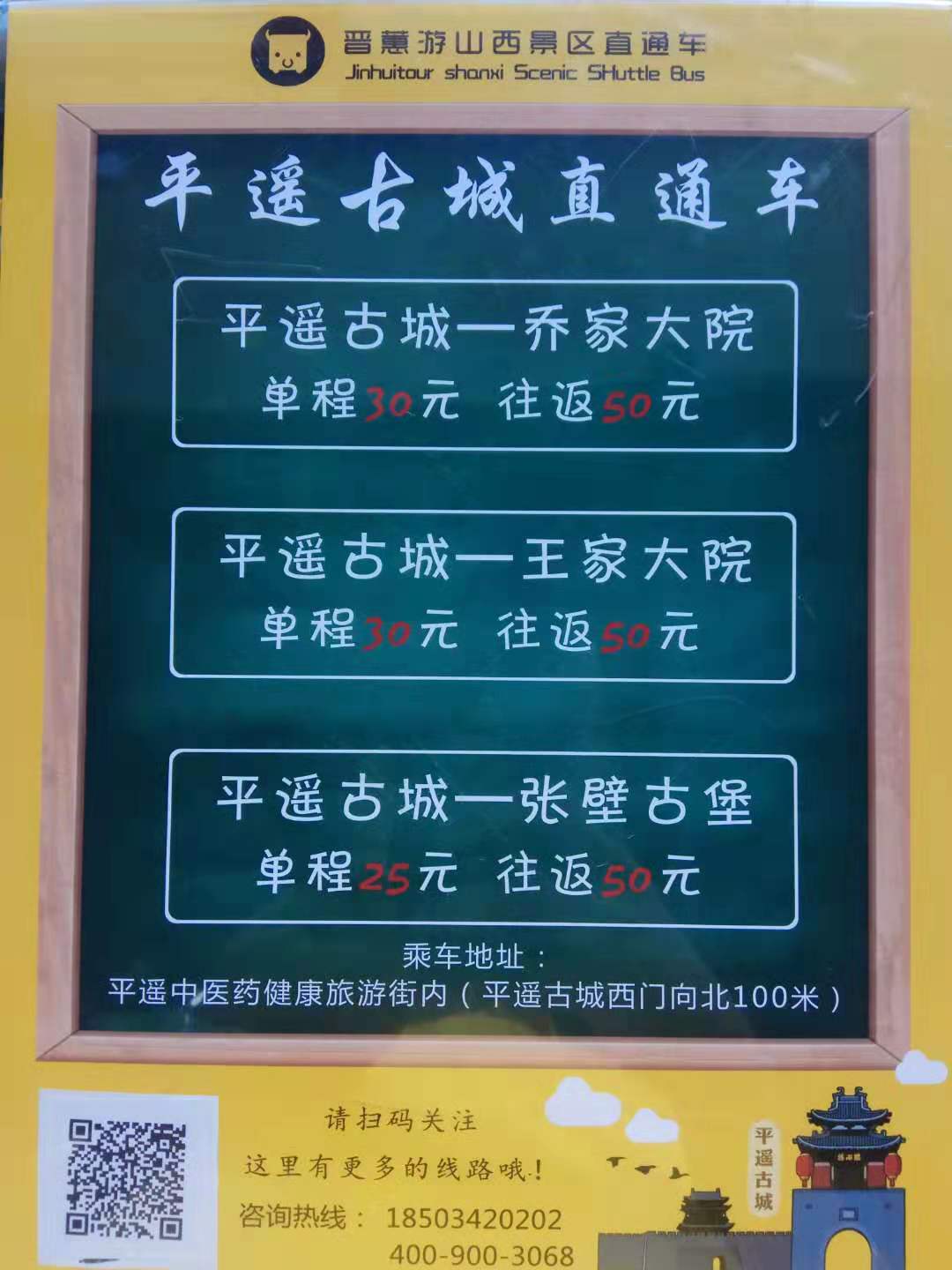 可以乘坐景区间的直达车,平遥古城北门和平遥古城西门都有车到王家大院,有单独去程的,也可以买往返票。每天发班,班次也很多,发车时间有07:10、08:40、12:40、14:00 ;返程时间有 10:50、12:30、15:50、17:20 。票价单程的20元,往返的40元。车程在7...显示全部