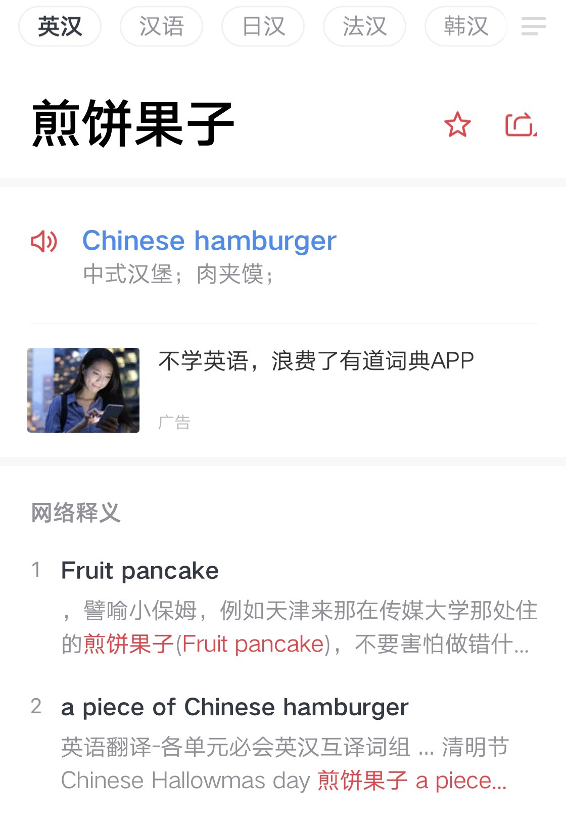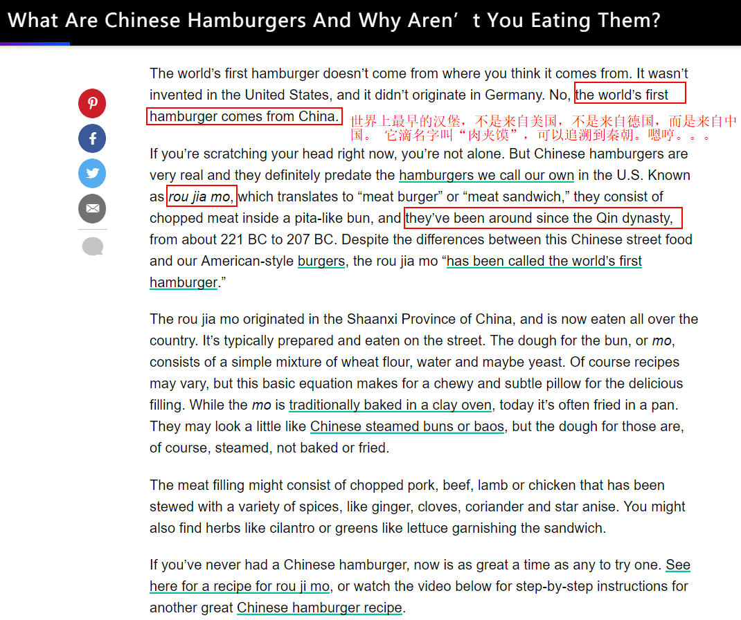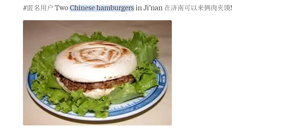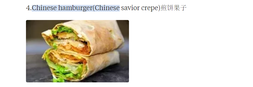 最后我觉得既然汉堡包就是从Hamburger 直译过来的,我觉得把煎饼果子叫成JIANBING也不错哦,因为这是境外文化以前不存在可以替代词来翻译我们的煎饼果子,那么作为外来文化,就让它保留自己的文化属性也很不错~