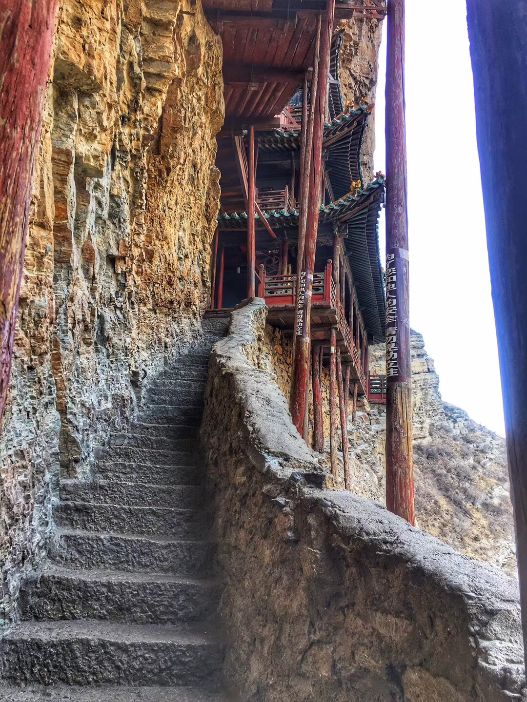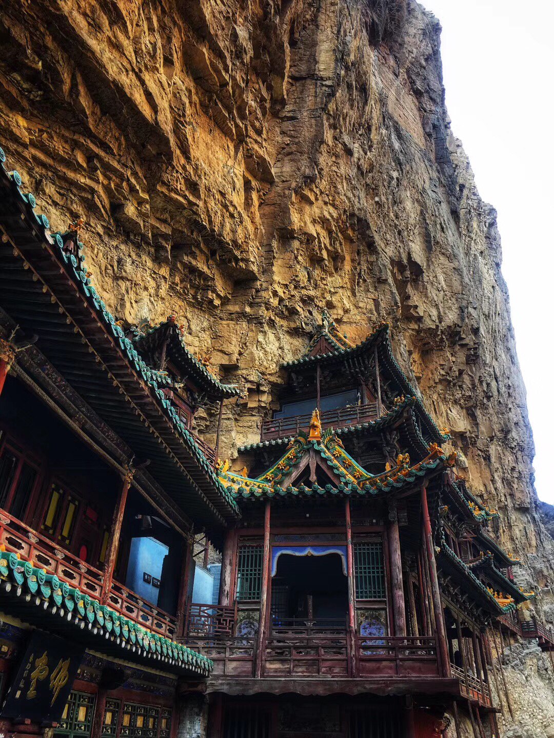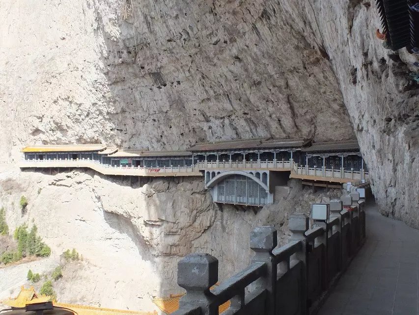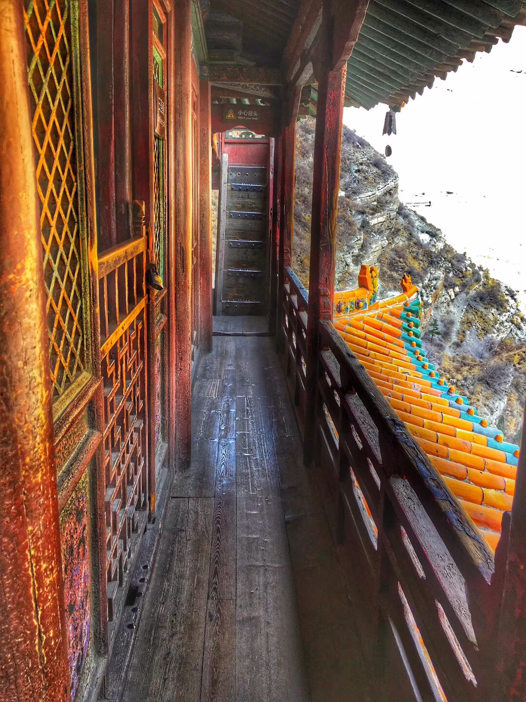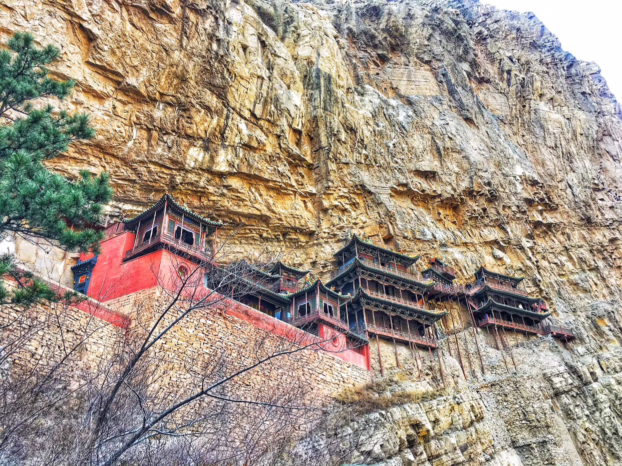 除此之外,我还很喜欢悬空寺。修建在悬崖峭壁之上,看过后不得不让人感叹古人的智慧。整个寺庙漂浮于悬崖之上,部分嵌入石壁内,部分用几根木柱支撑着。从下往上看,就像一幅壁画。站在寺庙上往下看,仿佛身处于悬崖边上,寺庙走道很窄,一次仅能一人通过,栏杆到人膝盖处,踩在木板上,听着嘎吱嘎吱的声音,可以说是步步惊心。寺庙楼檐脚都挂有铜铃,风过铜铃响,让人内心又很平静。