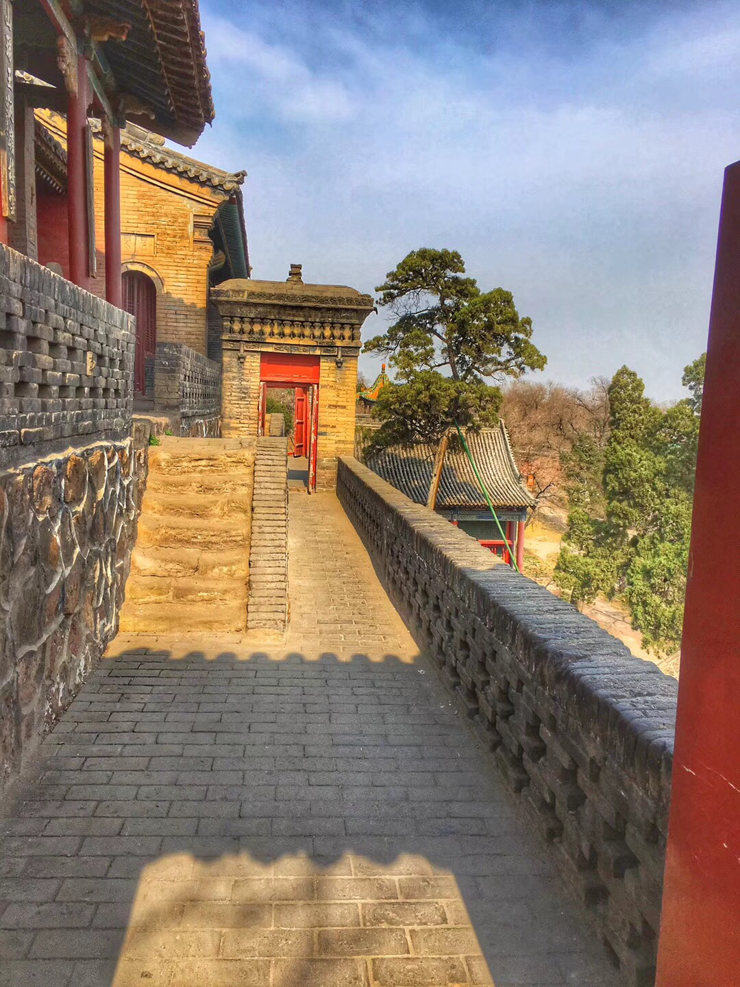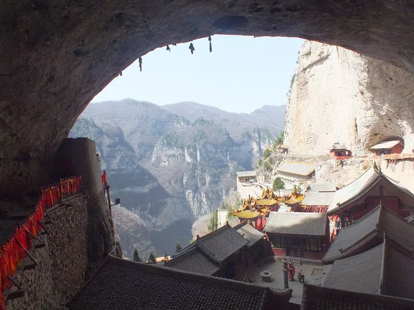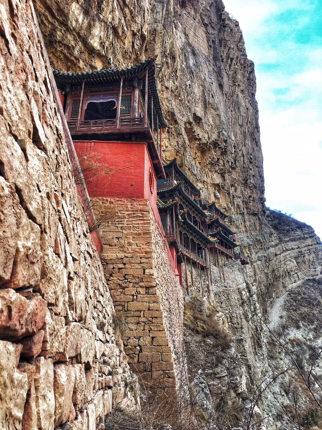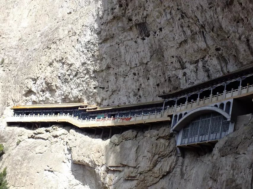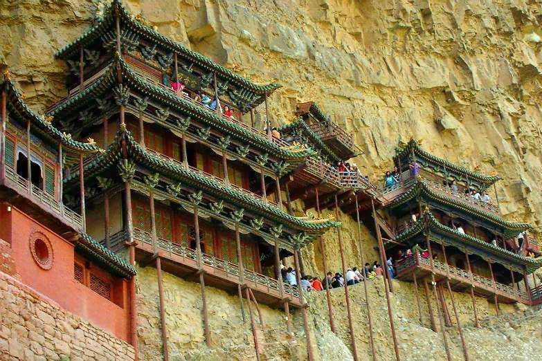 除此之外,我还很喜欢悬空寺。修建在悬崖峭壁之上,看过后不得不让人感叹古人的智慧。整个寺庙漂浮于悬崖之上,部分嵌入石壁内,部分用几根木柱支撑着。从下往上看,就像一幅壁画。站在寺庙上往下看,仿佛身处于悬崖边上,寺庙走道很窄,一次仅能一人通过,栏杆到人膝盖处,踩在木板上,听着嘎吱嘎吱的声音,可以说是步步惊心。寺庙楼檐脚都挂有铜铃,风过铜铃响,让人内心又很平静。