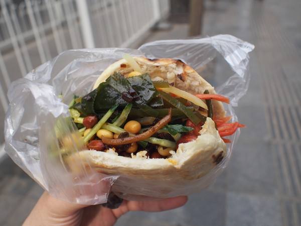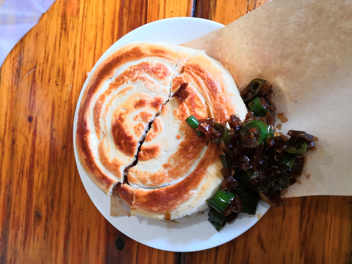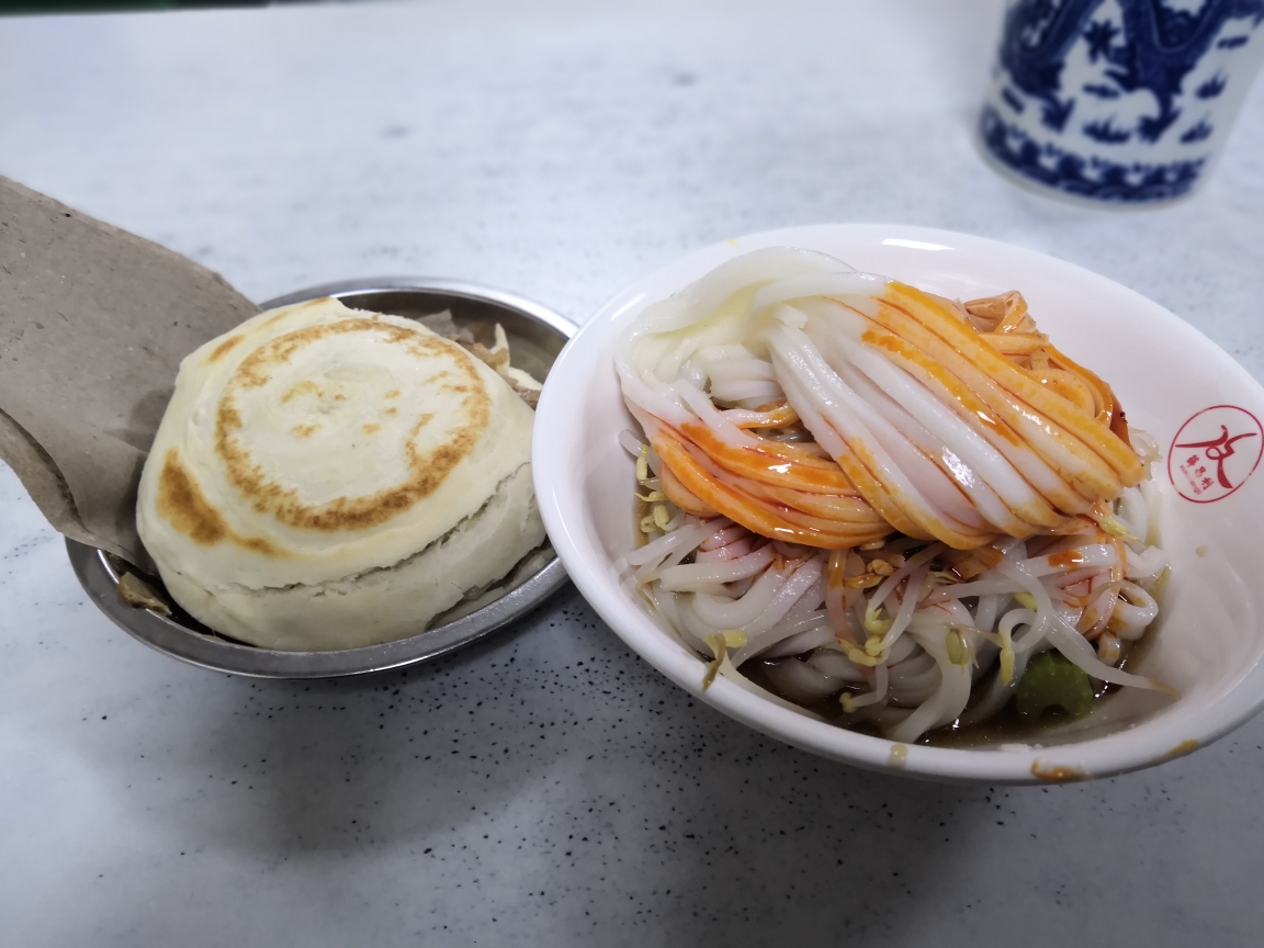 早市上很多地方都是能够看到这种荷叶饼粉蒸肉夹馍的,吃上去口味偏重,适合搭配面或者线来吃~