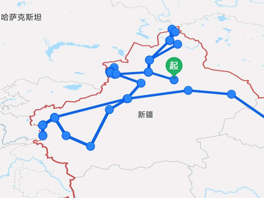 (从甘肃入疆)哈密 427km 第13、14、15天 吐鲁番 200km 第16、17 天 乌鲁木齐 100km第18天 阜康 260km第19天 富蕴五彩城 260km第20天 富蕴县 262km第21、22天 布尔津 170km第23、24天 喀纳斯湖 522km第25天 克拉玛依 441km第26天 赛里木湖 160km(经果子沟)第27天 伊宁 286km第28天 拉那提 90km第29、30天 巴音布鲁克 253km第31天 库车 260km第32天 阿克苏 461km第33、34天 喀什 220km(车程9小时左右)第35天 布伦口 127km第36、37天 塔什库尔干 300km第38天 疏附县 516km第39天 和田 292km第40天 民丰 465km 第41天 且末 289km第42天 若羌 (从青海出疆)