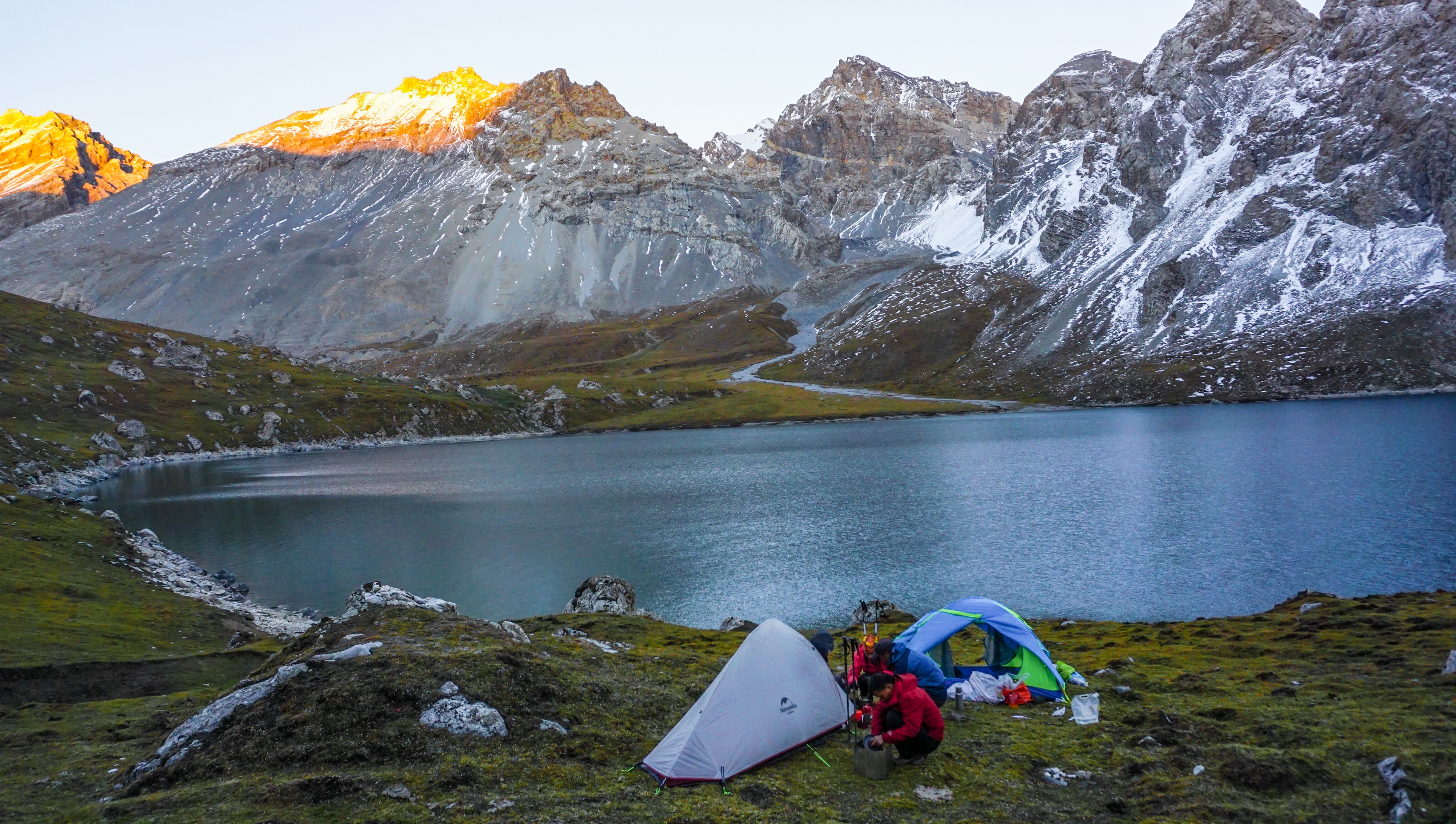 在天堂湖旁露营,坐看日照金山,当下真是感动的要流出泪来,是给人生的恩赐啊。