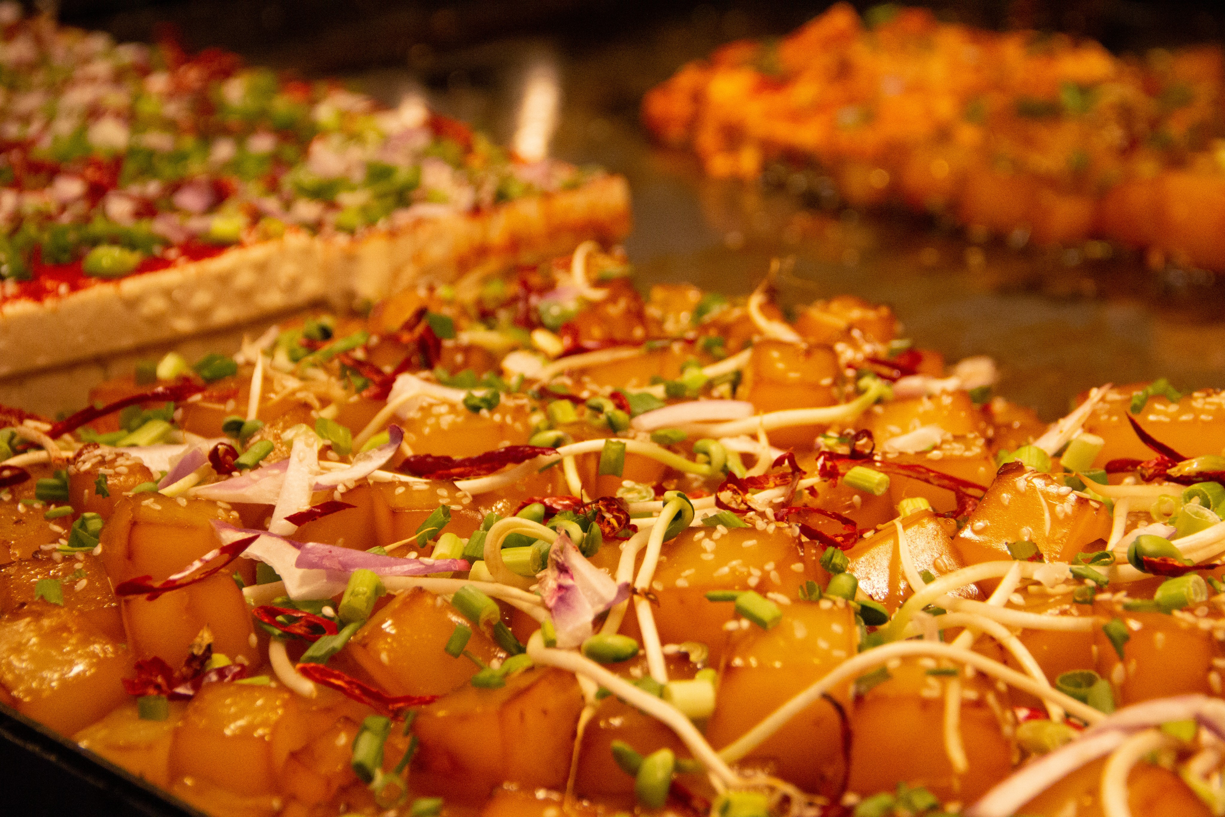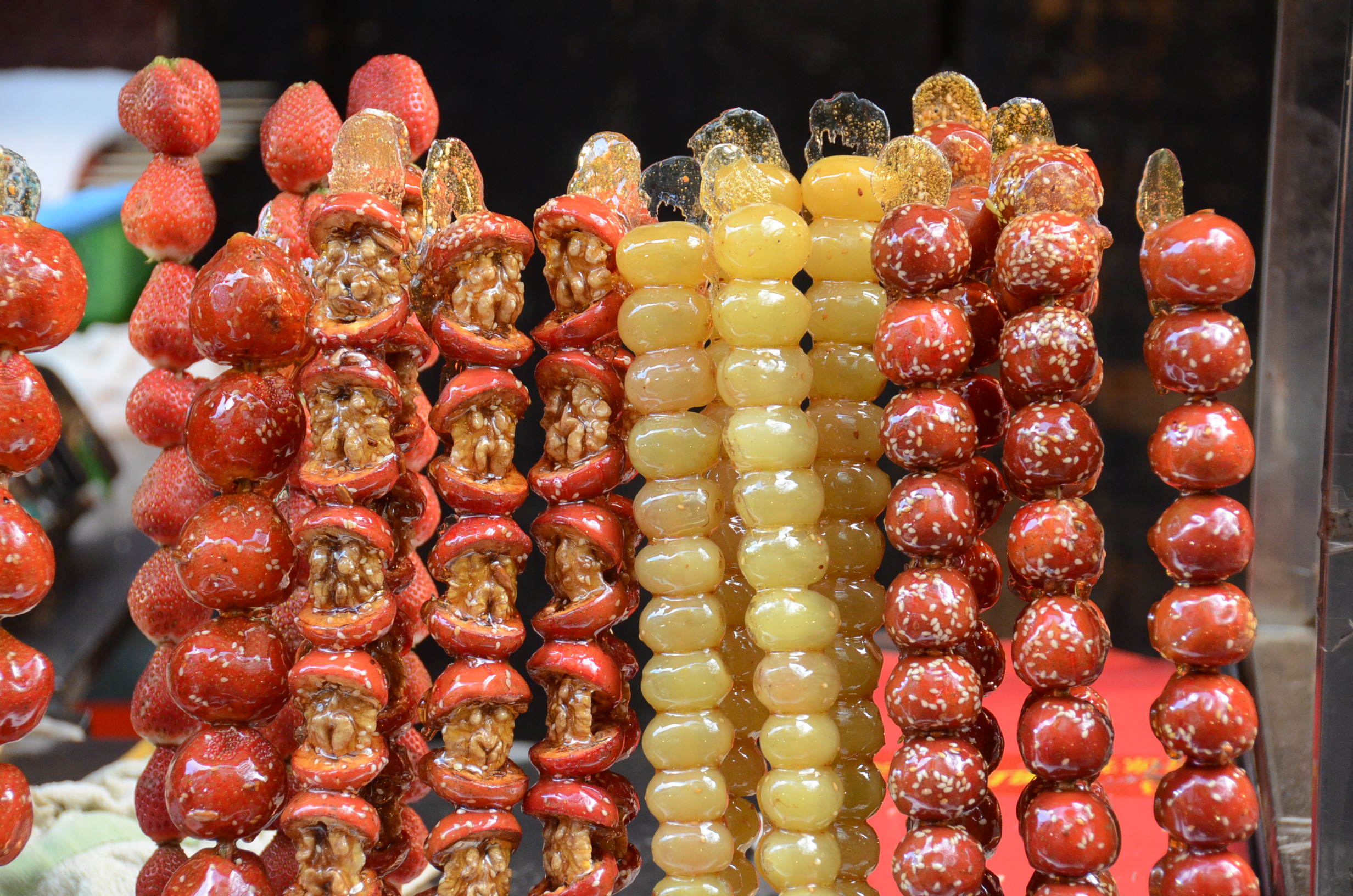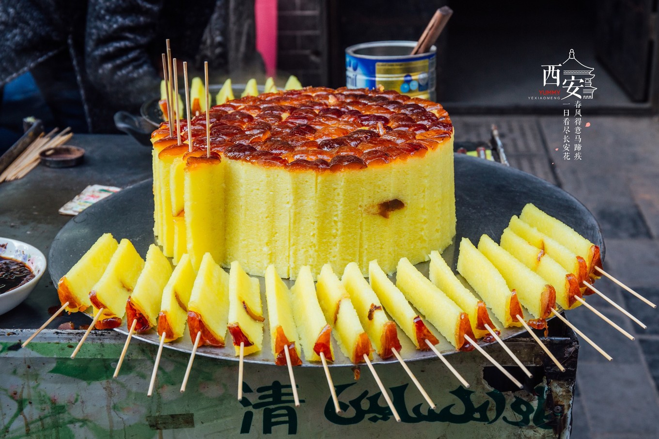 这种周身金灿灿的只有在陕西能见到,是当地人最爱的街头小吃之一。用糖渍桂花、糯米粉、糖等搅拌起来,蒸熟。通常店家会把桂花糕做成一个很大的圆饼状,顾客买的时候再用特质的刀切出一小条,用竹签串起来吃。参考价:3元钱一条。