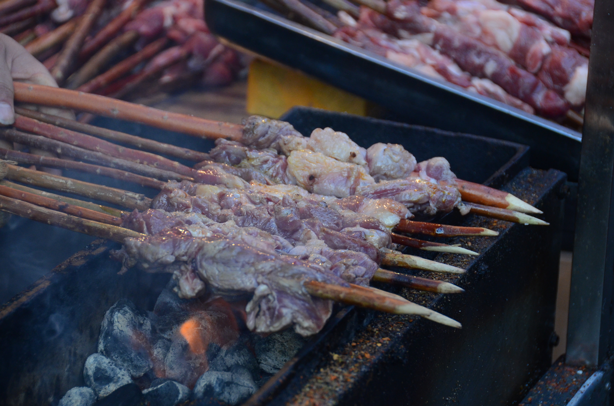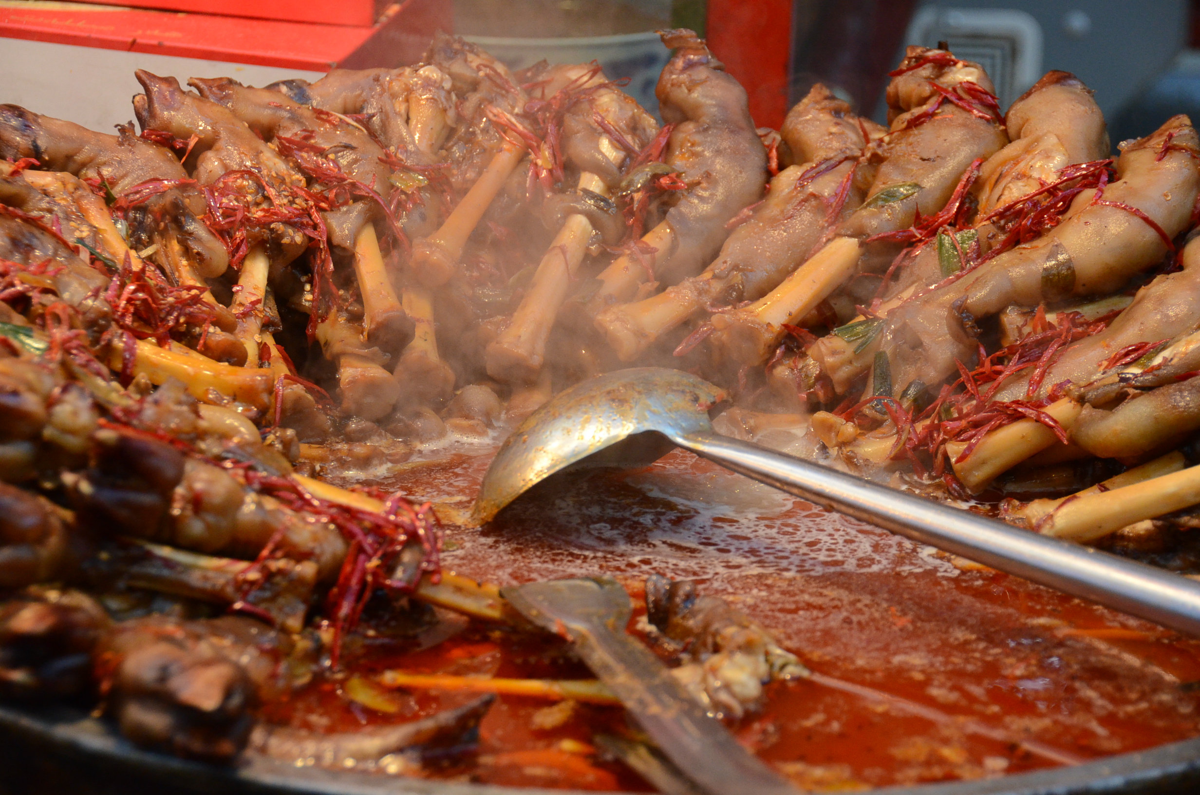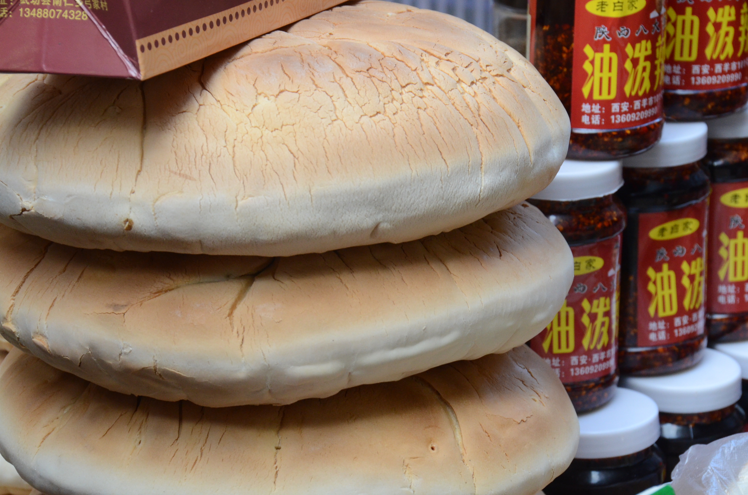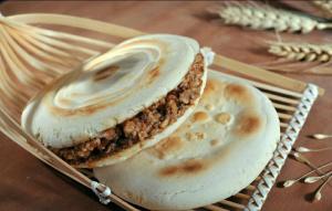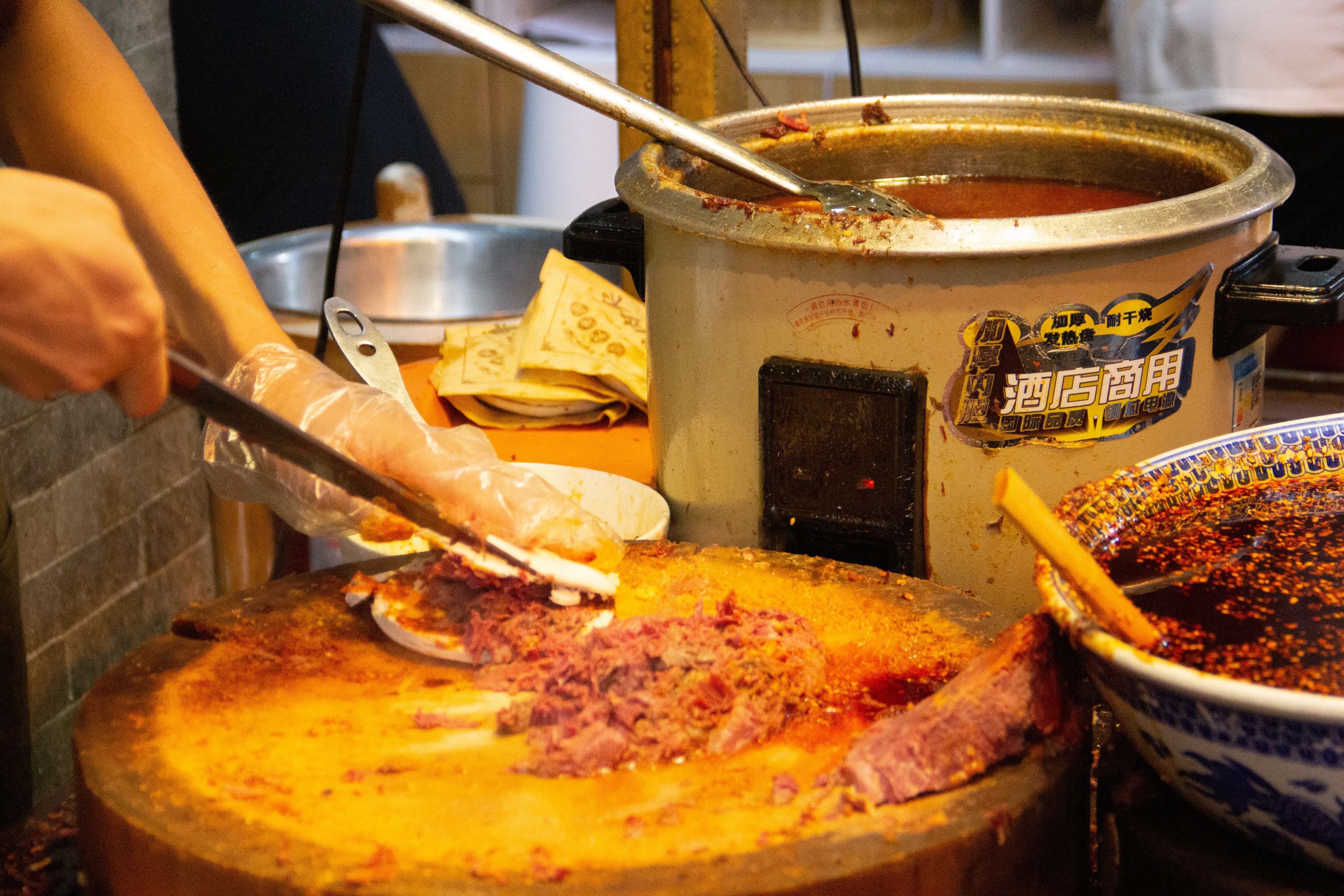 小吃,其实就是“肉夹于馍中”。通常用五花肉(大部分是猪肉,而回民街上的肉夹馍则全是牛肉)配20多种香料炖烂、切碎,再用正宗的白吉馍夹起来吃。