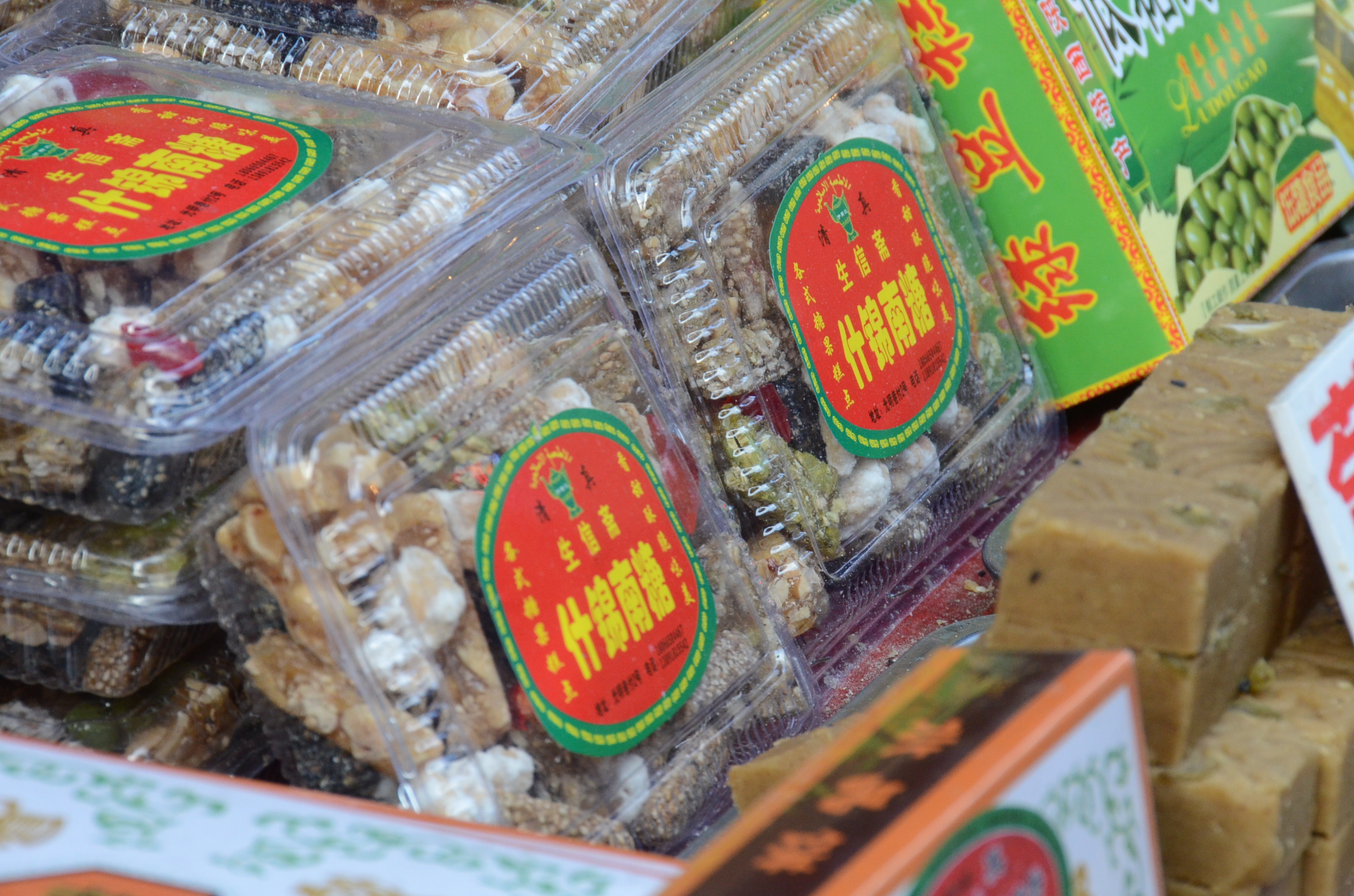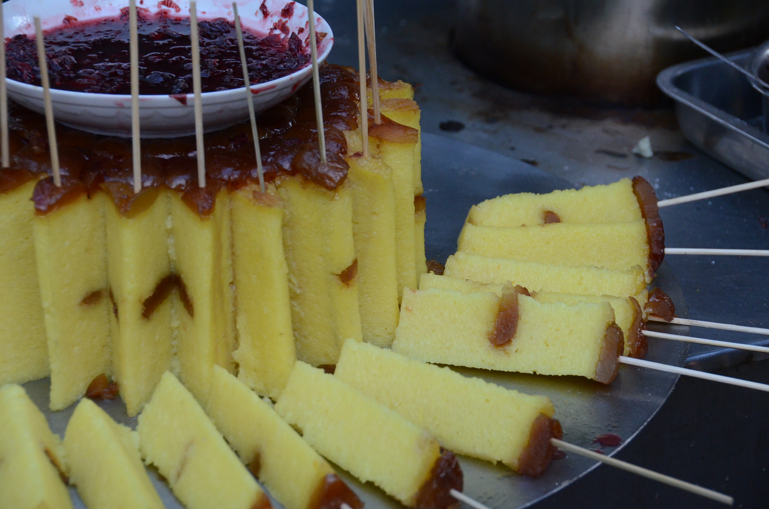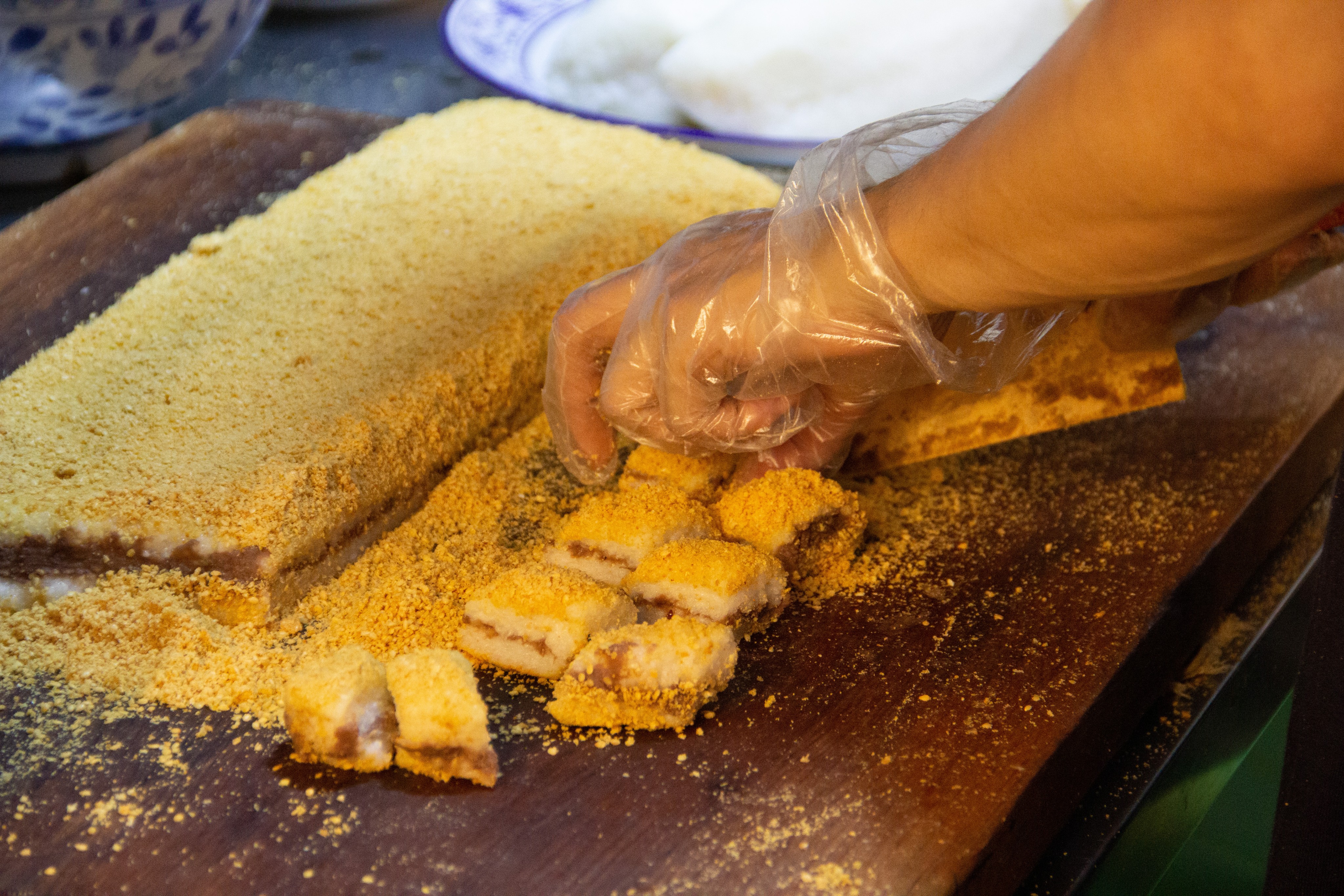 当地人童年记忆。以糯米粉为主料,从小蒸笼里取出巴掌大小的白糕,涂酱料,再裹上黑芝麻、花生碎等,插两根竹签,咬着吃。酱料有多种口味,蓝莓、山楂、巧克力等等,
