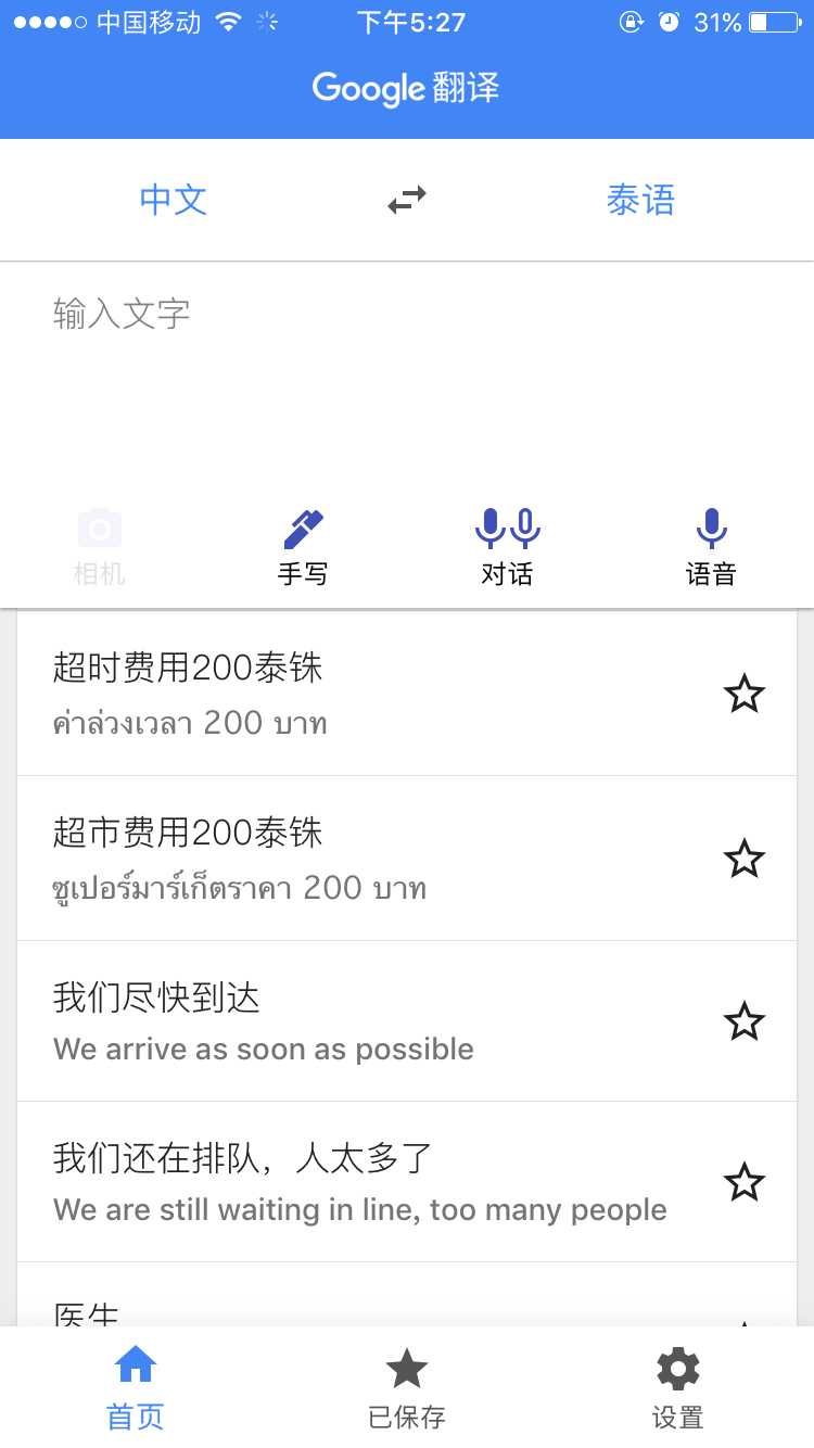 酒店无论国际星级酒店还是泰式特色酒店(这次去没有住民宿不晓得情况如何)前台都会简单中文,基本沟通肯定没问题,不得不说泰国服务意识超级强,为了赶飞机住机场附近的小酒店,前台就一个女生见我们拉行李箱进来立马跑出来接包端冷饮,还用不太熟练的中文告诉我们哪里有特色小吃哪里可以看景观怎么打车便宜……对比国内五星酒店前台我只想说“完美!”