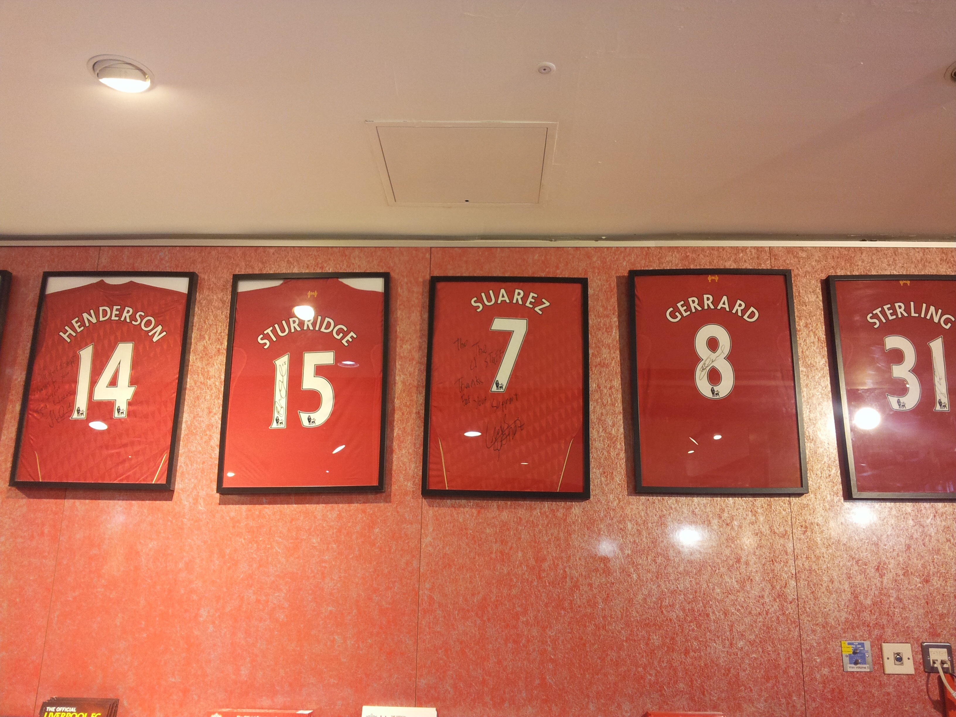 (一张利物浦球衣前面墙,14号亨德森和31号斯特林都作为英格兰球队主力参加了本次世界杯,中间的苏亚雷斯代表乌拉圭参加了本次世界杯)