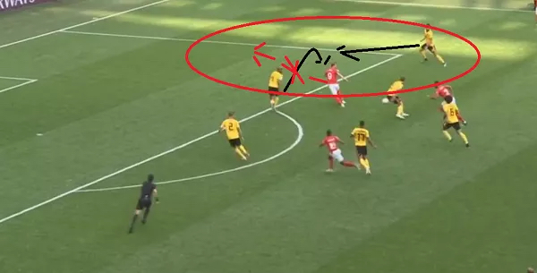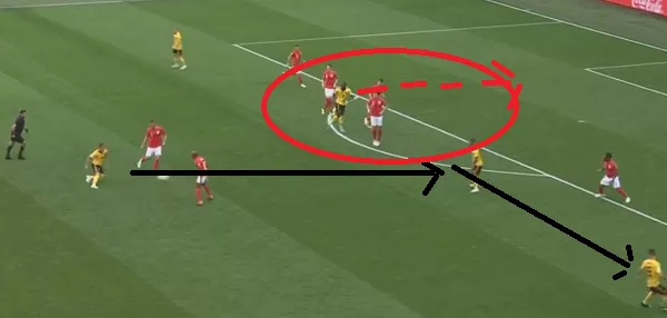 比利时的反击传切打得虎虎生风,尤其针对英格兰两翼插上后的肋部空档,中路给左路斜线套边简直打一个成一个,英格兰除了没命地跑形成禁区里人数优势,什么都做不了。
