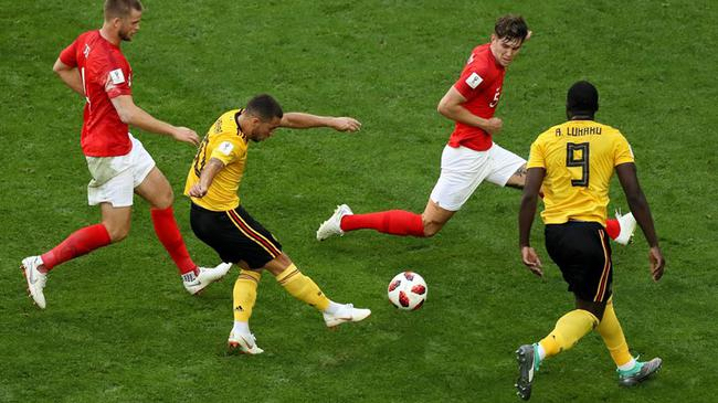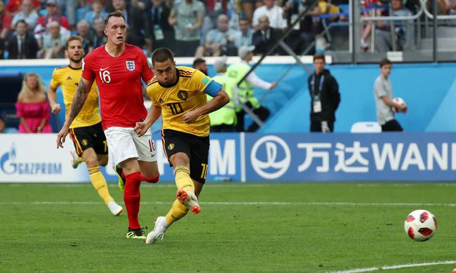 上半场30分钟到40分钟,比利时控球在脚,把英格兰压在半场。阿扎尔游走中路,跟维特塞尔们玩倒脚,英格兰全队紧绷身体,亦步亦趋,就像学生踢足球似的,做好基本功,咬住每一步,看阿扎尔如看毒蛇。