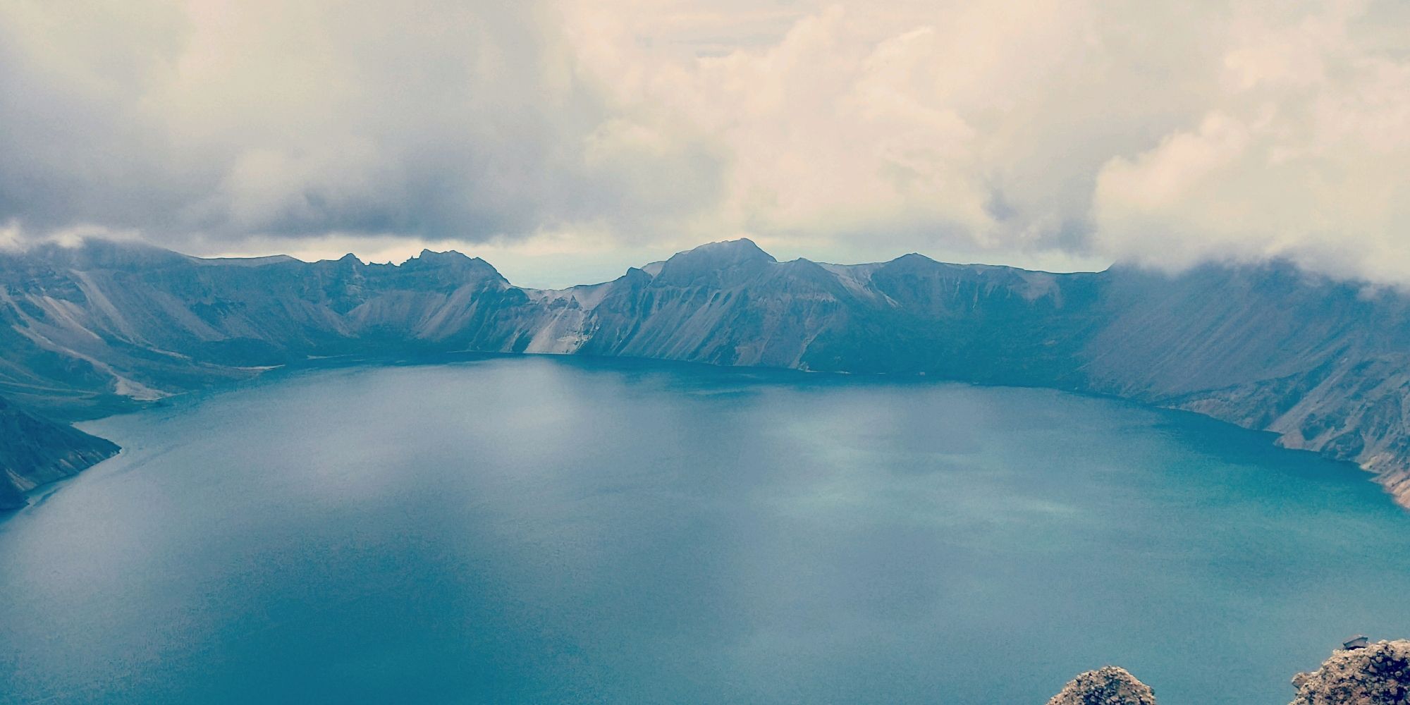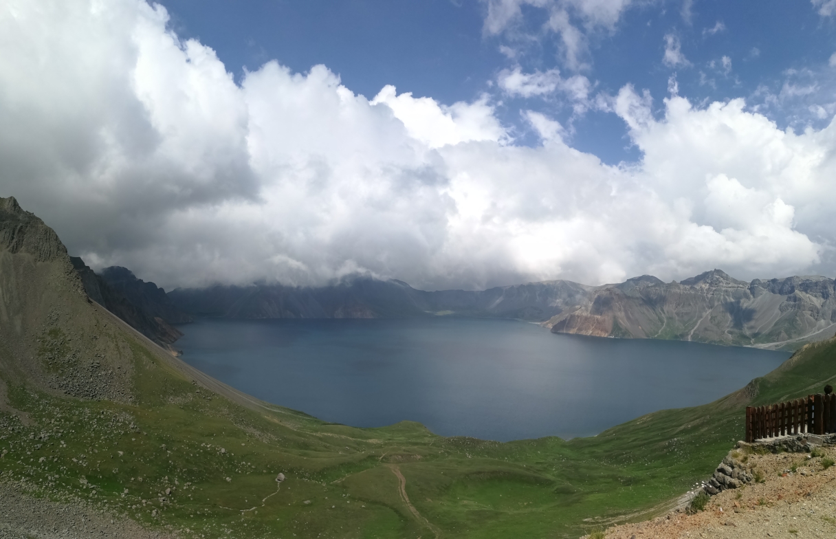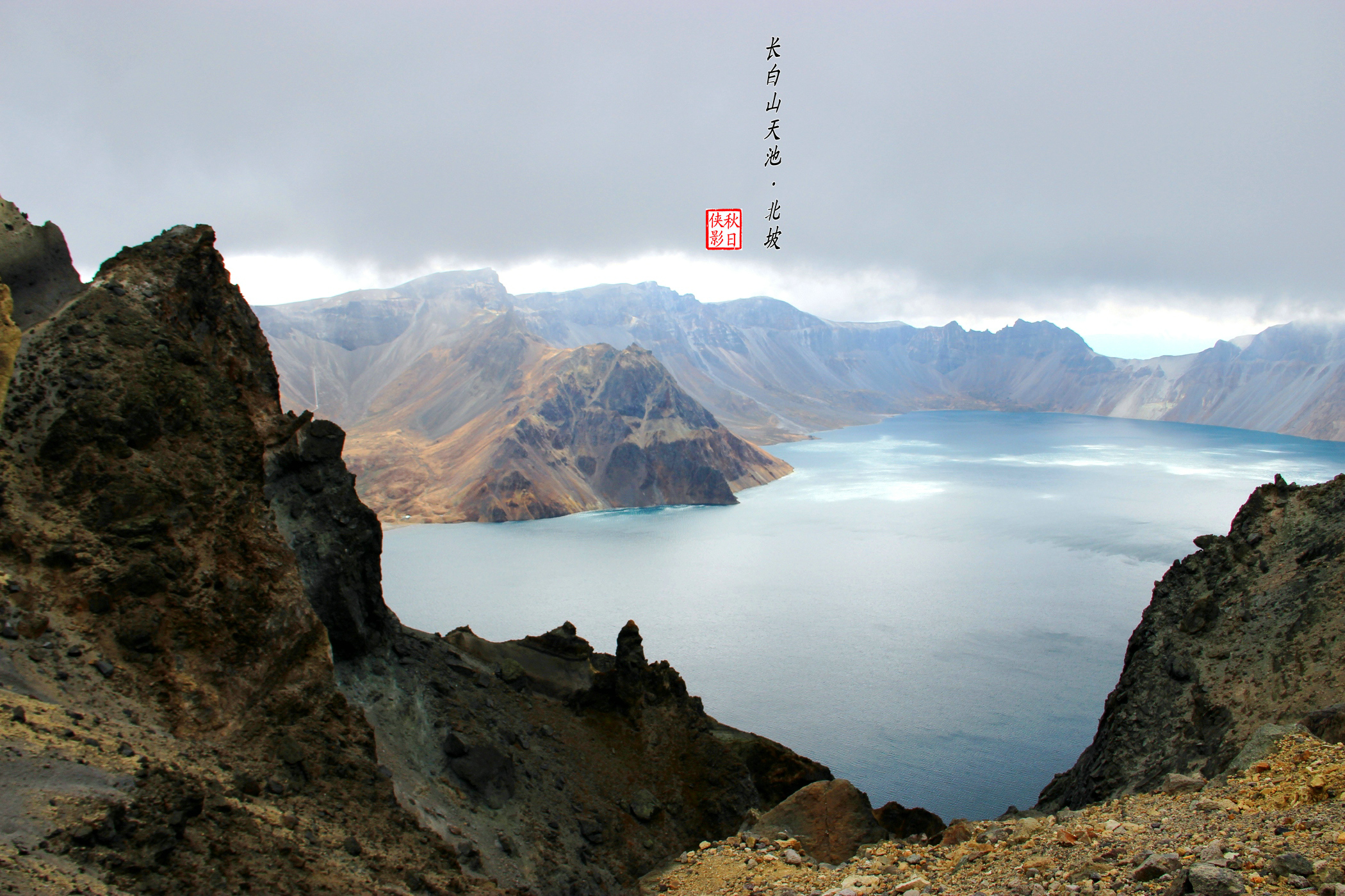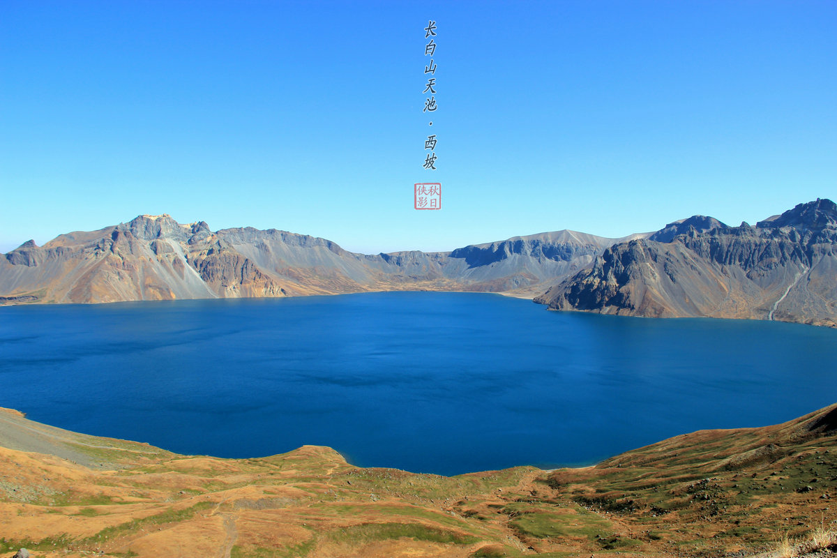 长白山天池,北坡陡峭险峻,西坡委婉秀丽,南坡磅礴大气。