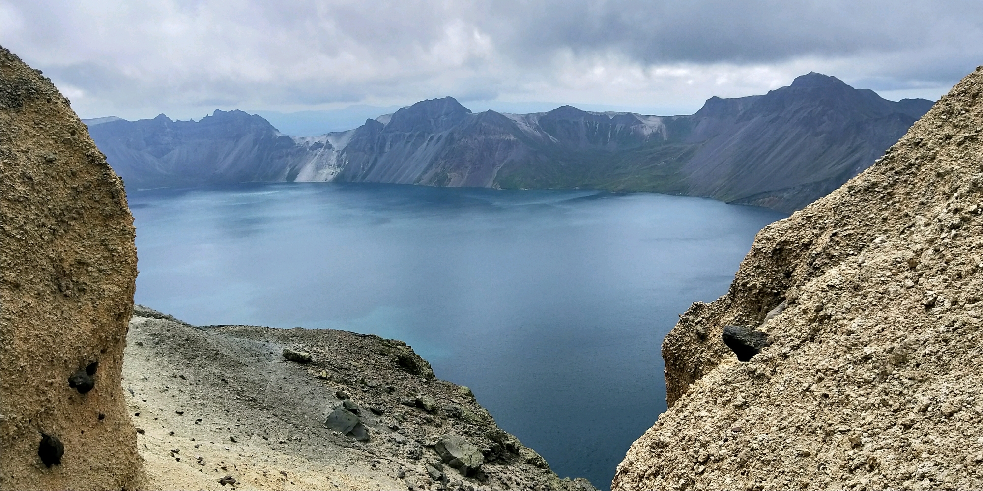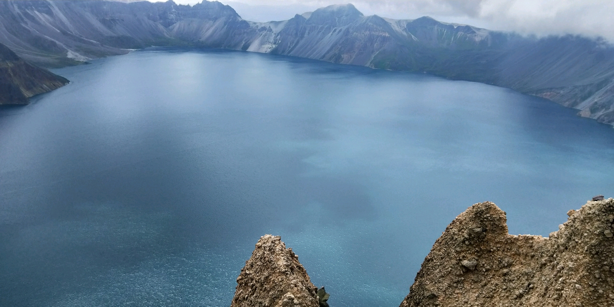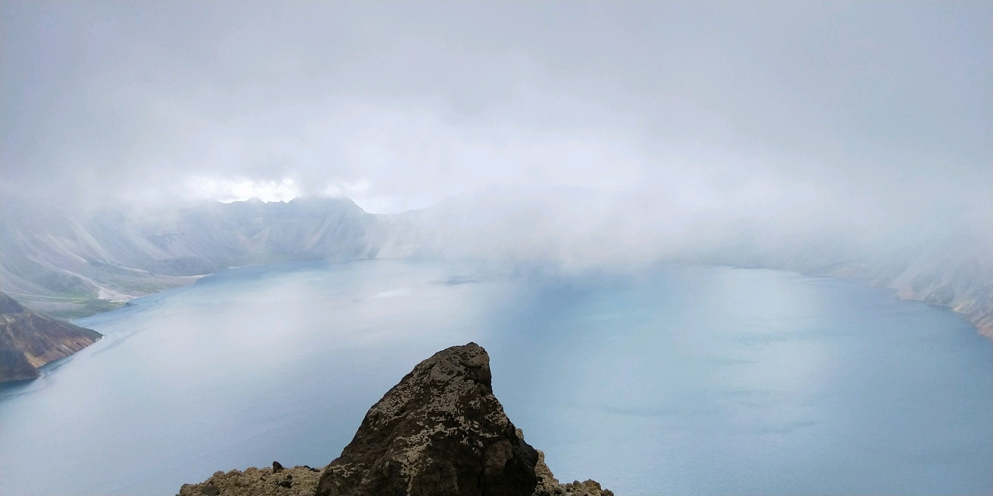 长白山天池,北坡陡峭险峻,西坡委婉秀丽,南坡磅礴大气。