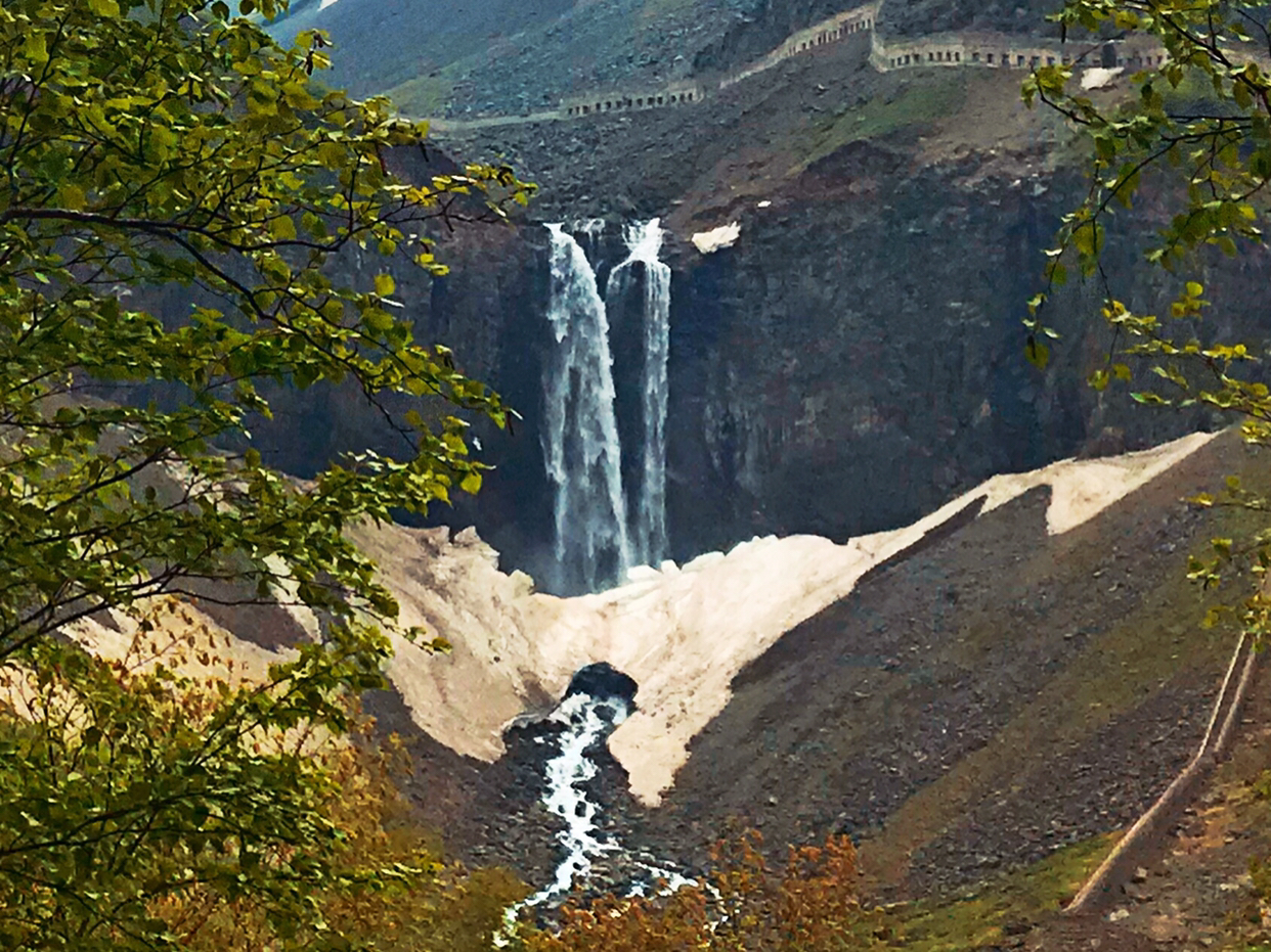 泉水飞泻在磐石上,经过两次跌落再汇成巨流,由悬崖直泻谷底,总高约70米。水声震谷,惊心动魄。这种阶梯式的瀑布,也称双叠瀑布,很有特色。