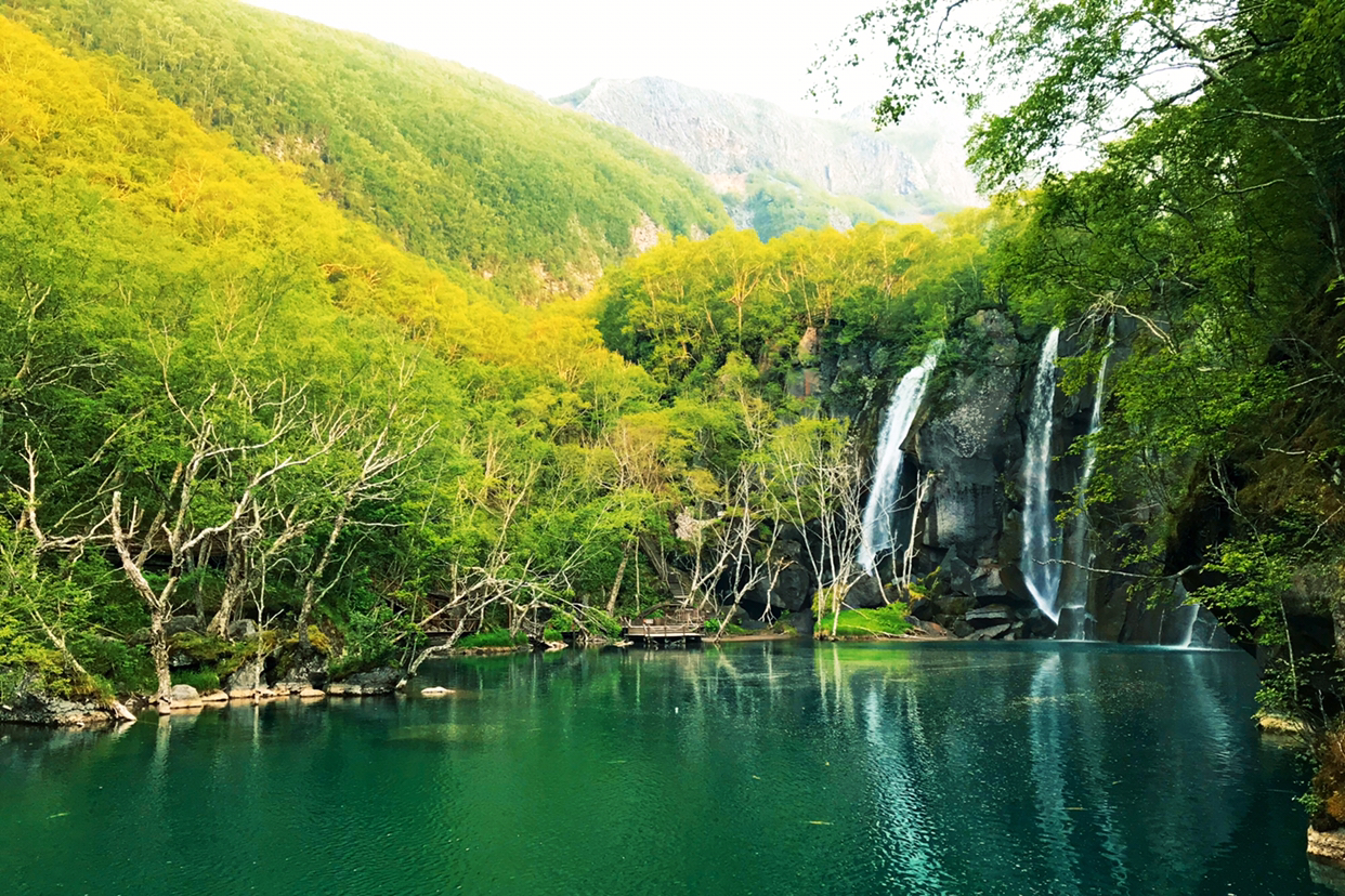 因池水碧绿深窘而得名。绿渊潭瀑布飞流直下,最高落差答26米,瀑水落于巨石而四溅,而后落入深潭。潭上水雾弥漫,与高山岳桦、旷古巨石浑然一体,美不胜收,恰似人间仙境。