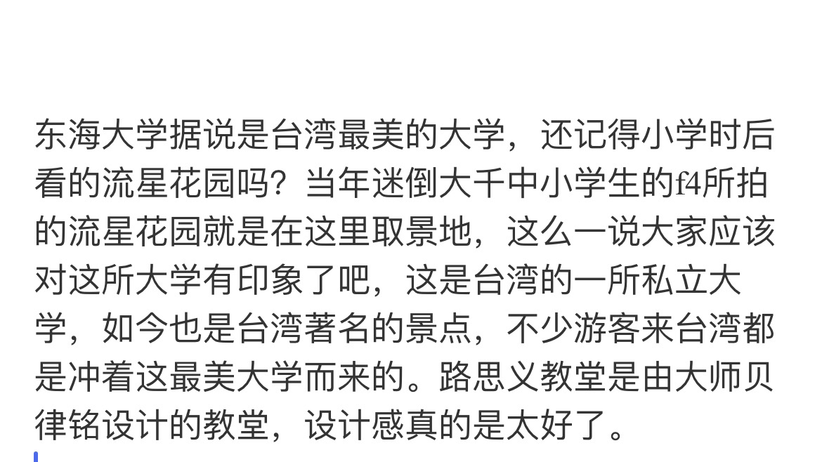 谢谢邀请东海大学有台湾最美校园的美誉,正如厦门大学相当的位置,校园里面植被覆盖面积大,校园里面有自己的牧场,运气好的话还能看到牧场里面的奶牛,里面有一个牛奶屋,可以试试学校自己做的冰淇淋,酸奶还有小点心等,冰棍还是不错的。教堂的话平时没看到有人能进去,大家都是在外面观看,========== ...显示全部