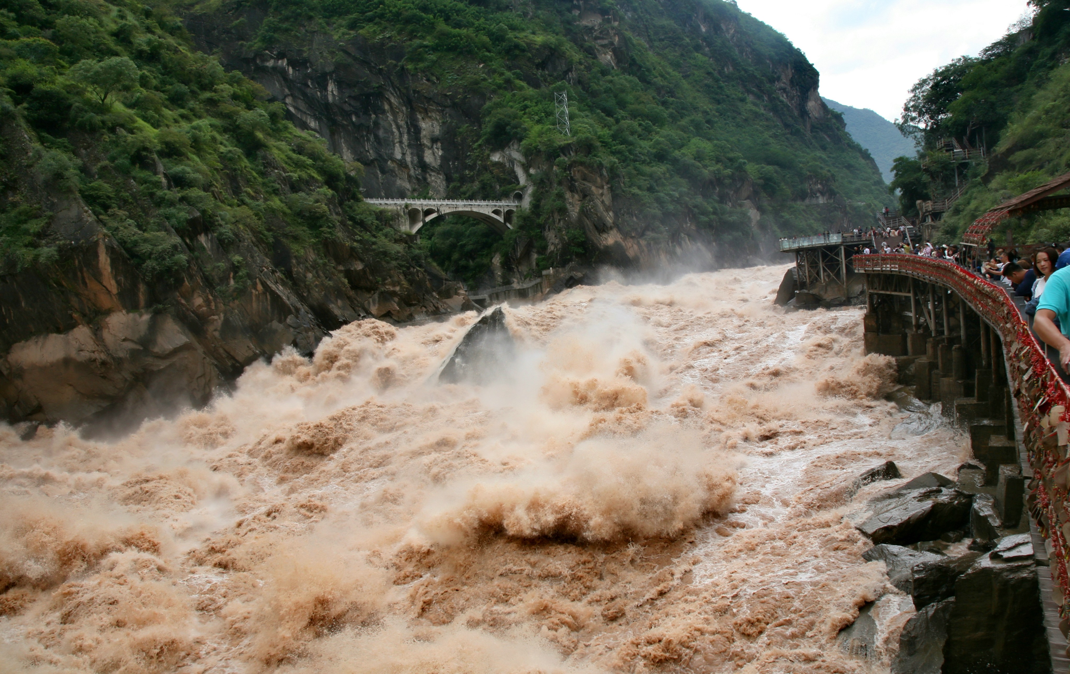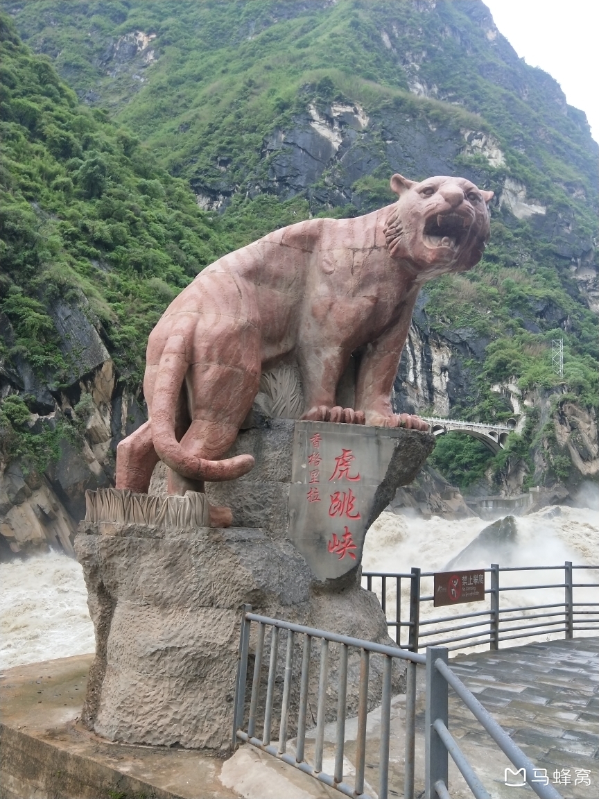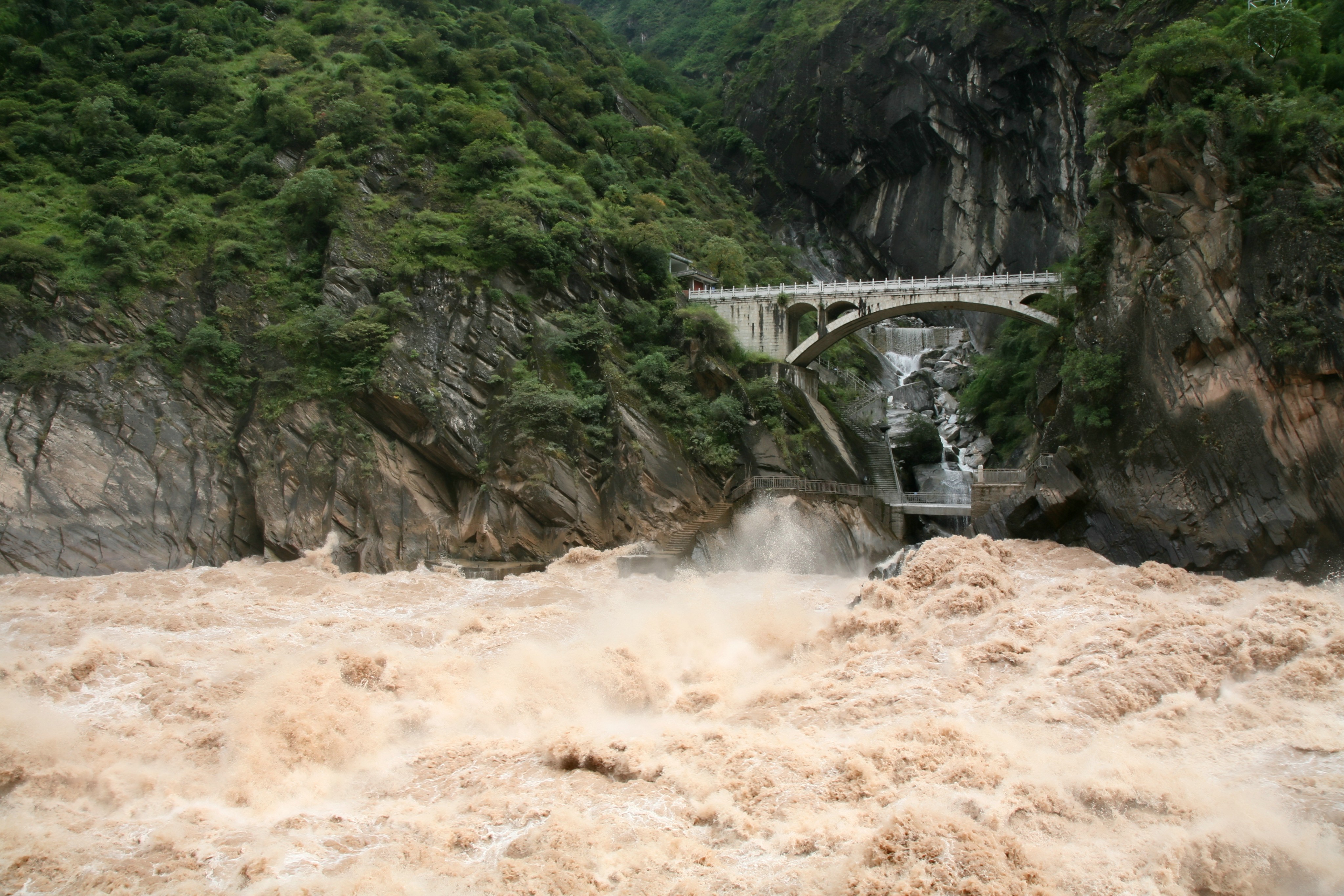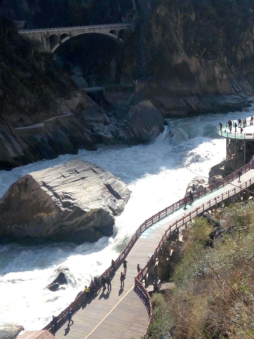 ,波涛汹涌,犹如万马奔腾,急流的江水从上而下冲击在虎跳石上飞起2米高的浪花,场景震憾而壮观,随后顺着弯的峡谷一泻千里。