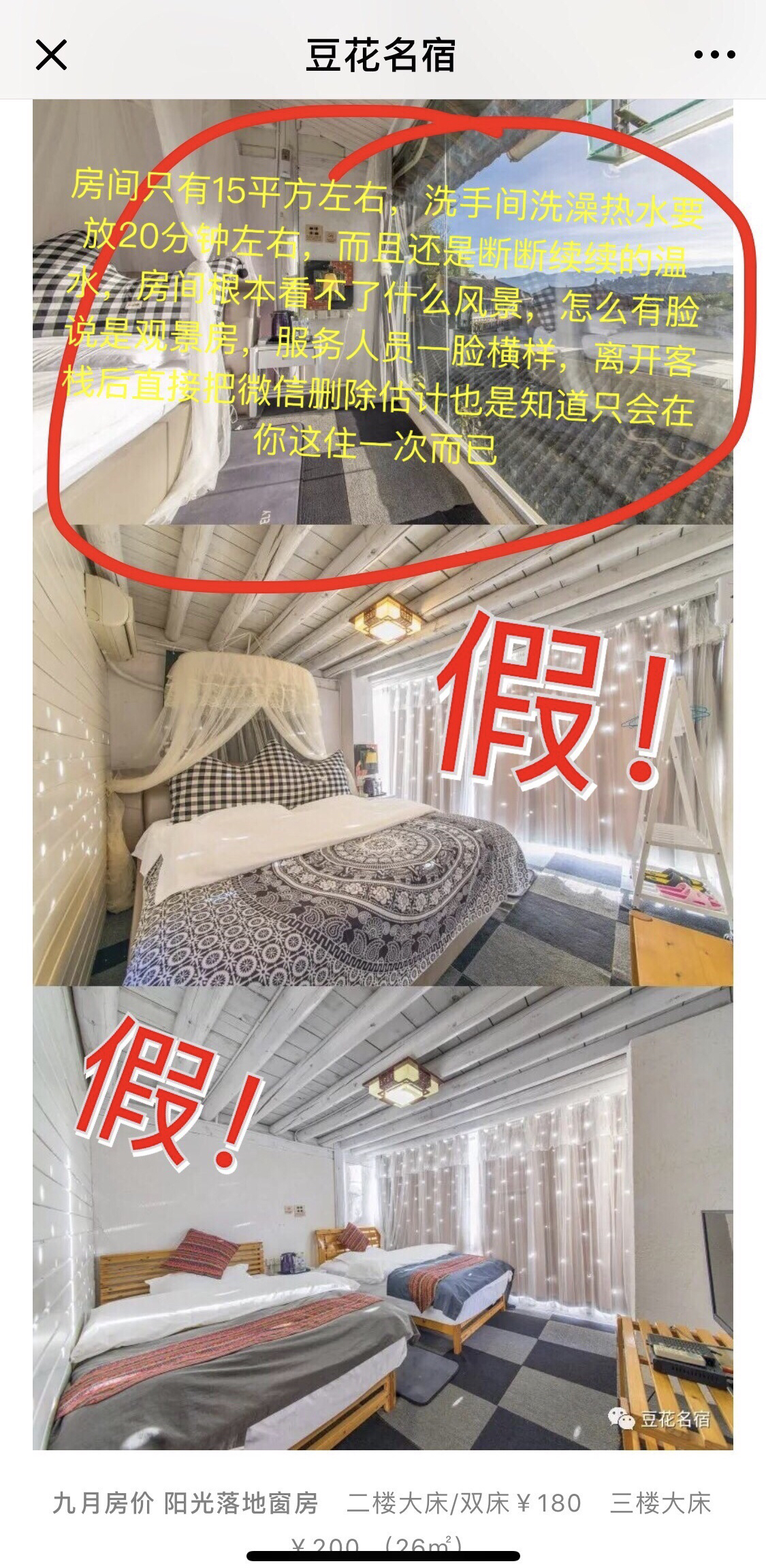云南的豆花名宿纯属坑人,客服很拽,扬言丽江的民宿多亏了他们,另外洗手间热水必须提前放20分钟才有温水,房间透风,狭小,总之性价比完全不如微博宣传的,虚假宣传的不行,而且不敢挂在APP上怕得差评,微信订房还要提前付一半的房费,离店后直接把客人微信拉黑,呵呵了,垃圾!劝诫大家不要定,丽江太多优秀的...显示全部