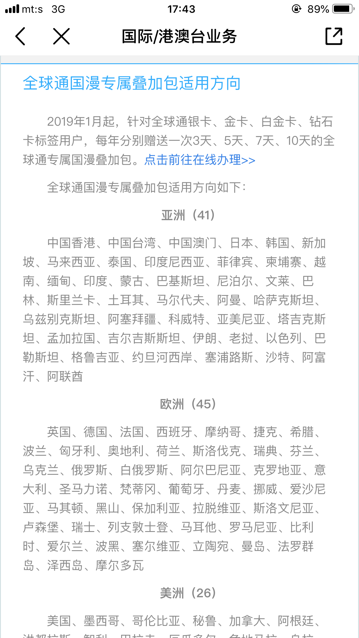 如果是移动全球通用户,全球通银卡、金卡、白金卡、钻石卡标签用户,每年分别赠送一次3天、5天、7天、10天的全球通专属国漫游,184和国家可以使用,其中包含这个国家,我现在就用的这个真心方便,不用换卡,10天免费,一般机场 ,酒店,餐厅都有,所以够用========== 如果你觉得TA的回答不...显示全部