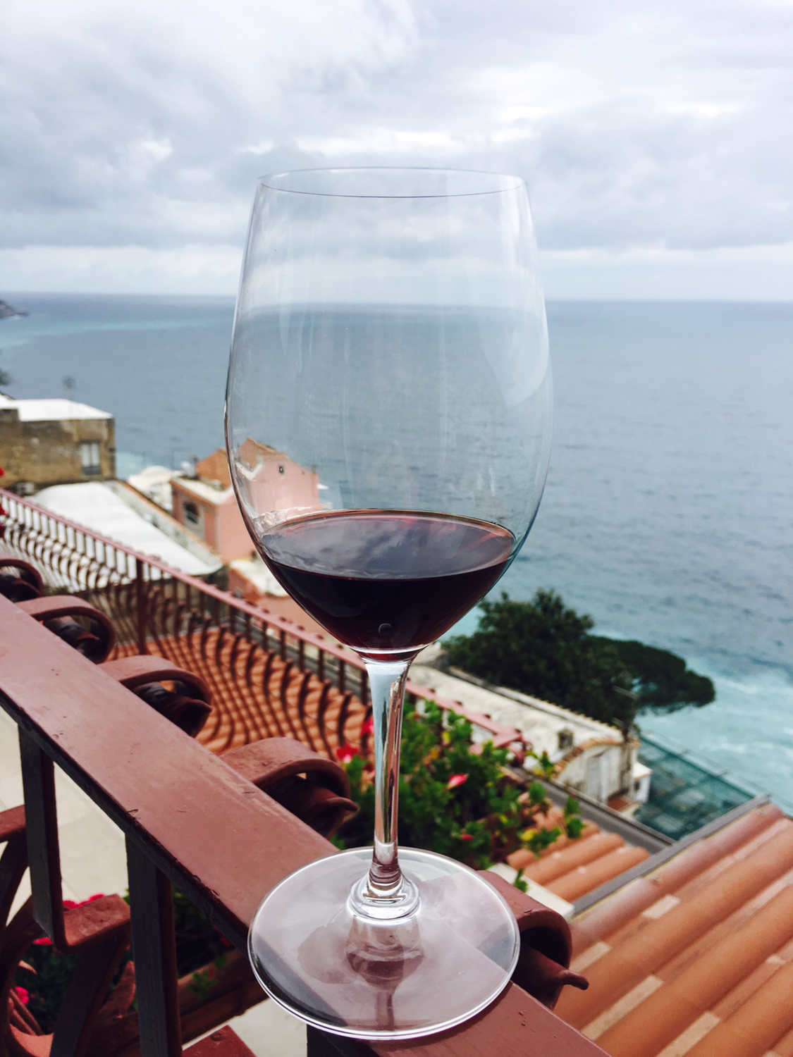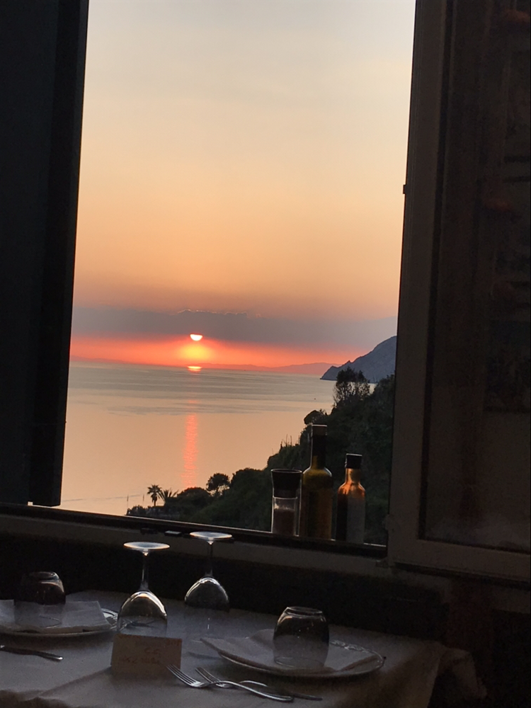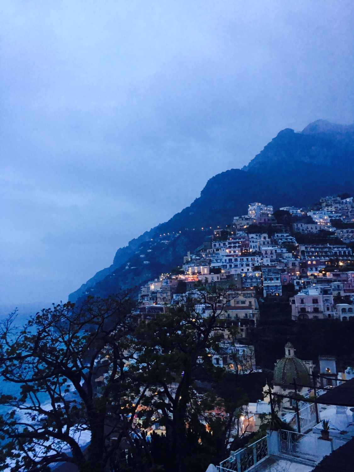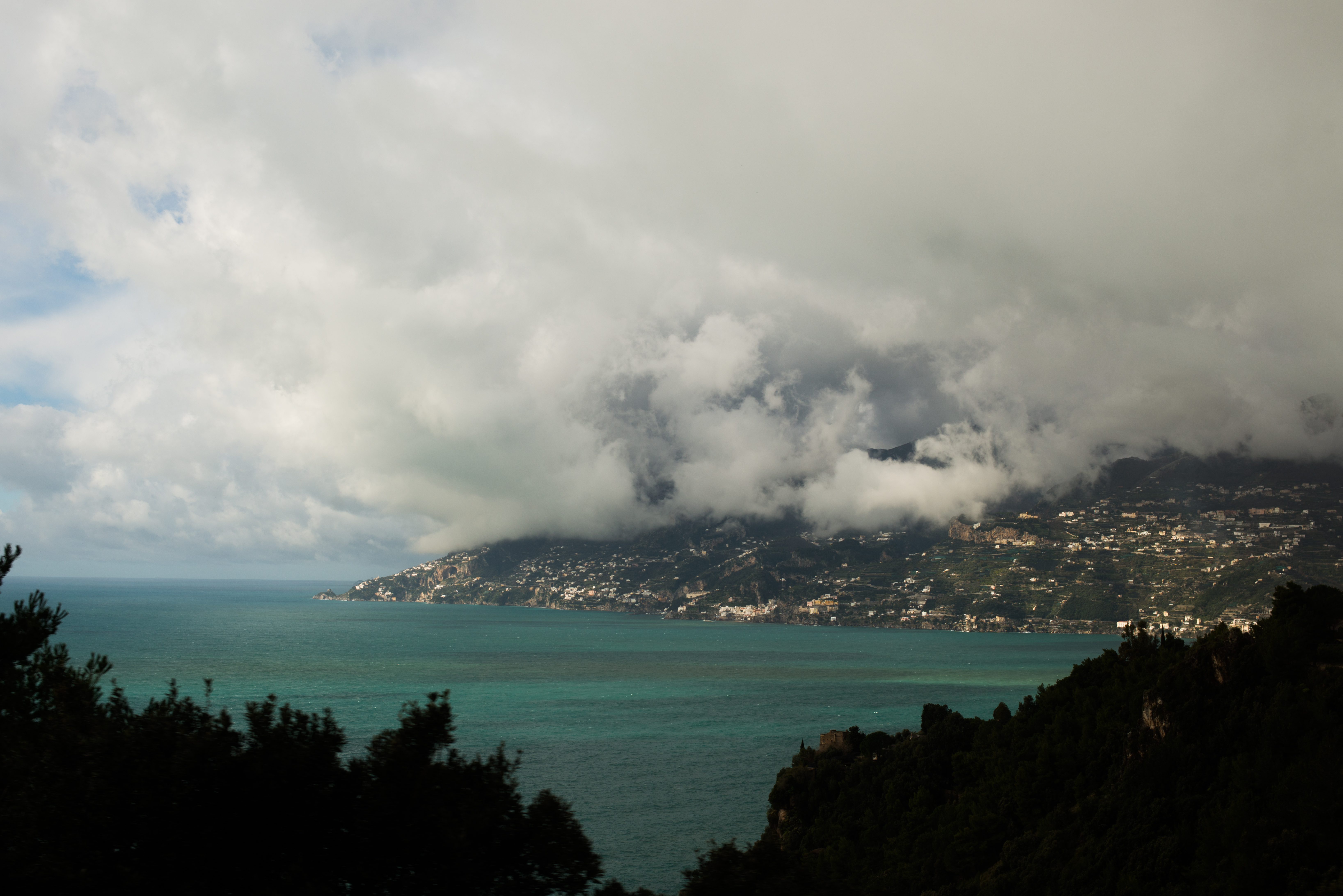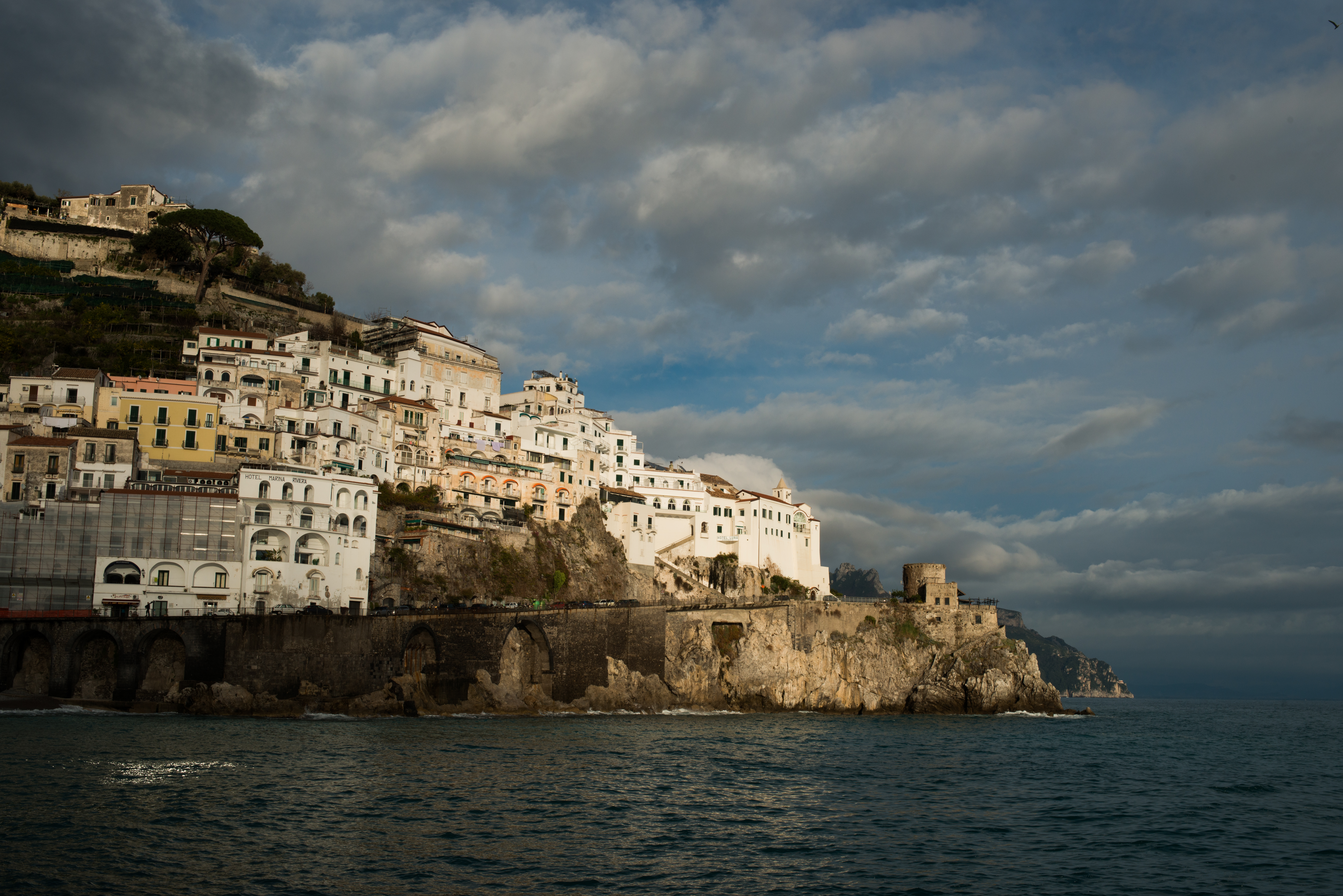 最后一抹夕阳照在阿玛尔菲小镇的古堡上