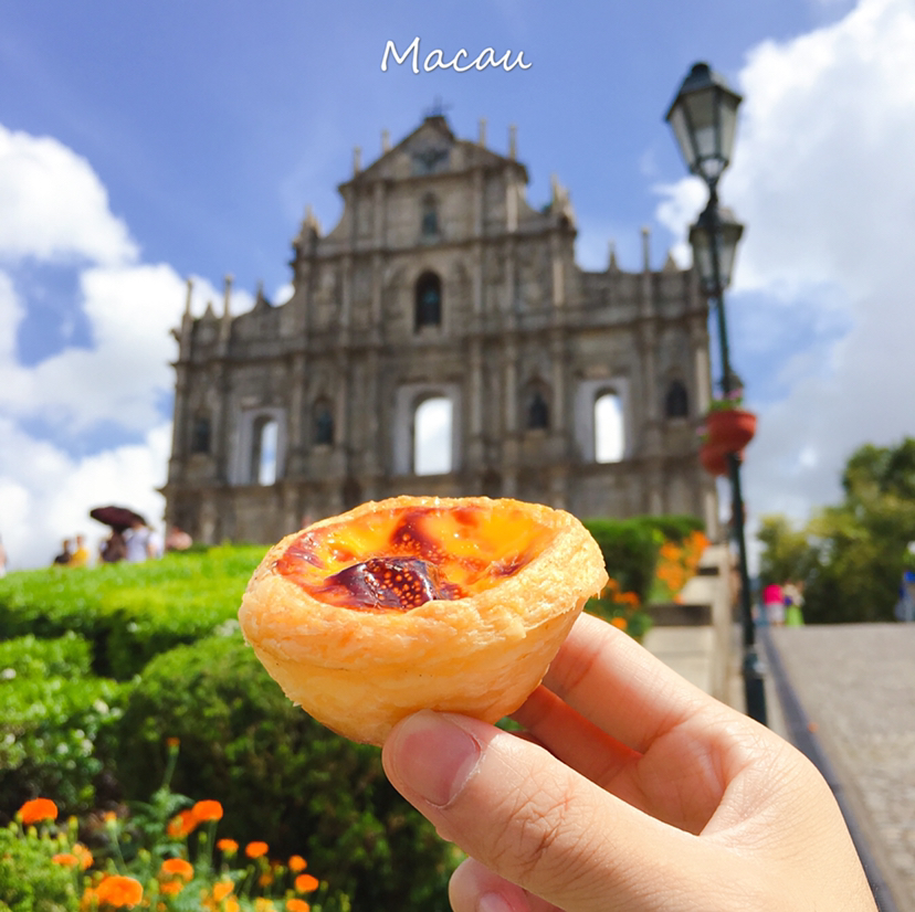 大三巴牌坊是天主之母教堂前壁遗址,教堂在1835年失火被毁仅剩正面前壁、大部分地基以及教堂前的石阶,本地人因教堂前壁形似中国传统牌坊,将之称为大三巴牌坊。拿着蛋挞对着大三巴拍摄,可以避开人流,出大片。