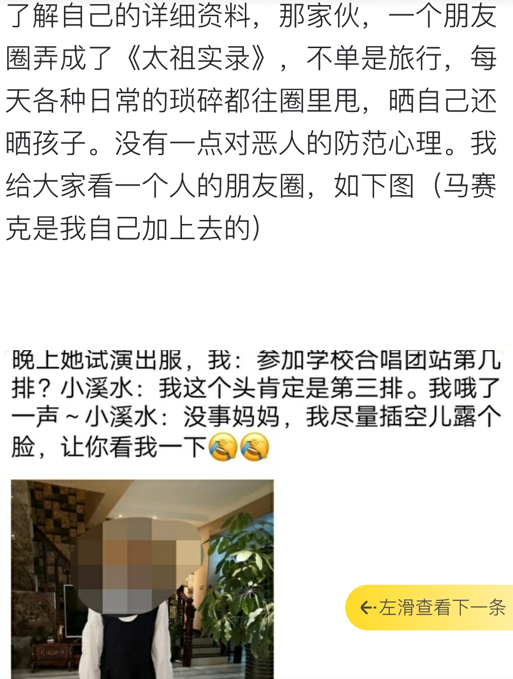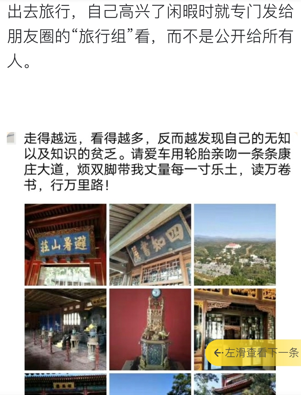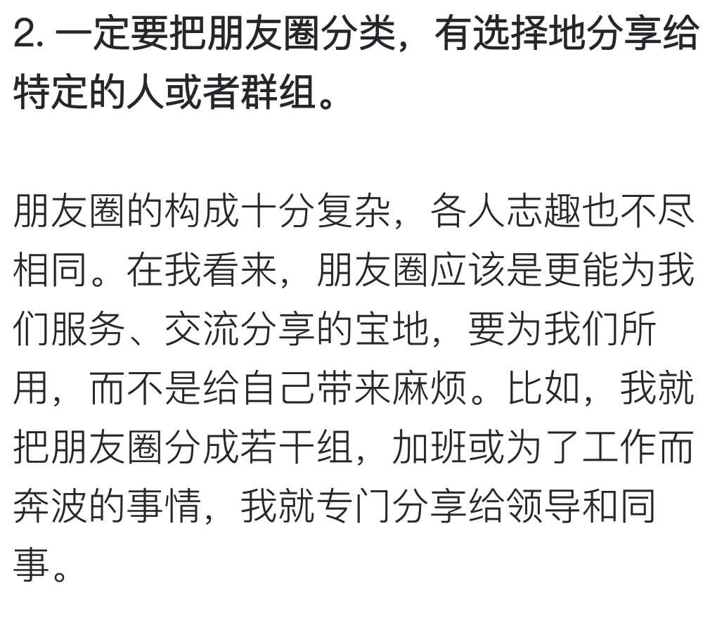 还是原来的观点,人要分圈子,不要乱发朋友圈。朋友圈里不都是朋友,是个微缩社会。记得超赞答主这一期问题的留言中,有一个好像是学生模样的蜂友说“这样做人是不是太累了”,看完我摇了摇头,心说毕竟是个孩子,还毛嫩,没吃过亏。开始不打算搭理,但作为老师,最大的职业病就是喜欢教育大小一切孩子。我举个例子说,那你大可以不考虑一切,比如你请假出去旅游,期间你大发特发旅行照片而不分组,你领导、老师、同学都能看到,你说后果会怎样?他没回复我。但愿这孩子能成长一些吧。
