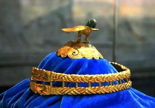匈奴王冠是黄金制成的,重1394克,是迄今发现的唯一一件匈奴单于金冠。金冠由金鹰和冠带两部分组成,上面浮雕有羊和狼的图案,雄鹰站在半球形金冠顶上,俯视着冠带上狼与羊搏斗的情景。