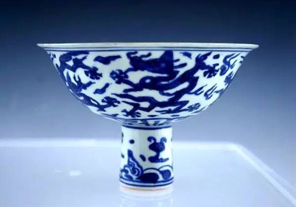 纹高足碗,侈口,深腹。高圈足上有三道凸弦纹,呈竹节状。口沿为青花唐草纹。内壁暗花印行龙二条。外壁用青花绘一游龙,并衬以火焰纹。青花色泽青翠浓艳,线条流畅有力,堪称元代青花瓷器中的珍品。