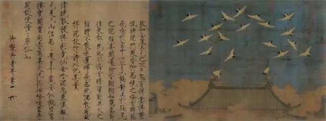 《瑞鹤图》是赵佶书画中的珍品,难得的是诗、书、画具为上乘之作。图中描绘了鹤群盘旋于宫殿之上的壮观景象。绘画技法精妙绝伦,图中群鹤如云似雾,姿态百变,各具特色。