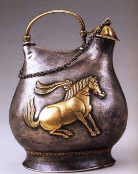 壶的造型采用的是我国北方游牧民族皮囊的形状,壶身为扁圆形,一端开有竖筒状的小口,上面置有覆莲瓣式的壶盖,壶顶有银链和弓形的壶柄相连,这种形制,既便于外出骑猎携带,又便于日常生活使用,表现了唐代工匠在设计上的独具匠心。银壶的两侧采用凸纹工艺各塑造出一匹奋首鼓尾、跃然起舞的骏马。