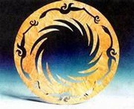 太阳神鸟金饰属商代晚期作品,整器呈圆形,器身极薄。整个图案似一幅现代剪纸作品,线条简练流畅,极富韵律,充满强烈的动感,富有极强的象征意义和极大的想象空间,该器生动的再现了远古人类“金鸟负日”的神话传说故事,四只神鸟围绕着旋转的太阳飞翔,周而复始,循环往复,生生不息,体现了远古人类对太阳及鸟的强烈崇拜,表达了古蜀人对生命和运动的讴歌。
