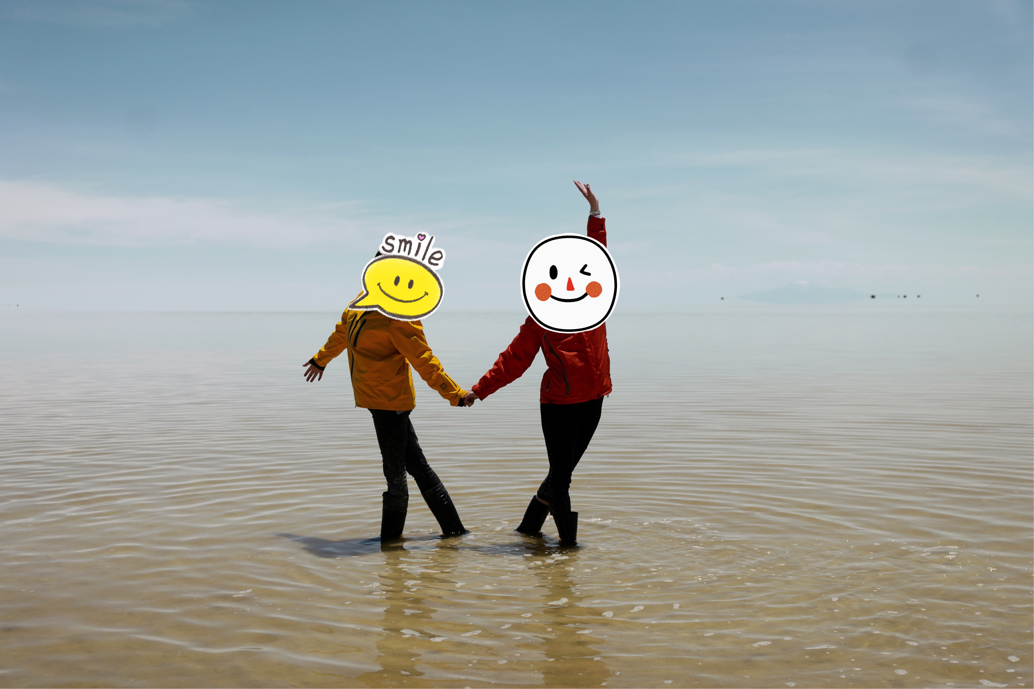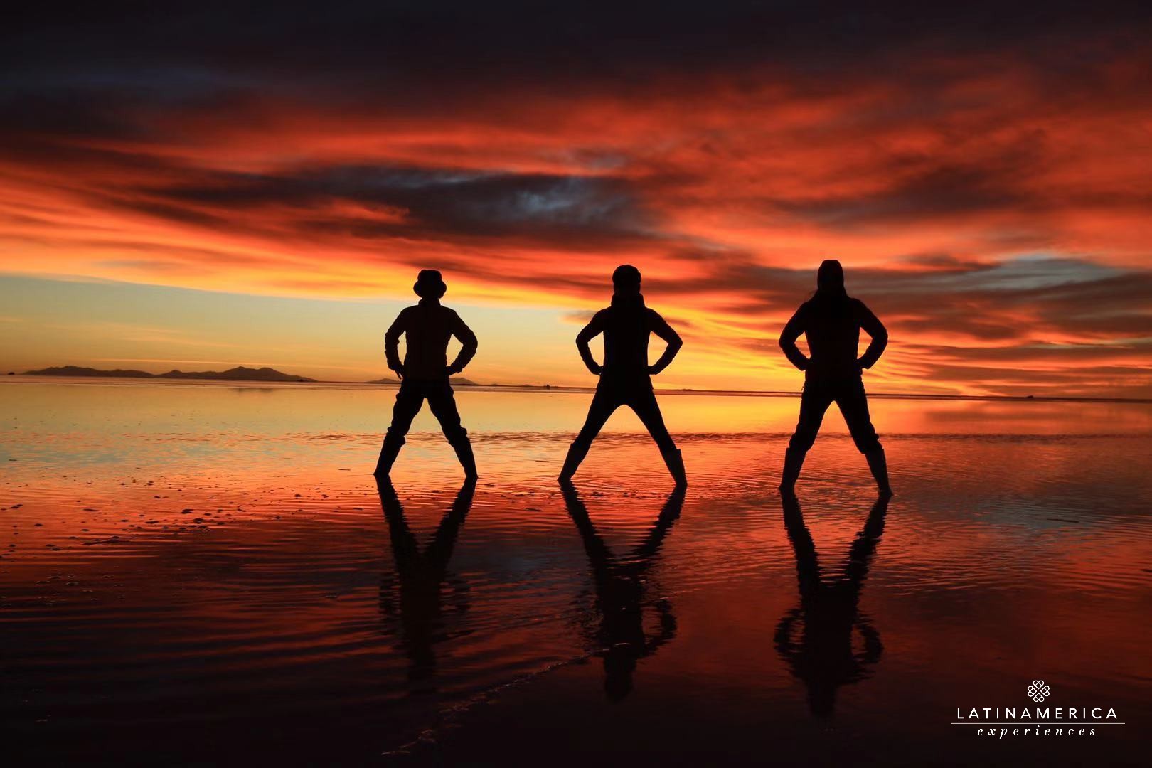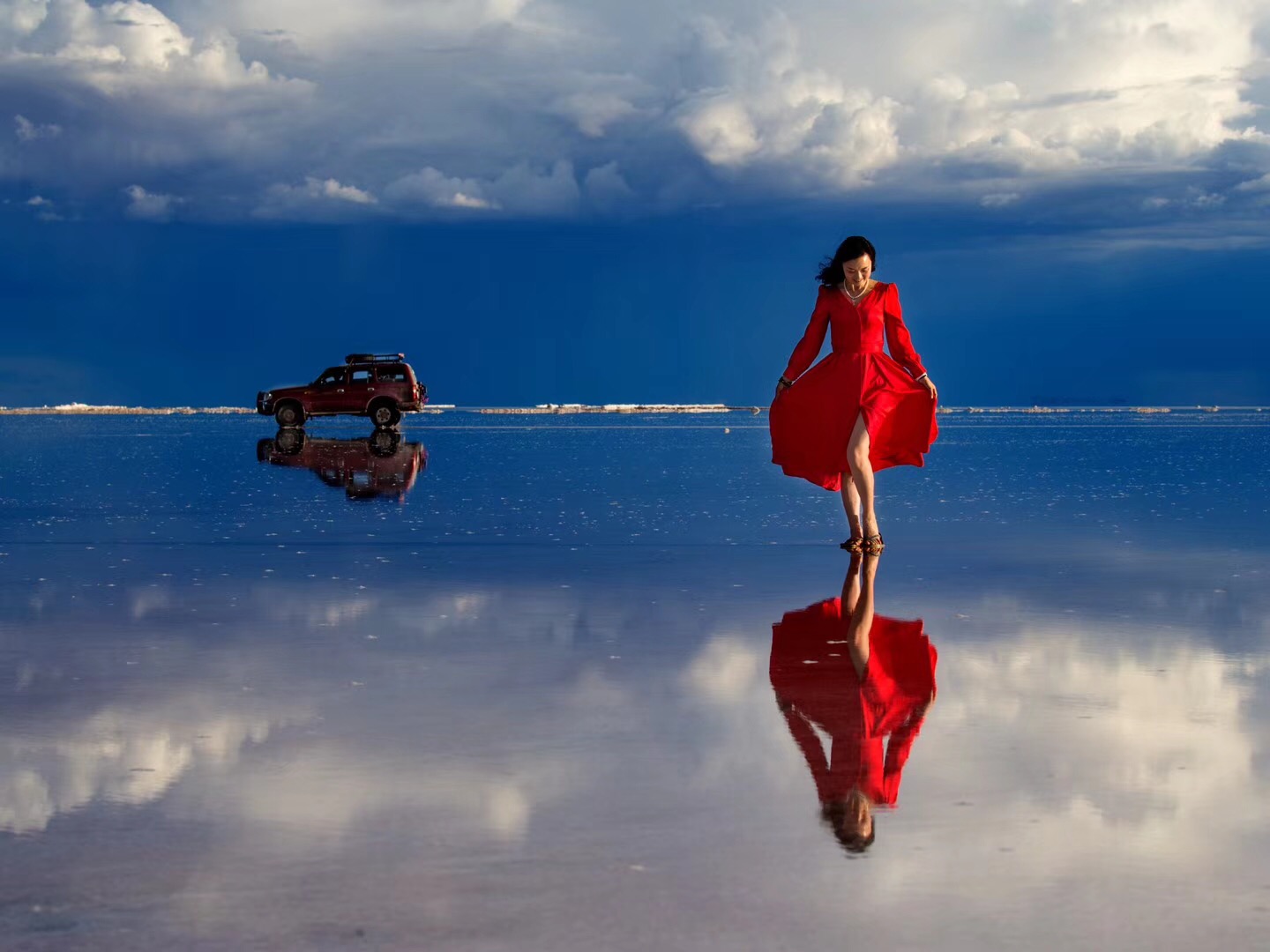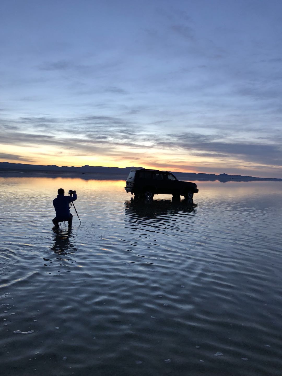 之后就是“镜面”时间。从阳光明媚的上午到到日落时分,广阔的天空之镜是最美的摄影背景。妙趣横生的错位摄影、各种姿势的摆拍,或在盐湖中的一段舞蹈,都可以成为美好的影像记忆。趁着晚霞最美之时,深入