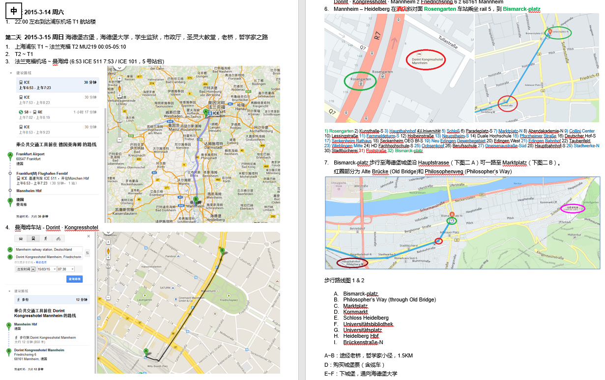 然后就是交通等等了。我一个人去德国出差,因为怕自己人生地不熟但是又希望可以借此机会自己去逛逛,所以对于出行的交通、步行的路线等,实现都做了详尽的查询以避免迷路(我一般不太问路的,都靠自己琢磨地图摸索,所以基本上也没有迷过路)。