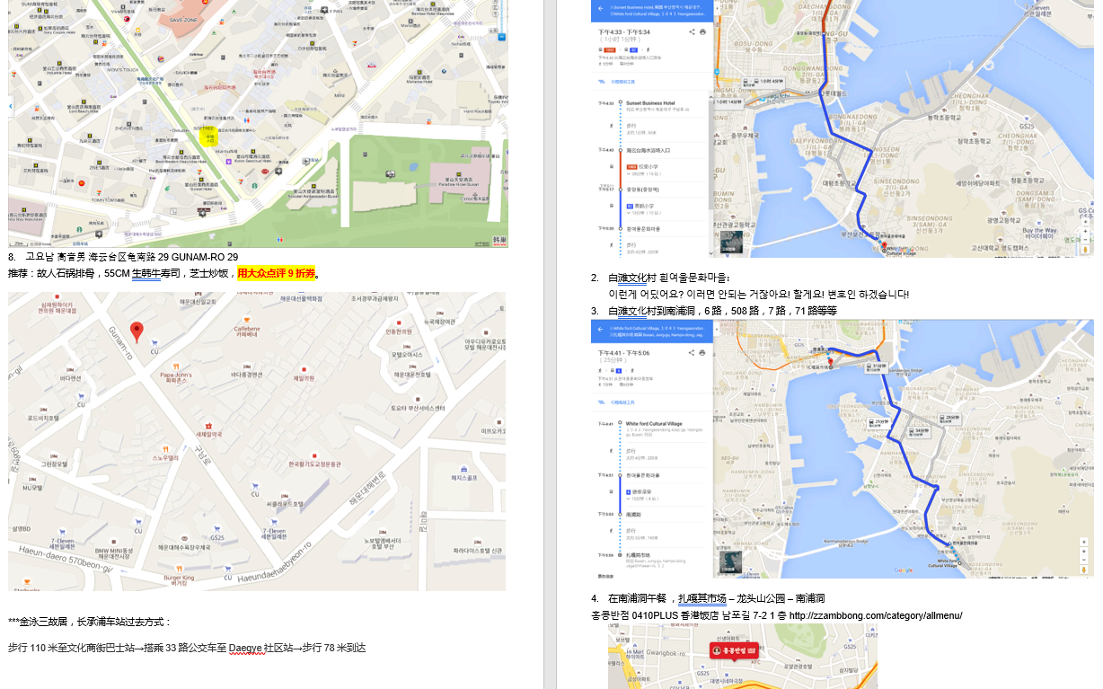 当然有时候你会觉得单靠地图路线还是会迷惘,那就需要自己花功夫找一些去过的人po的实景照片给你一些提示、启发了。下图是我找的网上有的朋友po的去韩国镇海看樱花的步行路线以及吃饭地儿的照片,借鉴来放在了我的攻略里。