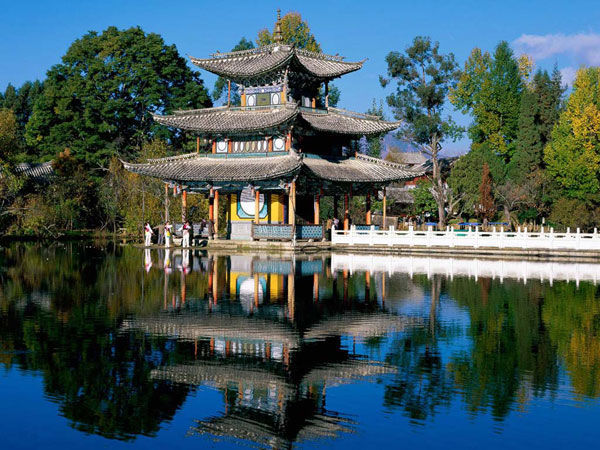黑龙潭:又名玉泉公园,位于城北象山脚下,从古城四方街沿经纬纵横的玉河溯流而上,约行一公里有一处晶莹清澈的泉潭,即为中外闻名的黑龙潭。它始建于乾隆二年(1737),其后乾隆六十年、光绪十八年均有重修记载。旧名玉泉龙王庙,因获清嘉庆、光绪两朝皇帝敕封“龙神”而得名,后改称黑龙潭。潭水从石缝间涌涌喷出,依山斛清泉汇成四万平方米潭面。四周山清水秀,柳暗花明。依山傍水造型优美的古建筑点缀其间。其流韵溢彩,常引人驻足留连。