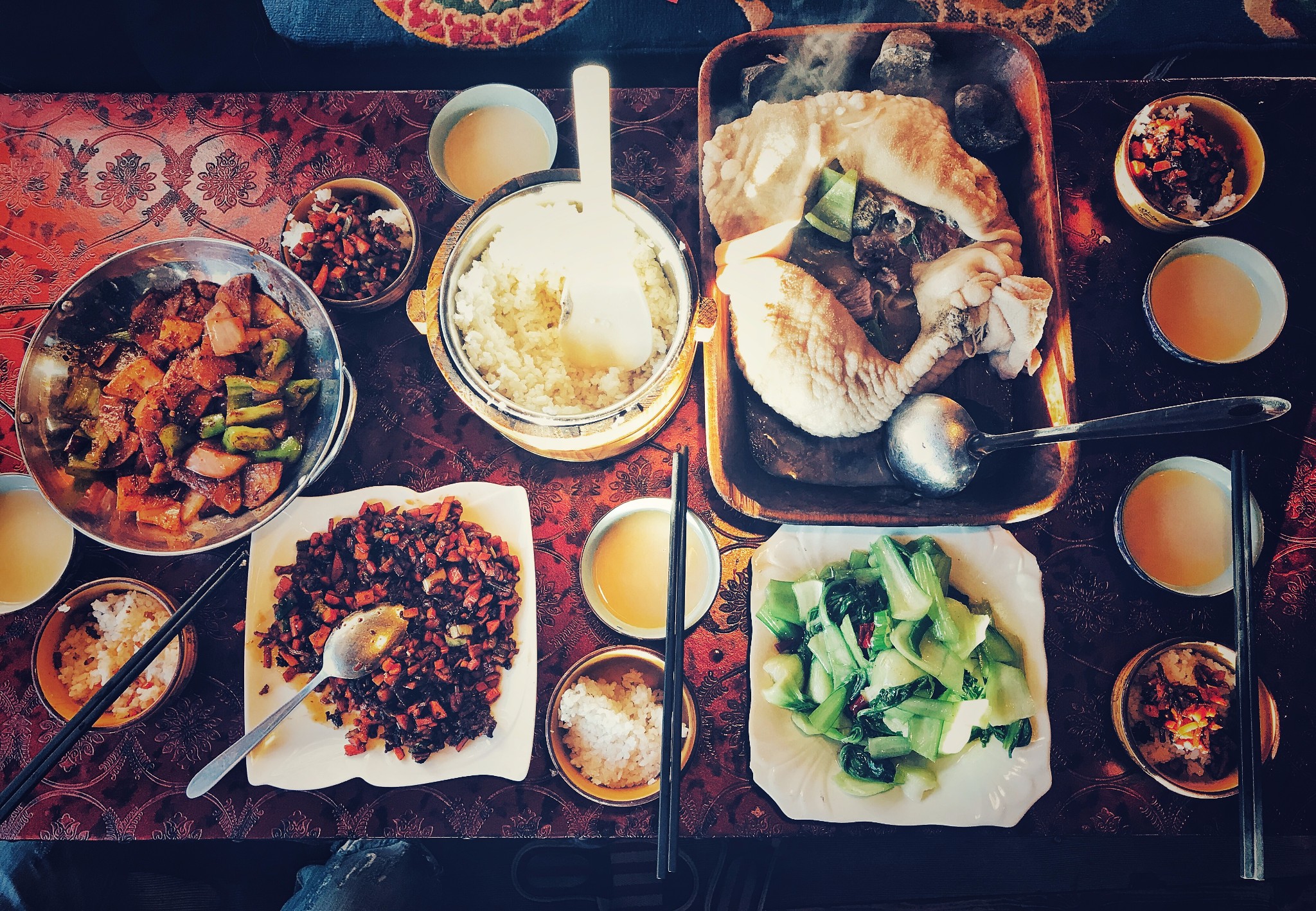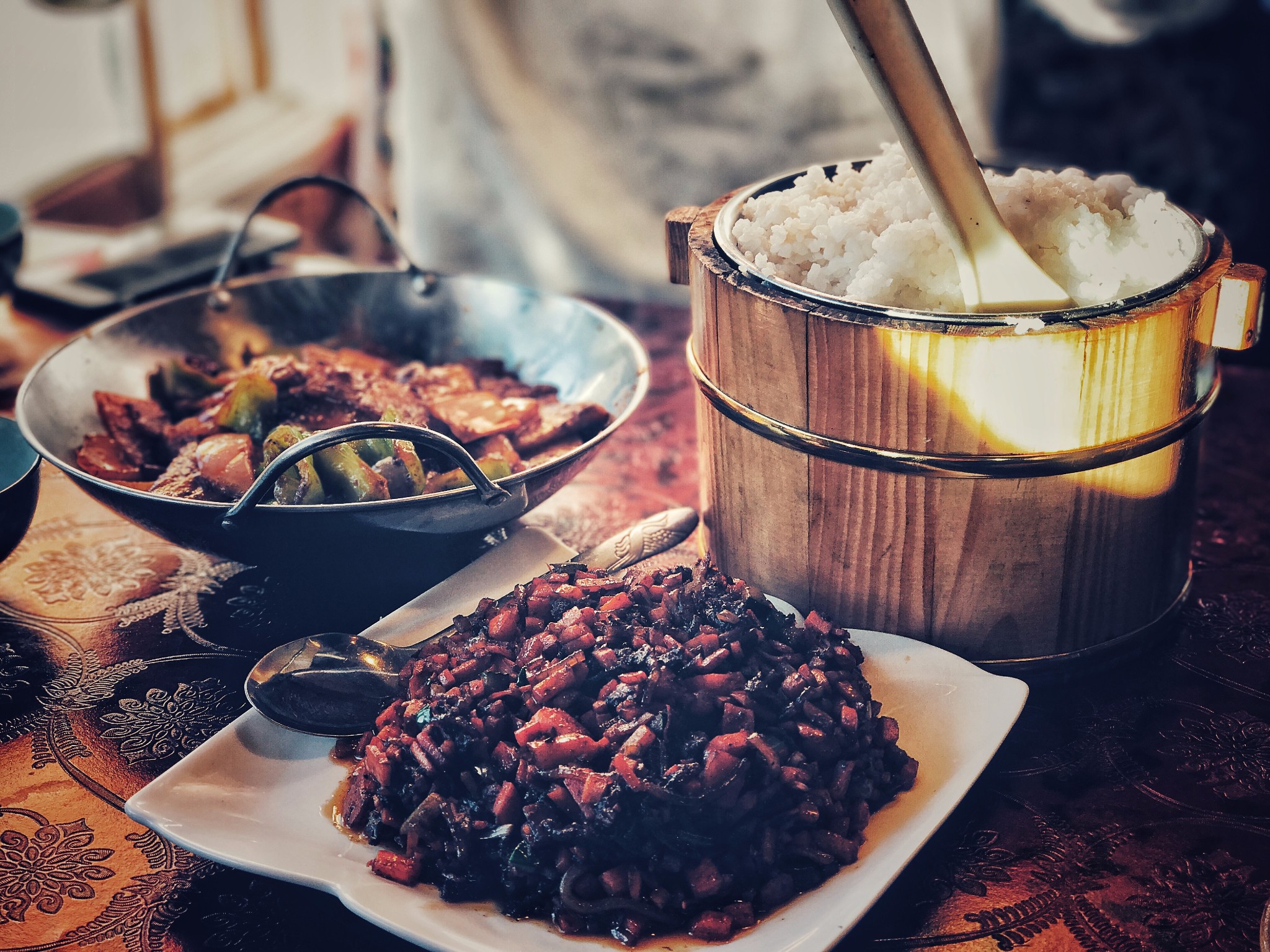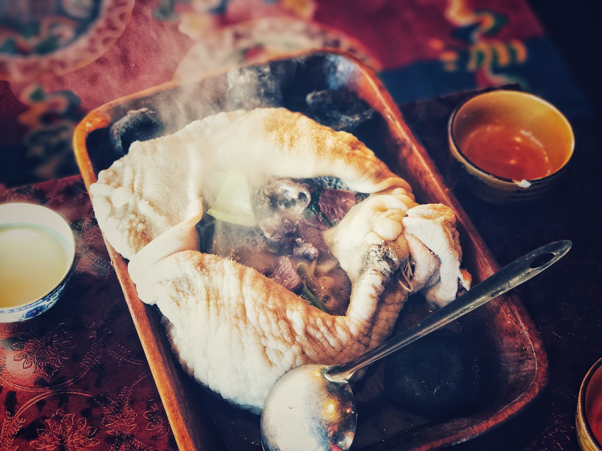 郎木寺5个人点了4个菜,石烹羊肉,干锅土豆片,炒青菜,藏饭,一瓶酥油茶