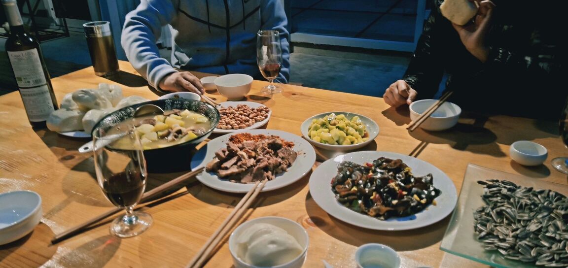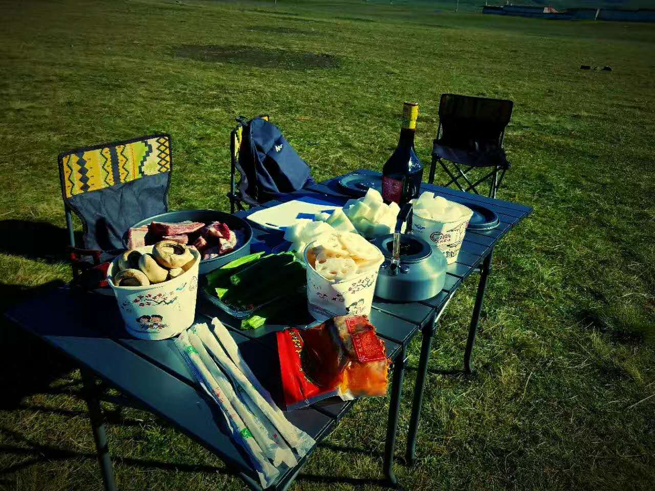 若尔盖热尔大草原晚餐我们定了老板的烤羊腿(200元一个)我们也自带了一点牦牛肉让老板帮我们烤,还有凉菜,当然草原烧酒也是不能少的,喝了暖暖的。