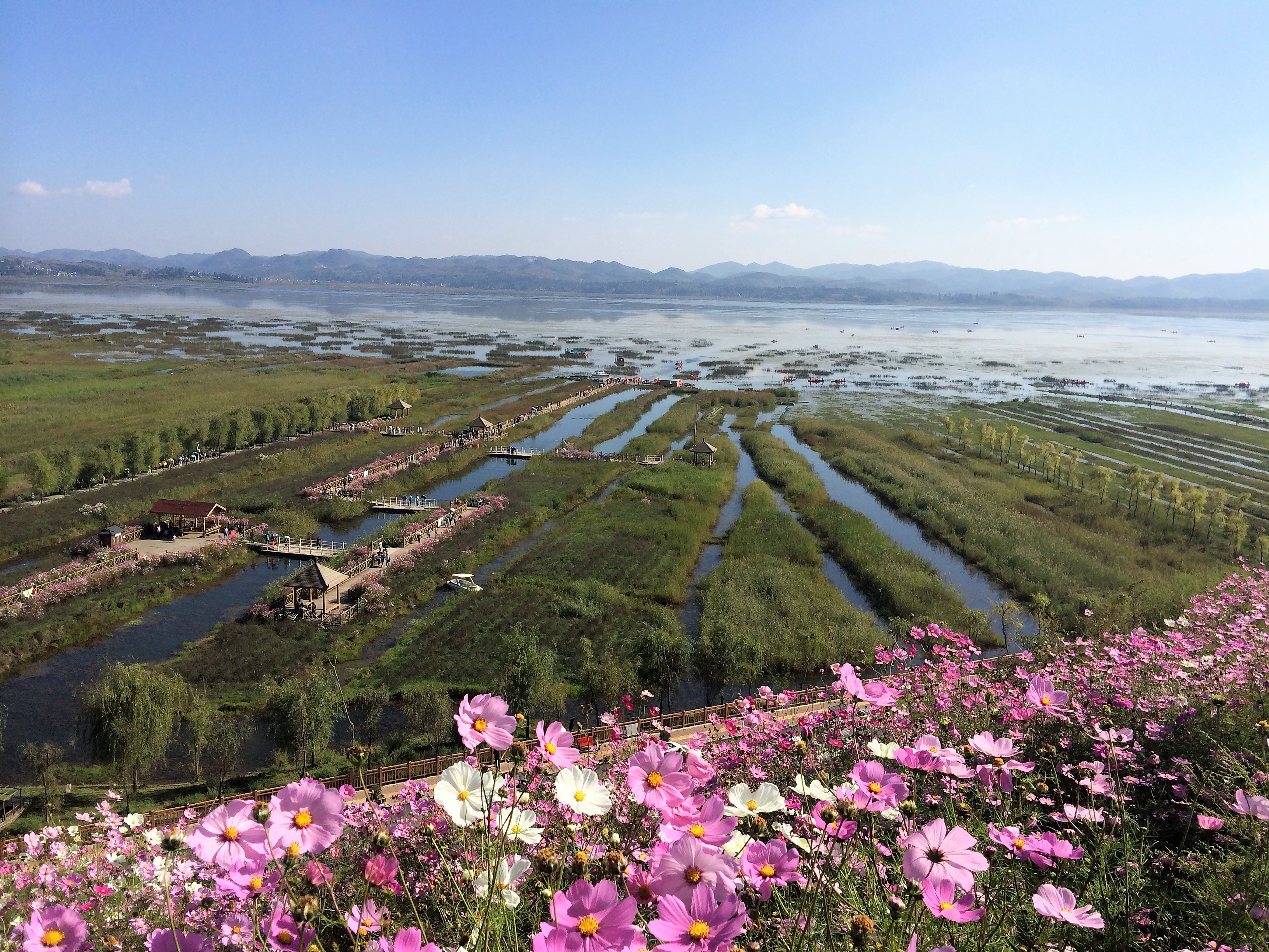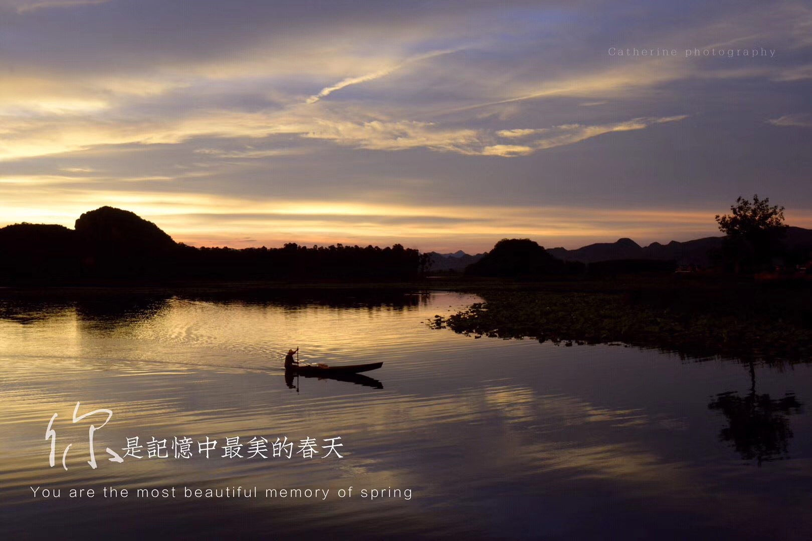 普者黑湖在夕阳晚霜的映照下色彩斑斓。